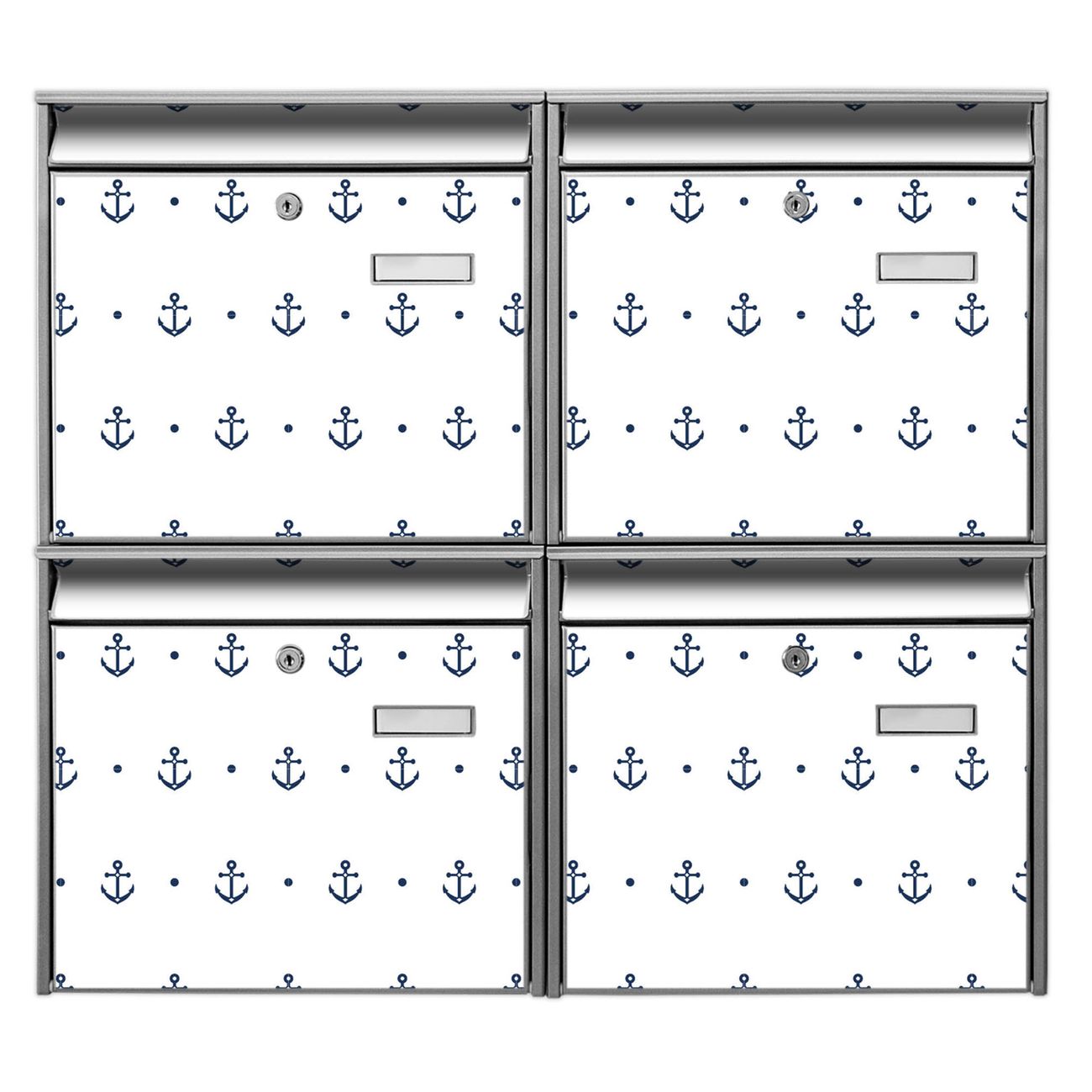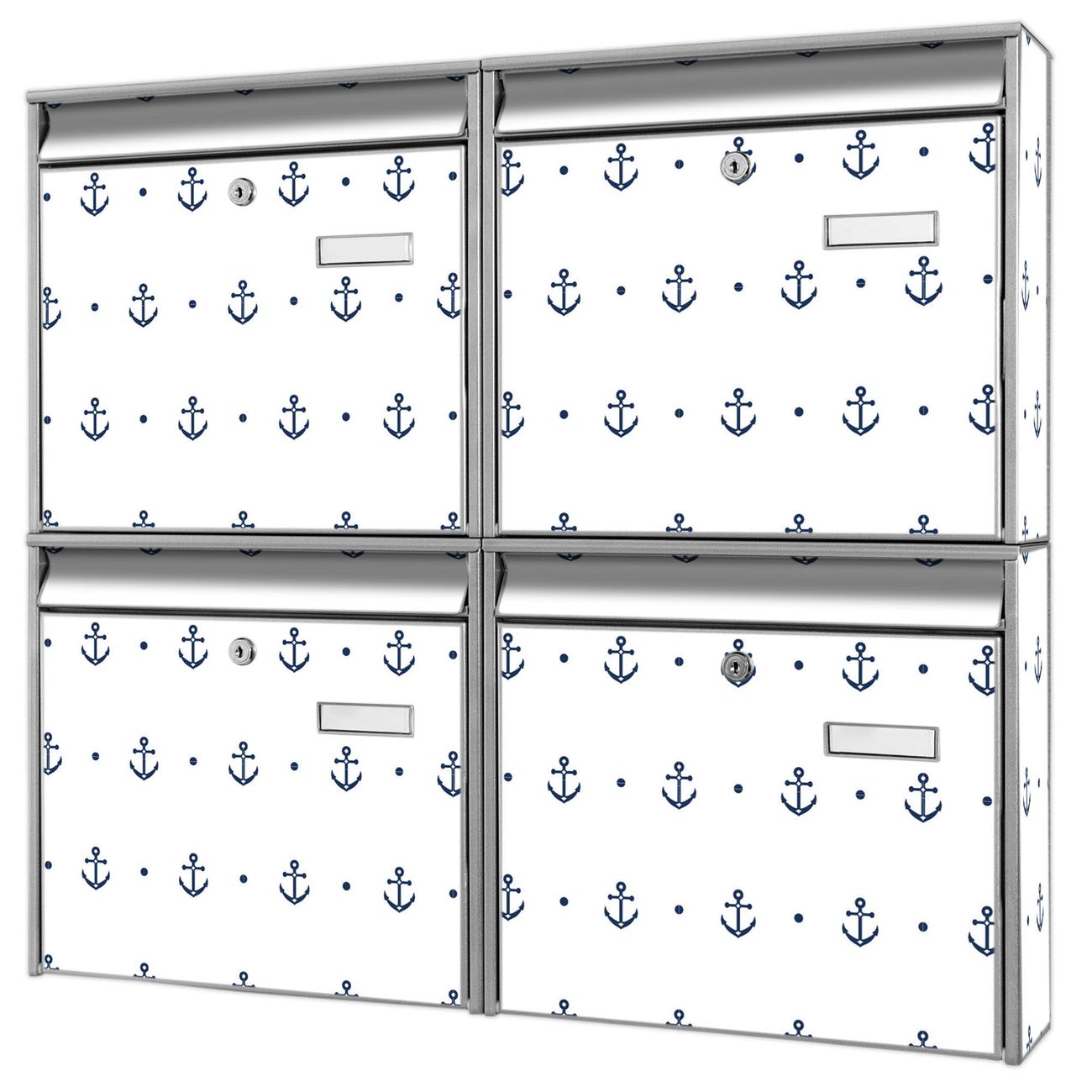 FUNKTION: Die Burg-Wächter Briefkastenanlage mit Motiv Kleine Anker bietet Ihnen ausreichend Fassungsvermögen um auch A4 und C4 Sendungen zu empfangen. Das integrierte Namensschild lässt sich individuell beschriften. Wählen Sie aus den Grundfarben weiß, silber und schwarz. DESIGN: Die 4 Briefkästen haben ein ansprechendes und zeitloses Design, ohne dabei auf Funktionalität zu verzichten. Das Material ist sehr stabil, wetterfest und rostfrei. Durch das Motiv Kleine Anker werden die Postkästen zu einem Blickfang. DETAILS: Die Postkästen bestehen aus verzinktem Stahl der zusätzlich mit Klarlack versiegelt wurde. Die Kästen sind gesamt 64,5cm hoch, 72,5cm breit und 10cm tief. Das Motiv besteht aus einer wetter- und UV-festen Folie, die Ihren Briefkasten zusätzlich vor Kratzern schützt. Die Postkästen werden mit Montagematerial, je einem Namensschild und je zwei Schlüsseln geliefert. NUTZEN: Das Briefkastenset eignet sich für die Wandmontage, die Größe bietet genügend Platz für Sendungen aller Art. Das zeitlose Design sowie die stabile Bauart bieten Ihnen einen treuen Begleiter für Ihre Post. BANJADO:
