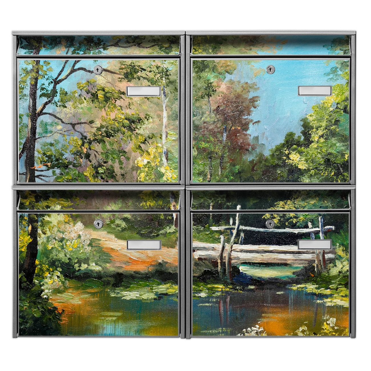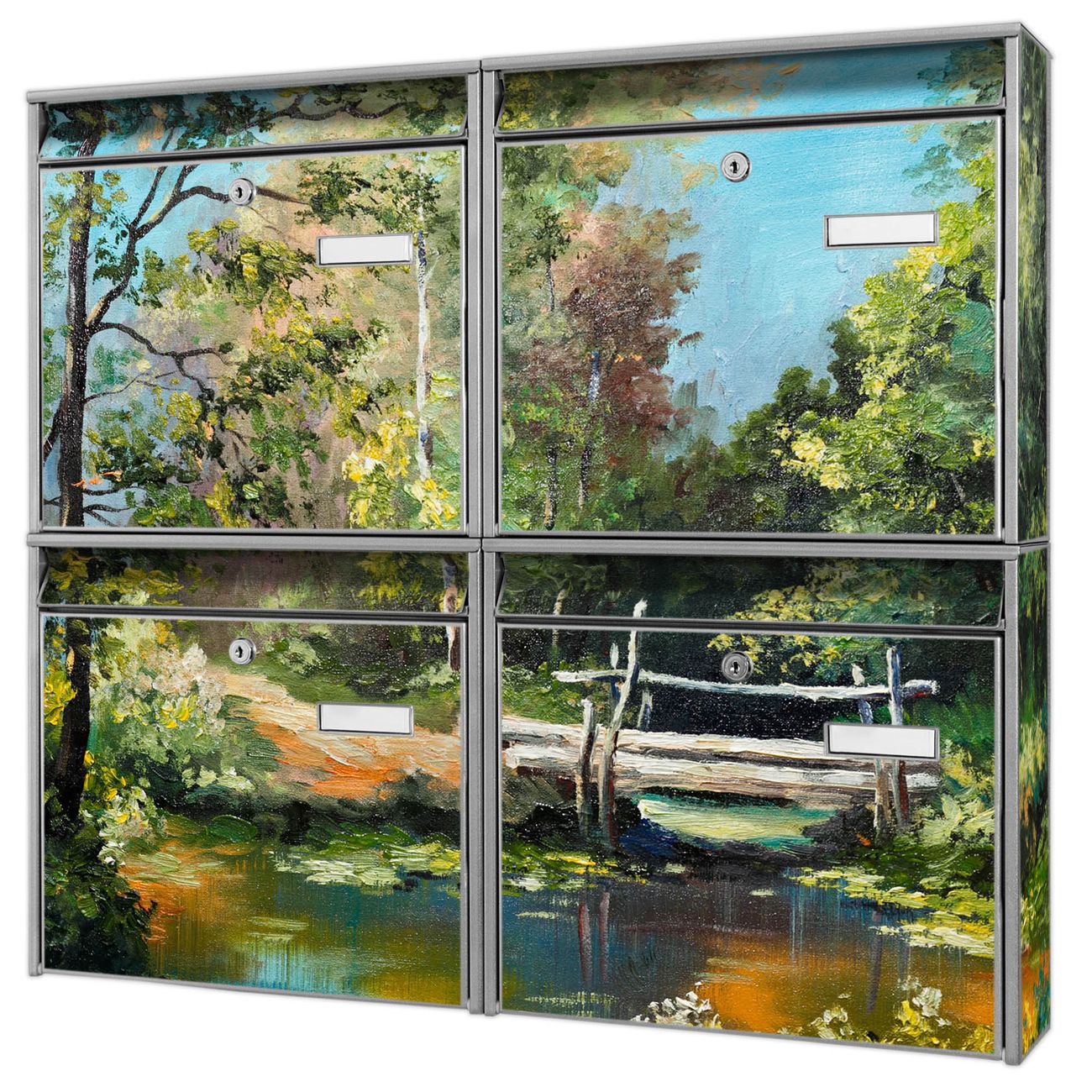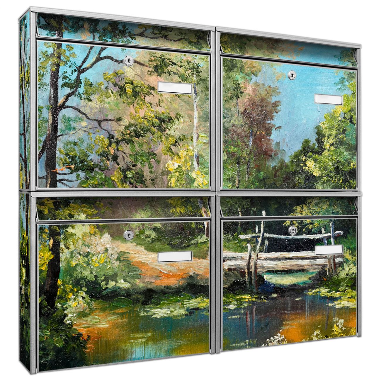 FUNKTION: Die Burg-Wächter Briefkastenanlage mit Motiv Kleine Brücke bietet Ihnen ausreichend Fassungsvermögen um auch A4 und C4 Sendungen zu empfangen. Das integrierte Namensschild lässt sich individuell beschriften. Wählen Sie aus den Grundfarben weiß, silber und schwarz. DESIGN: Die 4 Briefkästen haben ein ansprechendes und zeitloses Design, ohne dabei auf Funktionalität zu verzichten. Das Material ist sehr stabil, wetterfest und rostfrei. Durch das Motiv Kleine Brücke werden die Postkästen zu einem Blickfang. DETAILS: Die Postkästen bestehen aus verzinktem Stahl der zusätzlich mit Klarlack versiegelt wurde. Die Kästen sind gesamt 64,5cm hoch, 72,5cm breit und 10cm tief. Das Motiv besteht aus einer wetter- und UV-festen Folie, die Ihren Briefkasten zusätzlich vor Kratzern schützt. Die Postkästen werden mit Montagematerial, je einem Namensschild und je zwei Schlüsseln geliefert. NUTZEN: Das Briefkastenset eignet sich für die Wandmontage, die Größe bietet genügend Platz für Sendungen aller Art. Das zeitlose Design sowie die stabile Bauart bieten Ihnen einen treuen Begleiter für Ihre Post. BANJADO: