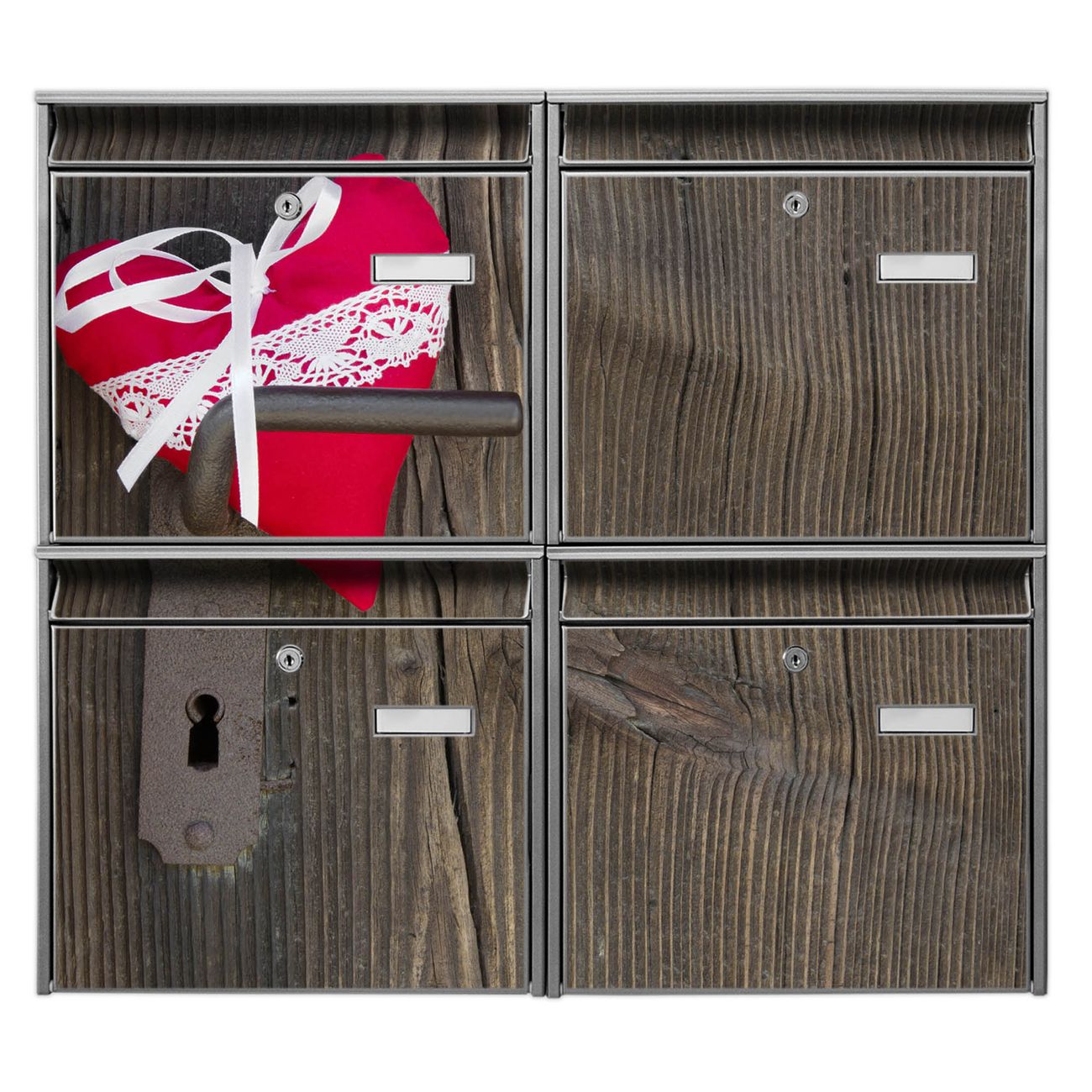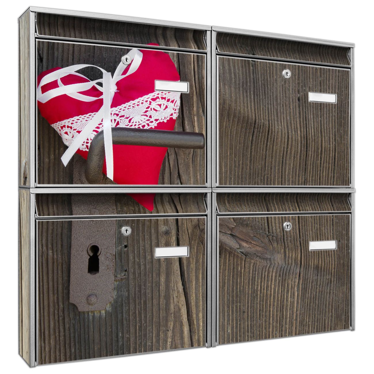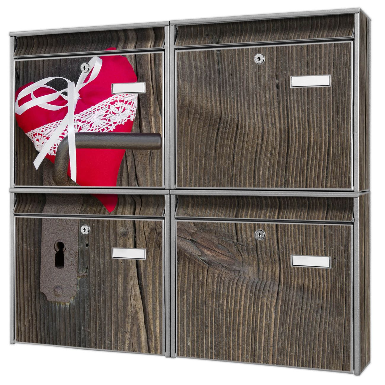 FUNKTION: Die Burg-Wächter Briefkastenanlage mit Motiv Knock On Your Door bietet Ihnen ausreichend Fassungsvermögen um auch A4 und C4 Sendungen zu empfangen. Das integrierte Namensschild lässt sich individuell beschriften. Wählen Sie aus den Grundfarben weiß, silber und schwarz. DESIGN: Die 4 Briefkästen haben ein ansprechendes und zeitloses Design, ohne dabei auf Funktionalität zu verzichten. Das Material ist sehr stabil, wetterfest und rostfrei. Durch das Motiv Knock On Your Door werden die Postkästen zu einem Blickfang. DETAILS: Die Postkästen bestehen aus verzinktem Stahl der zusätzlich mit Klarlack versiegelt wurde. Die Kästen sind gesamt 64,5cm hoch, 72,5cm breit und 10cm tief. Das Motiv besteht aus einer wetter- und UV-festen Folie, die Ihren Briefkasten zusätzlich vor Kratzern schützt. Die Postkästen werden mit Montagematerial, je einem Namensschild und je zwei Schlüsseln geliefert. NUTZEN: Das Briefkastenset eignet sich für die Wandmontage, die Größe bietet genügend Platz für Sendungen aller Art. Das zeitlose Design sowie die stabile Bauart bieten Ihnen einen treuen Begleiter für Ihre Post. BANJADO: