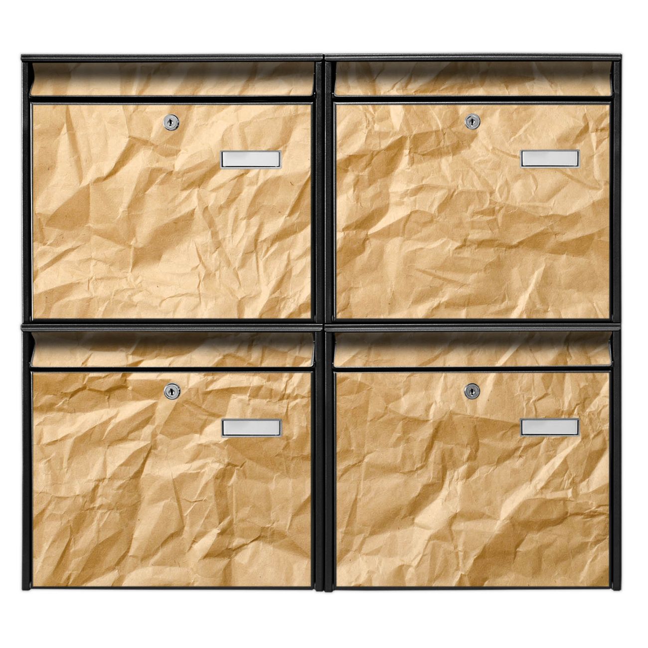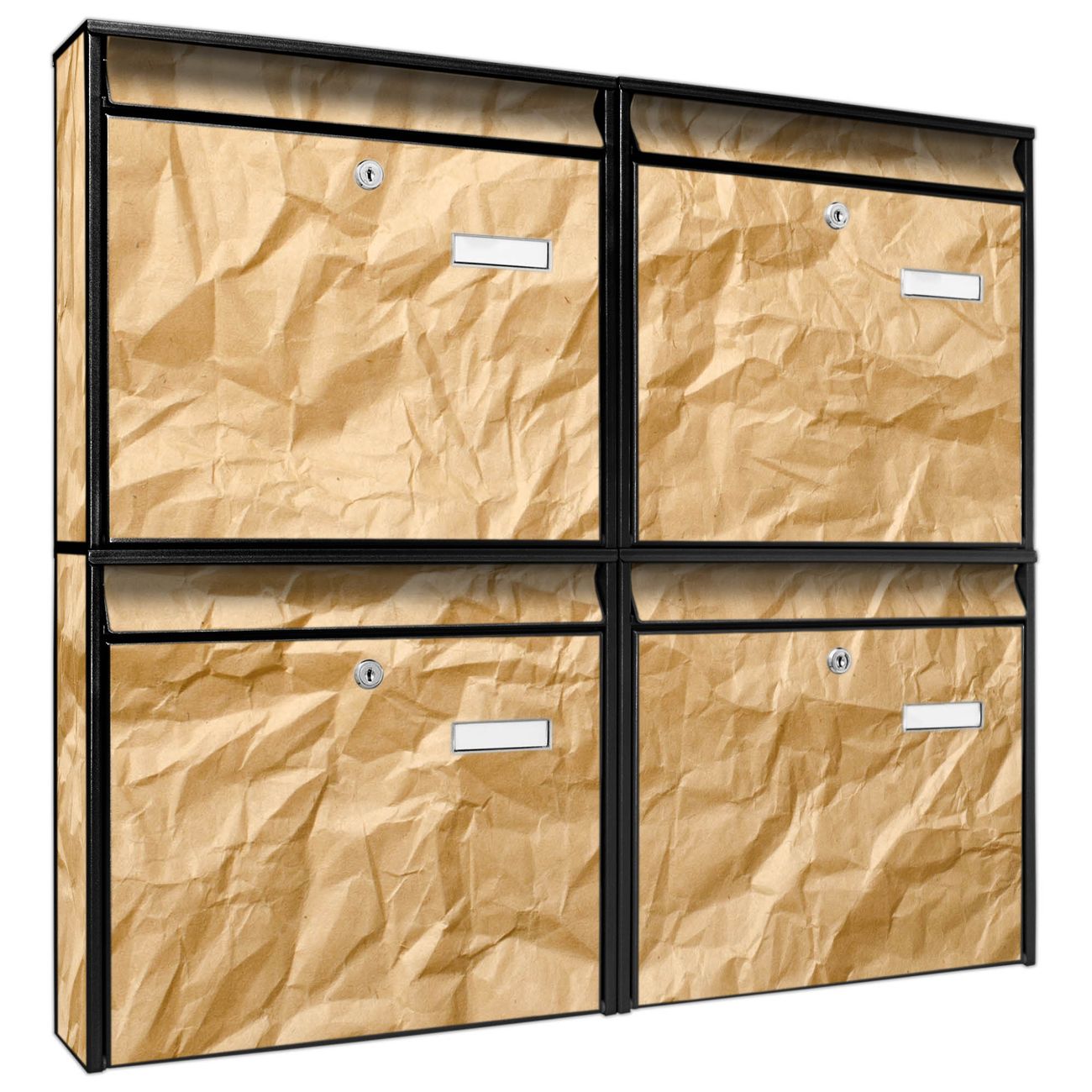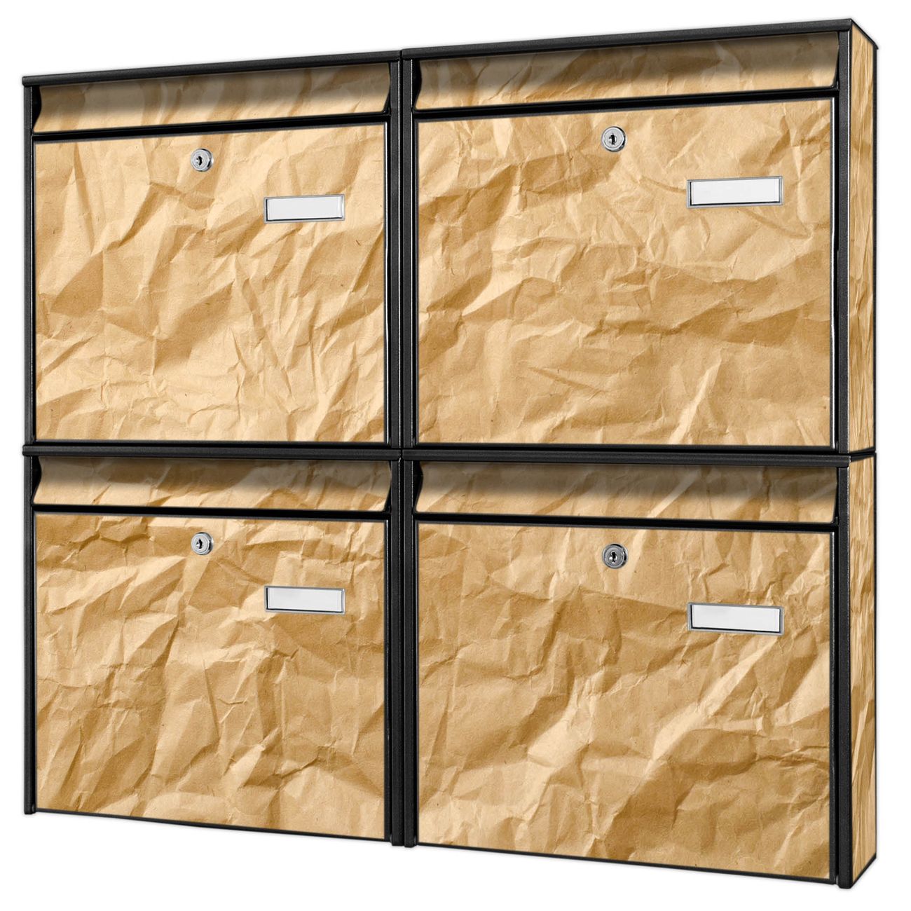 FUNKTION: Die Burg-Wächter Briefkastenanlage mit Motiv Knüllpapier bietet Ihnen ausreichend Fassungsvermögen um auch A4 und C4 Sendungen zu empfangen. Das integrierte Namensschild lässt sich individuell beschriften. Wählen Sie aus den Grundfarben weiß, silber und schwarz. DESIGN: Die 4 Briefkästen haben ein ansprechendes und zeitloses Design, ohne dabei auf Funktionalität zu verzichten. Das Material ist sehr stabil, wetterfest und rostfrei. Durch das Motiv Knüllpapier werden die Postkästen zu einem Blickfang. DETAILS: Die Postkästen bestehen aus verzinktem Stahl der zusätzlich mit Klarlack versiegelt wurde. Die Kästen sind gesamt 64,5cm hoch, 72,5cm breit und 10cm tief. Das Motiv besteht aus einer wetter- und UV-festen Folie, die Ihren Briefkasten zusätzlich vor Kratzern schützt. Die Postkästen werden mit Montagematerial, je einem Namensschild und je zwei Schlüsseln geliefert. NUTZEN: Das Briefkastenset eignet sich für die Wandmontage, die Größe bietet genügend Platz für Sendungen aller Art. Das zeitlose Design sowie die stabile Bauart bieten Ihnen einen treuen Begleiter für Ihre Post. BANJADO: