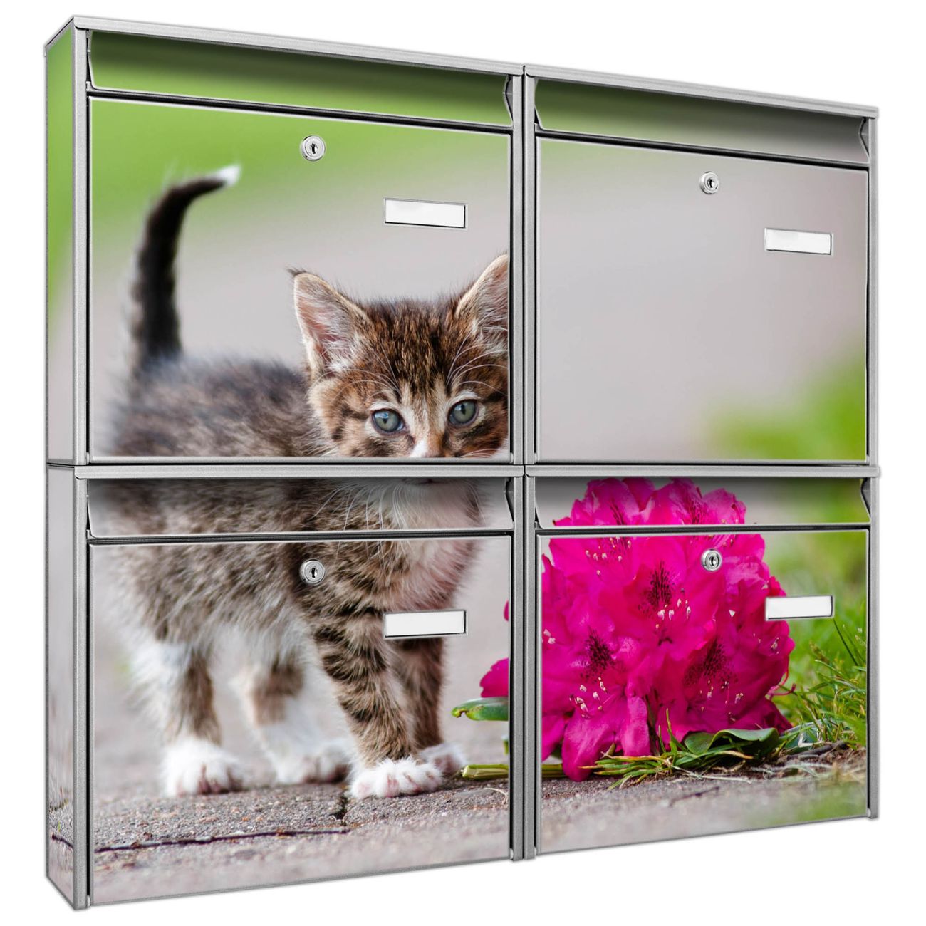 FUNKTION: Die Burg-Wächter Briefkastenanlage mit Motiv Knut bietet Ihnen ausreichend Fassungsvermögen um auch A4 und C4 Sendungen zu empfangen. Das integrierte Namensschild lässt sich individuell beschriften. Wählen Sie aus den Grundfarben weiß, silber und schwarz. DESIGN: Die 4 Briefkästen haben ein ansprechendes und zeitloses Design, ohne dabei auf Funktionalität zu verzichten. Das Material ist sehr stabil, wetterfest und rostfrei. Durch das Motiv Knut werden die Postkästen zu einem Blickfang. DETAILS: Die Postkästen bestehen aus verzinktem Stahl der zusätzlich mit Klarlack versiegelt wurde. Die Kästen sind gesamt 64,5cm hoch, 72,5cm breit und 10cm tief. Das Motiv besteht aus einer wetter- und UV-festen Folie, die Ihren Briefkasten zusätzlich vor Kratzern schützt. Die Postkästen werden mit Montagematerial, je einem Namensschild und je zwei Schlüsseln geliefert. NUTZEN: Das Briefkastenset eignet sich für die Wandmontage, die Größe bietet genügend Platz für Sendungen aller Art. Das zeitlose Design sowie die stabile Bauart bieten Ihnen einen treuen Begleiter für Ihre Post. BANJADO: