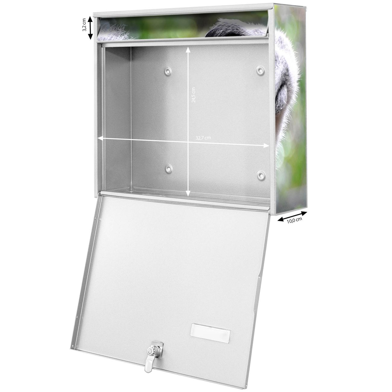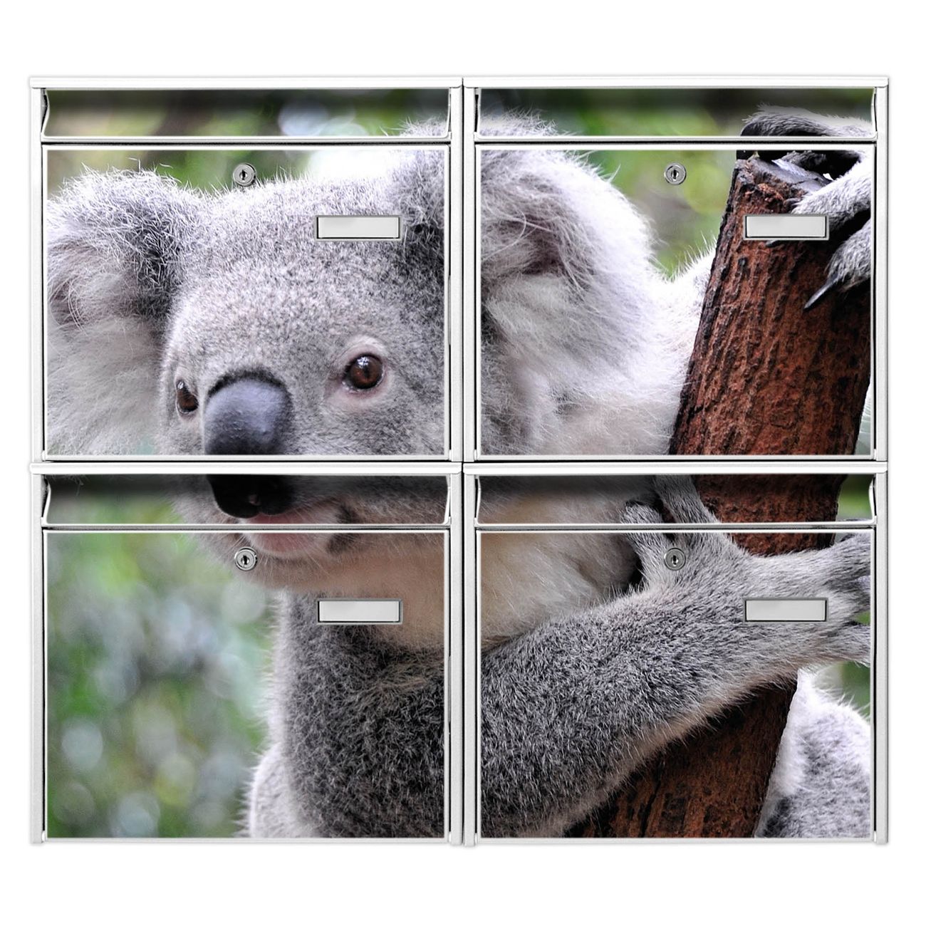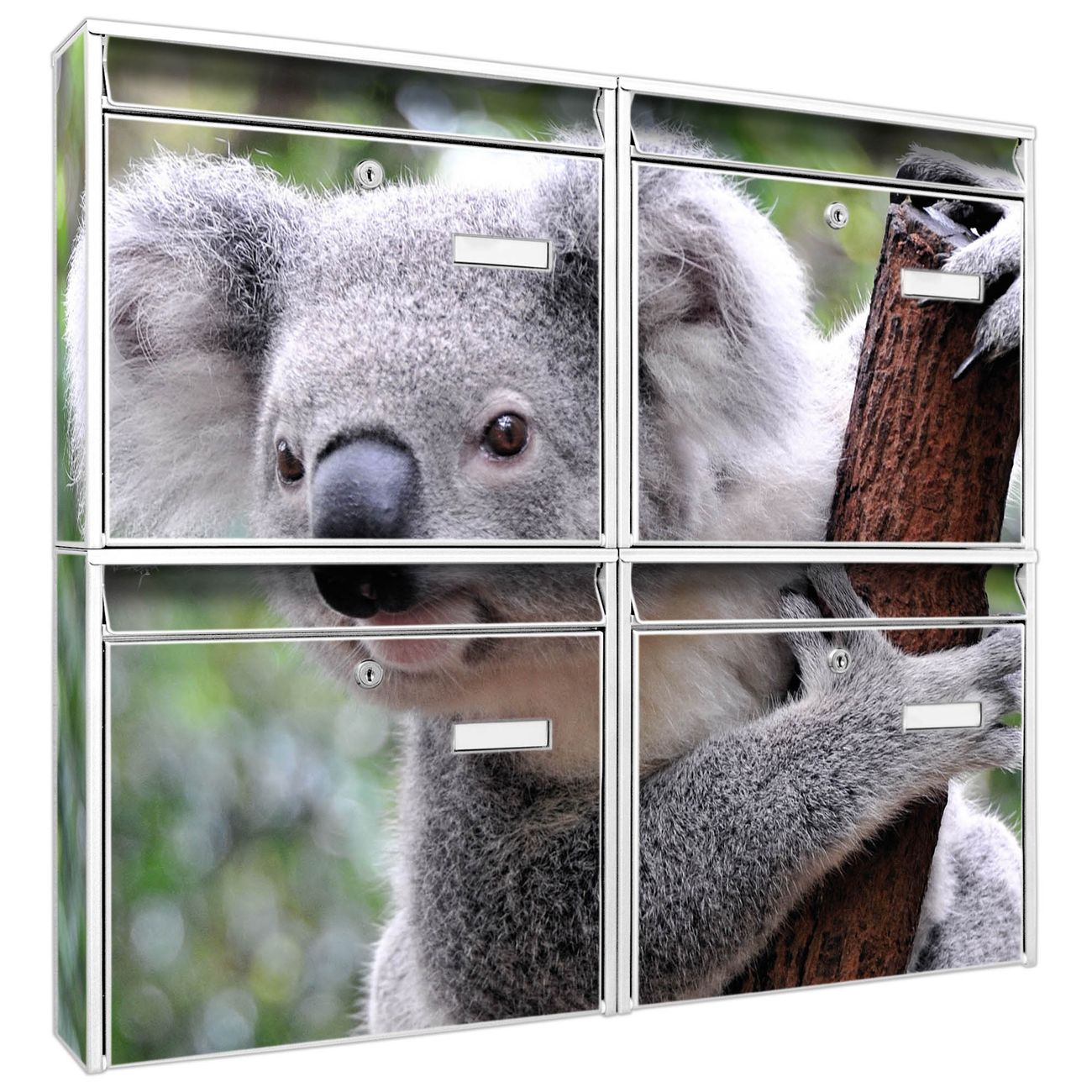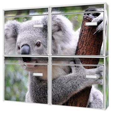 FUNKTION: Die Burg-Wächter Briefkastenanlage mit Motiv Koala bietet Ihnen ausreichend Fassungsvermögen um auch A4 und C4 Sendungen zu empfangen. Das integrierte Namensschild lässt sich individuell beschriften. Wählen Sie aus den Grundfarben weiß, silber und schwarz. DESIGN: Die 4 Briefkästen haben ein ansprechendes und zeitloses Design, ohne dabei auf Funktionalität zu verzichten. Das Material ist sehr stabil, wetterfest und rostfrei. Durch das Motiv Koala werden die Postkästen zu einem Blickfang. DETAILS: Die Postkästen bestehen aus verzinktem Stahl der zusätzlich mit Klarlack versiegelt wurde. Die Kästen sind gesamt 64,5cm hoch, 72,5cm breit und 10cm tief. Das Motiv besteht aus einer wetter- und UV-festen Folie, die Ihren Briefkasten zusätzlich vor Kratzern schützt. Die Postkästen werden mit Montagematerial, je einem Namensschild und je zwei Schlüsseln geliefert. NUTZEN: Das Briefkastenset eignet sich für die Wandmontage, die Größe bietet genügend Platz für Sendungen aller Art. Das zeitlose Design sowie die stabile Bauart bieten Ihnen einen treuen Begleiter für Ihre Post. BANJADO: