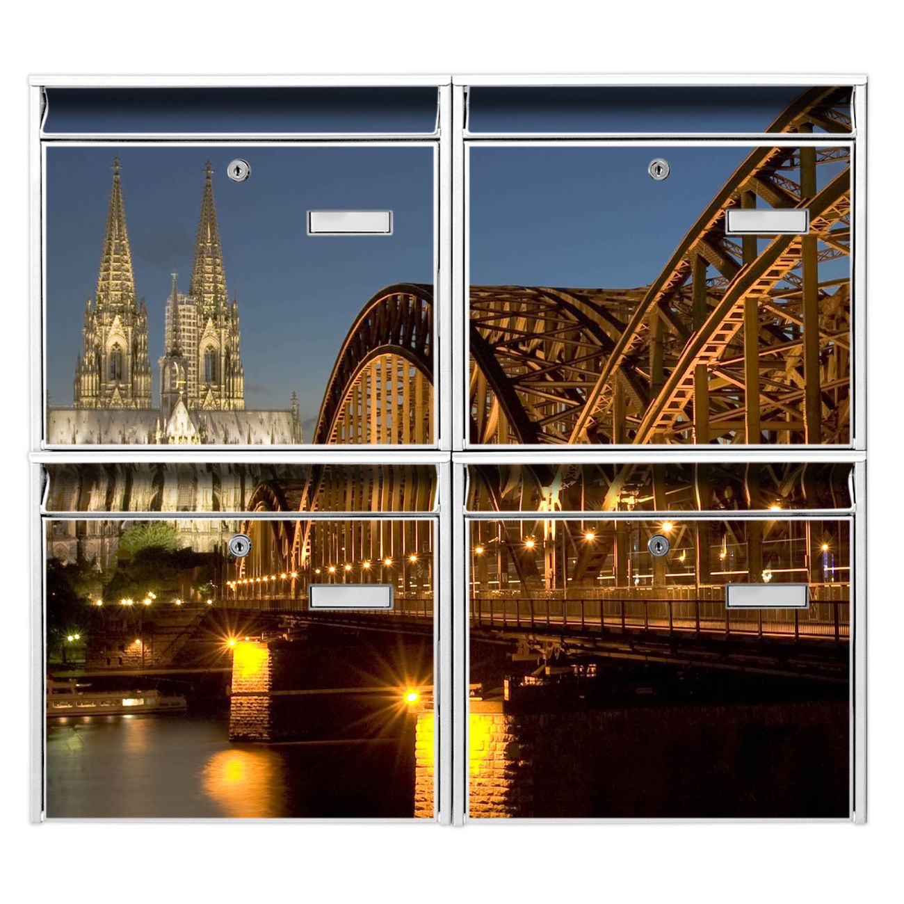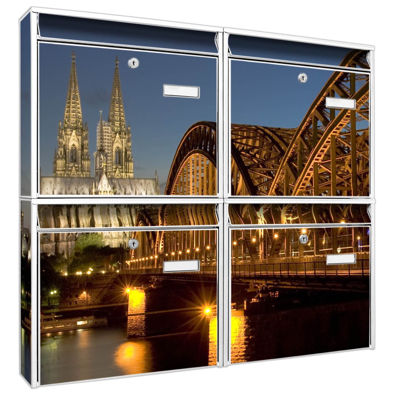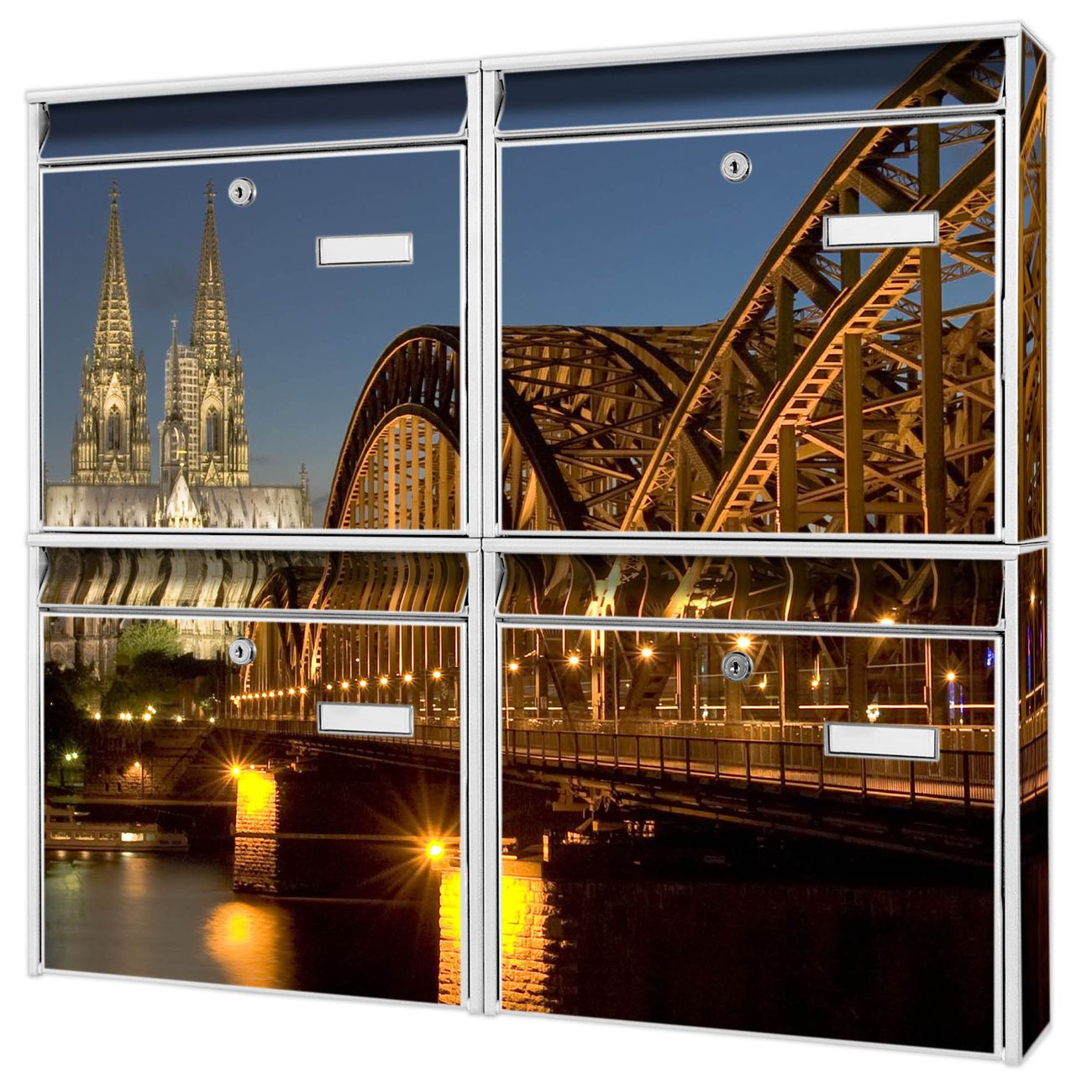FUNKTION: Die Burg-Wächter Briefkastenanlage mit Motiv Köln bietet Ihnen ausreichend Fassungsvermögen um auch A4 und C4 Sendungen zu empfangen. Das integrierte Namensschild lässt sich individuell beschriften. Wählen Sie aus den Grundfarben weiß, silber und schwarz. DESIGN: Die 4 Briefkästen haben ein ansprechendes und zeitloses Design, ohne dabei auf Funktionalität zu verzichten. Das Material ist sehr stabil, wetterfest und rostfrei. Durch das Motiv Köln werden die Postkästen zu einem Blickfang. DETAILS: Die Postkästen bestehen aus verzinktem Stahl der zusätzlich mit Klarlack versiegelt wurde. Die Kästen sind gesamt 64,5cm hoch, 72,5cm breit und 10cm tief. Das Motiv besteht aus einer wetter- und UV-festen Folie, die Ihren Briefkasten zusätzlich vor Kratzern schützt. Die Postkästen werden mit Montagematerial, je einem Namensschild und je zwei Schlüsseln geliefert. NUTZEN: Das Briefkastenset eignet sich für die Wandmontage, die Größe bietet genügend Platz für Sendungen aller Art. Das zeitlose Design sowie die stabile Bauart bieten Ihnen einen treuen Begleiter für Ihre Post. BANJADO: