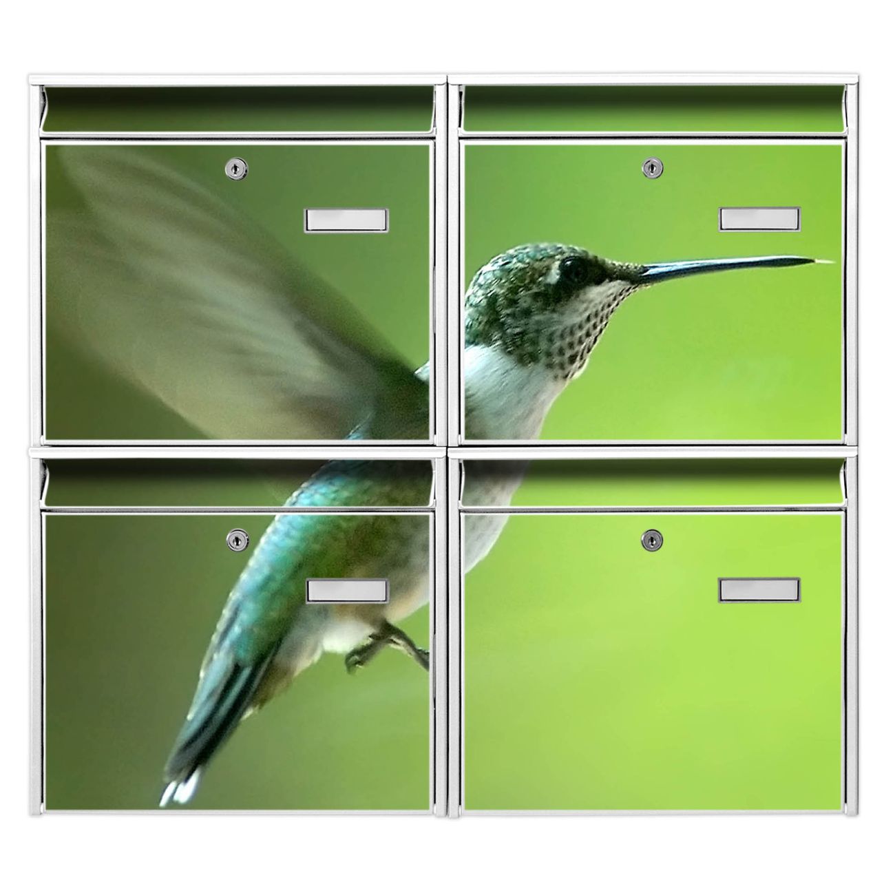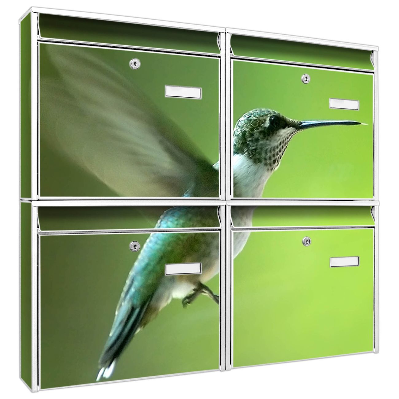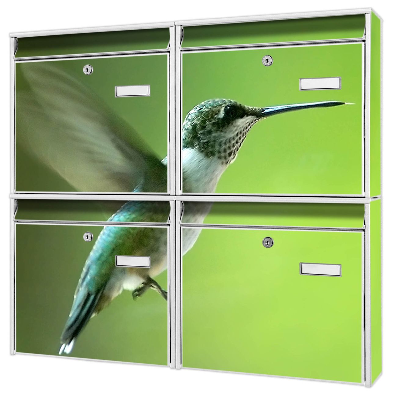 FUNKTION: Die Burg-Wächter Briefkastenanlage mit Motiv Kolibri bietet Ihnen ausreichend Fassungsvermögen um auch A4 und C4 Sendungen zu empfangen. Das integrierte Namensschild lässt sich individuell beschriften. Wählen Sie aus den Grundfarben weiß, silber und schwarz. DESIGN: Die 4 Briefkästen haben ein ansprechendes und zeitloses Design, ohne dabei auf Funktionalität zu verzichten. Das Material ist sehr stabil, wetterfest und rostfrei. Durch das Motiv Kolibri werden die Postkästen zu einem Blickfang. DETAILS: Die Postkästen bestehen aus verzinktem Stahl der zusätzlich mit Klarlack versiegelt wurde. Die Kästen sind gesamt 64,5cm hoch, 72,5cm breit und 10cm tief. Das Motiv besteht aus einer wetter- und UV-festen Folie, die Ihren Briefkasten zusätzlich vor Kratzern schützt. Die Postkästen werden mit Montagematerial, je einem Namensschild und je zwei Schlüsseln geliefert. NUTZEN: Das Briefkastenset eignet sich für die Wandmontage, die Größe bietet genügend Platz für Sendungen aller Art. Das zeitlose Design sowie die stabile Bauart bieten Ihnen einen treuen Begleiter für Ihre Post. BANJADO: