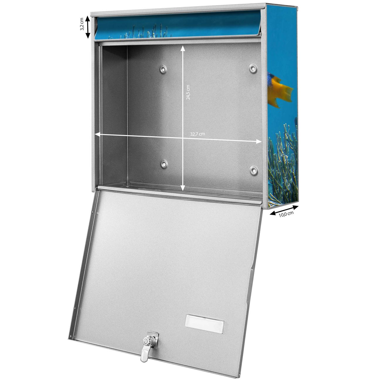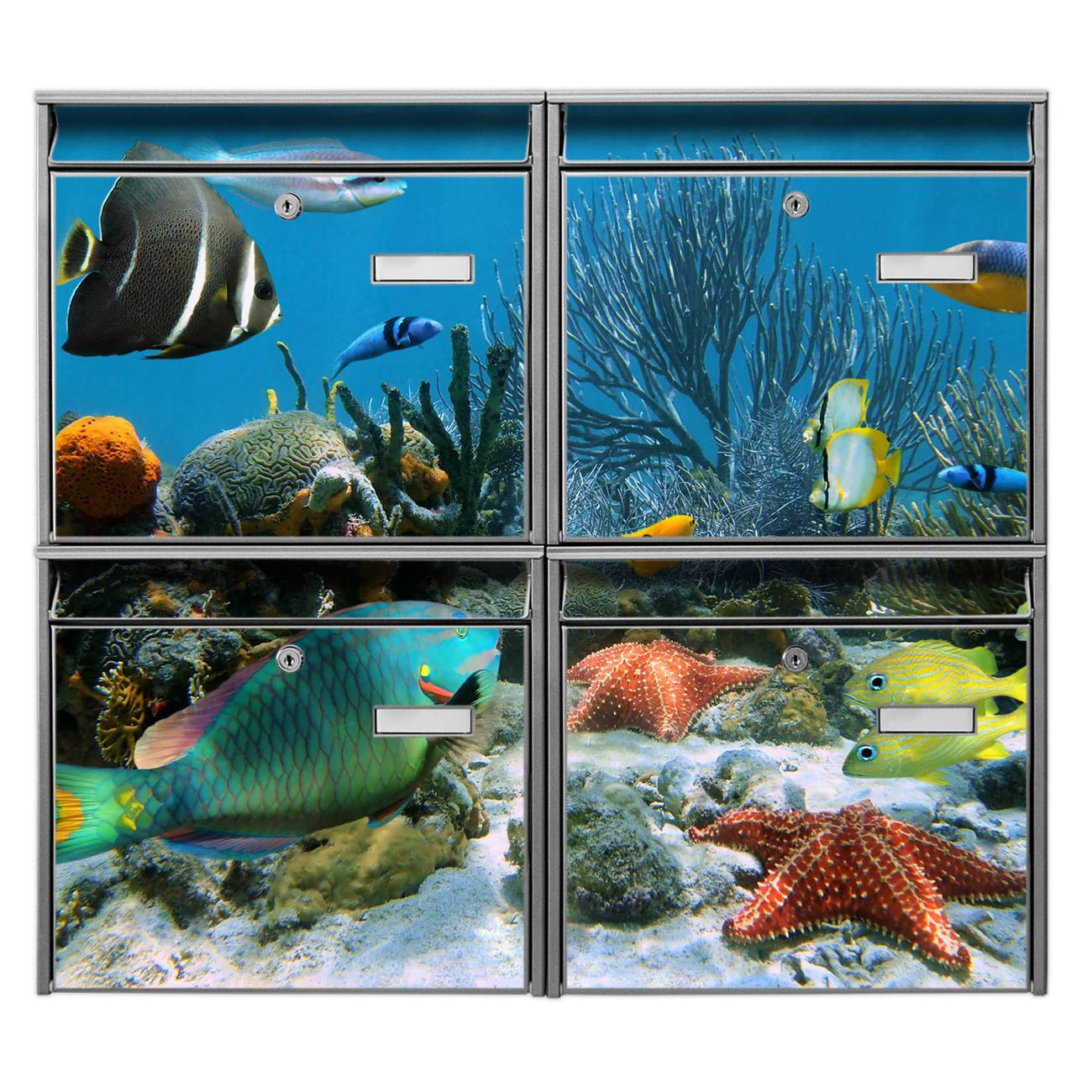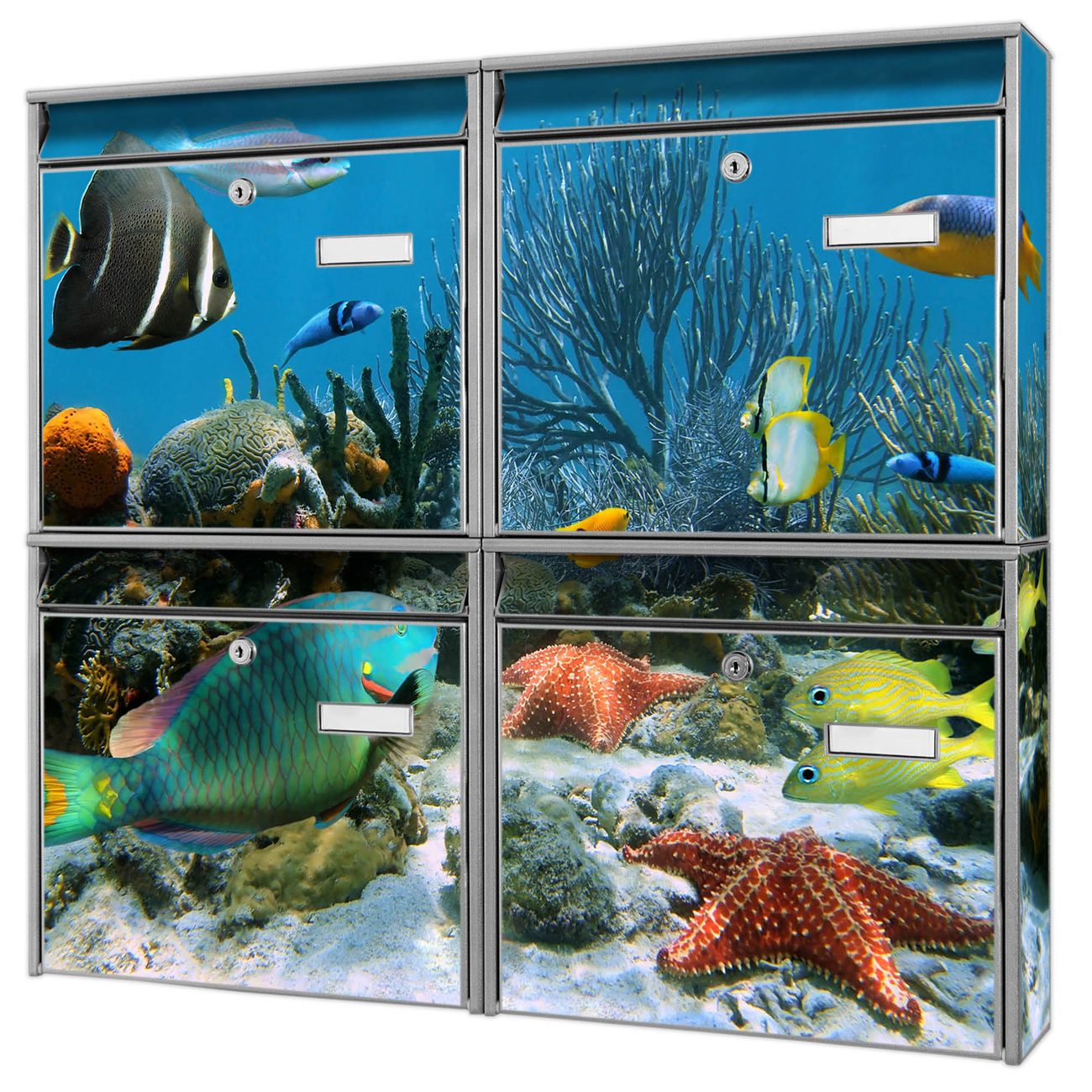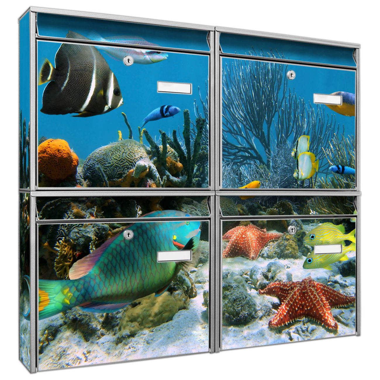 FUNKTION: Die Burg-Wächter Briefkastenanlage mit Motiv Korallenriff 1 bietet Ihnen ausreichend Fassungsvermögen um auch A4 und C4 Sendungen zu empfangen. Das integrierte Namensschild lässt sich individuell beschriften. Wählen Sie aus den Grundfarben weiß, silber und schwarz. DESIGN: Die 4 Briefkästen haben ein ansprechendes und zeitloses Design, ohne dabei auf Funktionalität zu verzichten. Das Material ist sehr stabil, wetterfest und rostfrei. Durch das Motiv Korallenriff 1 werden die Postkästen zu einem Blickfang. DETAILS: Die Postkästen bestehen aus verzinktem Stahl der zusätzlich mit Klarlack versiegelt wurde. Die Kästen sind gesamt 64,5cm hoch, 72,5cm breit und 10cm tief. Das Motiv besteht aus einer wetter- und UV-festen Folie, die Ihren Briefkasten zusätzlich vor Kratzern schützt. Die Postkästen werden mit Montagematerial, je einem Namensschild und je zwei Schlüsseln geliefert. NUTZEN: Das Briefkastenset eignet sich für die Wandmontage, die Größe bietet genügend Platz für Sendungen aller Art. Das zeitlose Design sowie die stabile Bauart bieten Ihnen einen treuen Begleiter für Ihre Post. BANJADO: