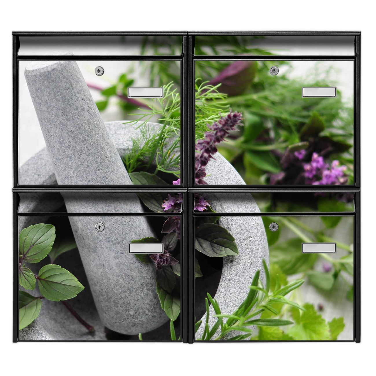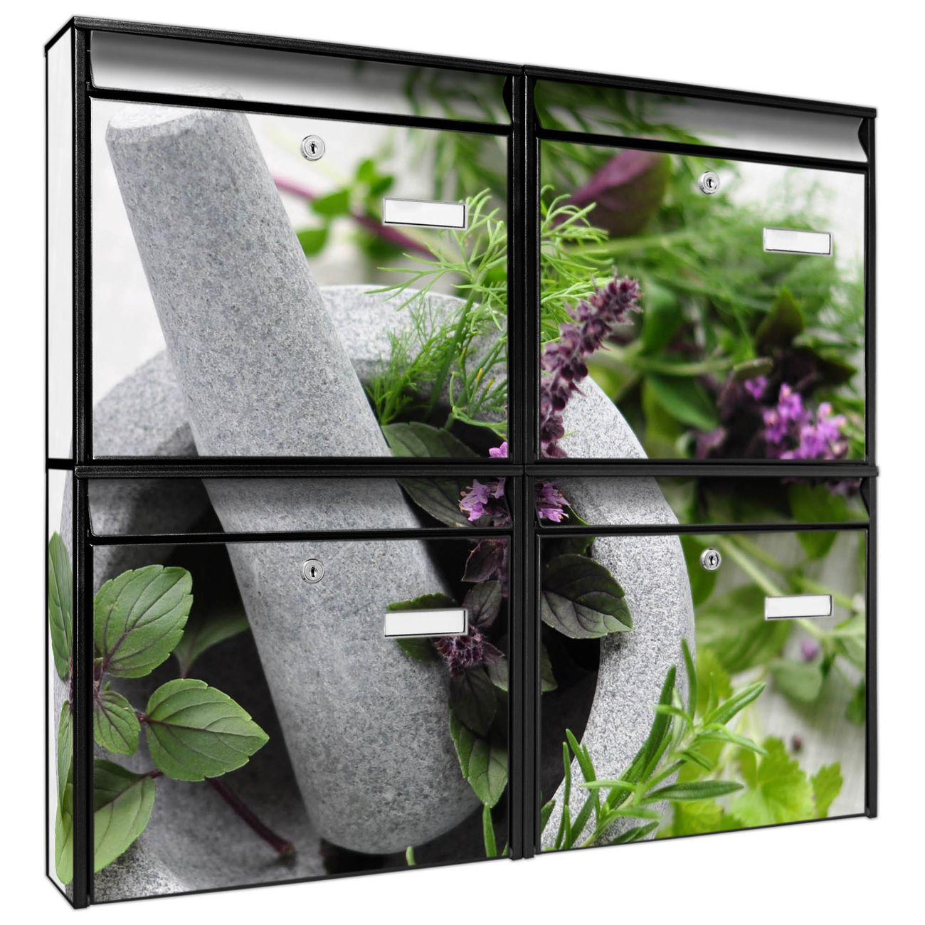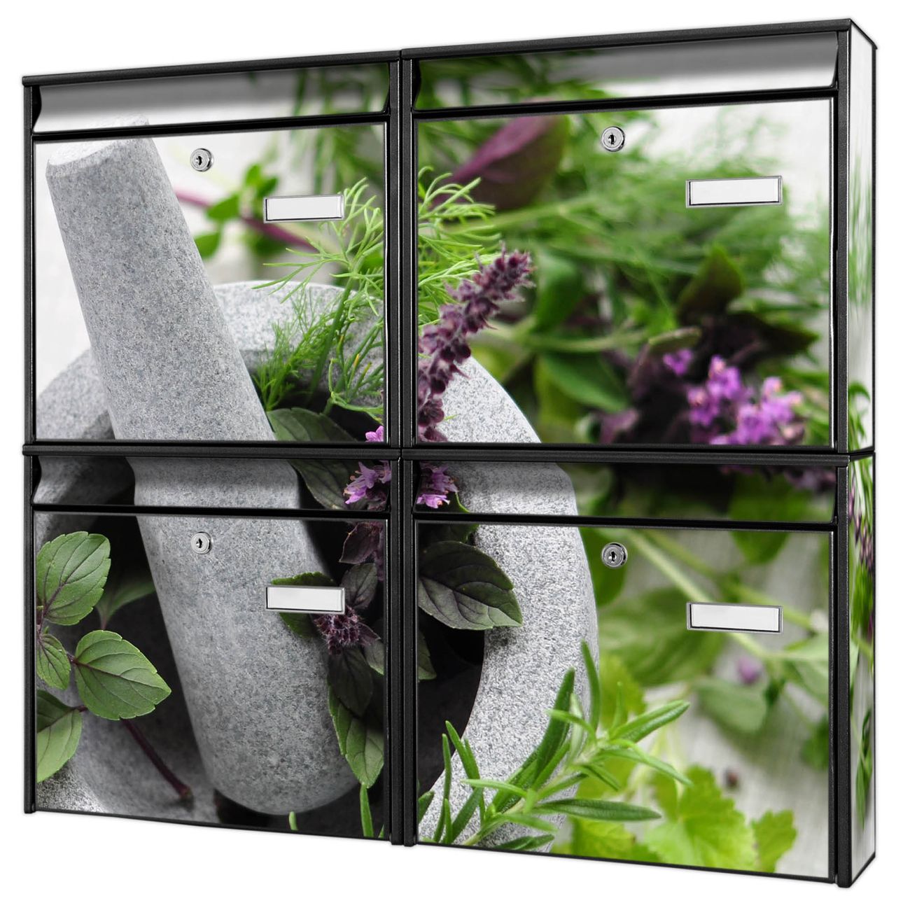 FUNKTION: Die Burg-Wächter Briefkastenanlage mit Motiv Kräuter bietet Ihnen ausreichend Fassungsvermögen um auch A4 und C4 Sendungen zu empfangen. Das integrierte Namensschild lässt sich individuell beschriften. Wählen Sie aus den Grundfarben weiß, silber und schwarz. DESIGN: Die 4 Briefkästen haben ein ansprechendes und zeitloses Design, ohne dabei auf Funktionalität zu verzichten. Das Material ist sehr stabil, wetterfest und rostfrei. Durch das Motiv Kräuter werden die Postkästen zu einem Blickfang. DETAILS: Die Postkästen bestehen aus verzinktem Stahl der zusätzlich mit Klarlack versiegelt wurde. Die Kästen sind gesamt 64,5cm hoch, 72,5cm breit und 10cm tief. Das Motiv besteht aus einer wetter- und UV-festen Folie, die Ihren Briefkasten zusätzlich vor Kratzern schützt. Die Postkästen werden mit Montagematerial, je einem Namensschild und je zwei Schlüsseln geliefert. NUTZEN: Das Briefkastenset eignet sich für die Wandmontage, die Größe bietet genügend Platz für Sendungen aller Art. Das zeitlose Design sowie die stabile Bauart bieten Ihnen einen treuen Begleiter für Ihre Post. BANJADO: