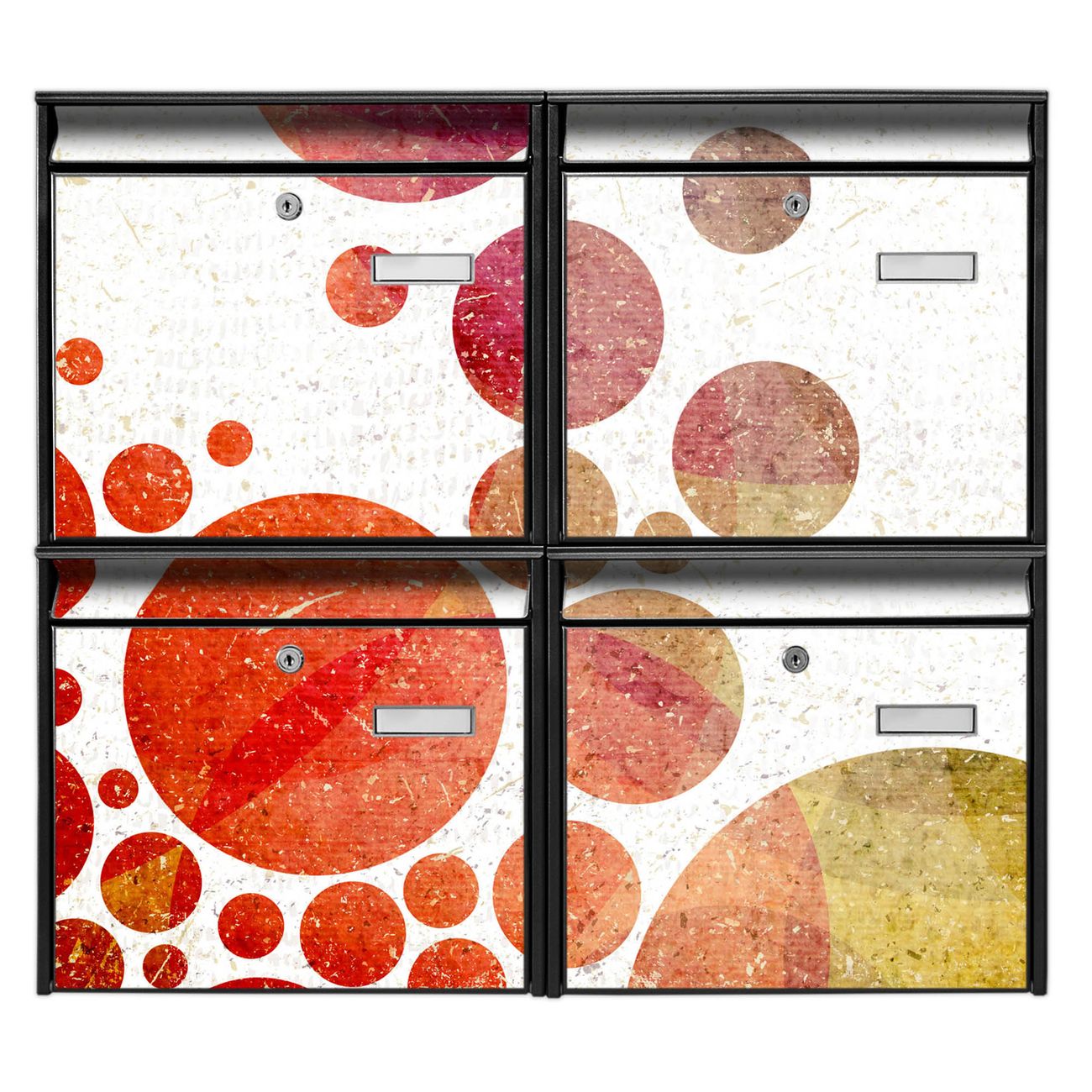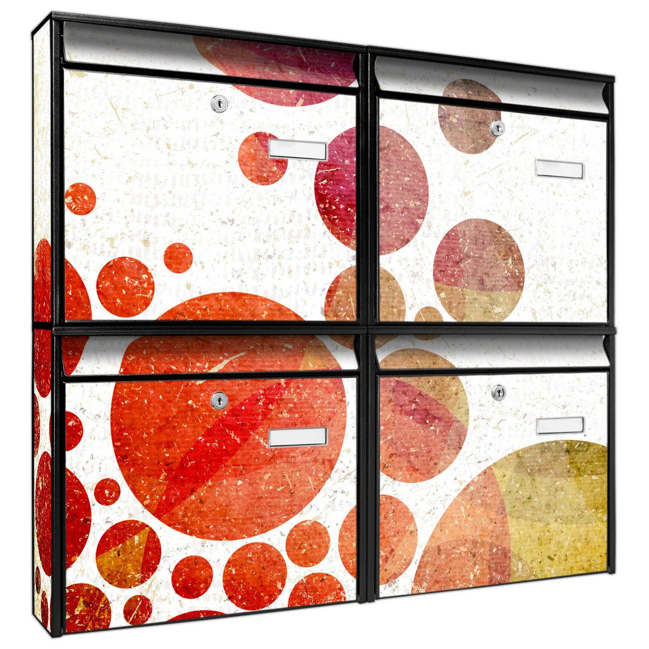 FUNKTION: Die Burg-Wächter Briefkastenanlage mit Motiv Kreise bietet Ihnen ausreichend Fassungsvermögen um auch A4 und C4 Sendungen zu empfangen. Das integrierte Namensschild lässt sich individuell beschriften. Wählen Sie aus den Grundfarben weiß, silber und schwarz. DESIGN: Die 4 Briefkästen haben ein ansprechendes und zeitloses Design, ohne dabei auf Funktionalität zu verzichten. Das Material ist sehr stabil, wetterfest und rostfrei. Durch das Motiv Kreise werden die Postkästen zu einem Blickfang. DETAILS: Die Postkästen bestehen aus verzinktem Stahl der zusätzlich mit Klarlack versiegelt wurde. Die Kästen sind gesamt 64,5cm hoch, 72,5cm breit und 10cm tief. Das Motiv besteht aus einer wetter- und UV-festen Folie, die Ihren Briefkasten zusätzlich vor Kratzern schützt. Die Postkästen werden mit Montagematerial, je einem Namensschild und je zwei Schlüsseln geliefert. NUTZEN: Das Briefkastenset eignet sich für die Wandmontage, die Größe bietet genügend Platz für Sendungen aller Art. Das zeitlose Design sowie die stabile Bauart bieten Ihnen einen treuen Begleiter für Ihre Post. BANJADO: