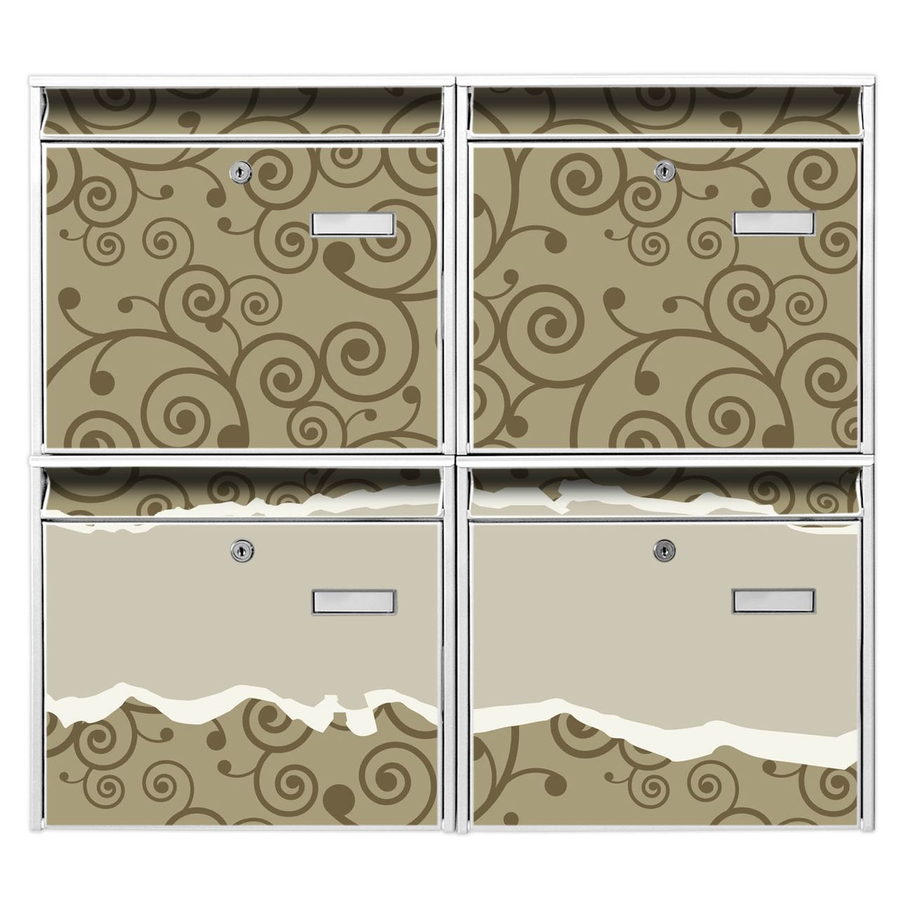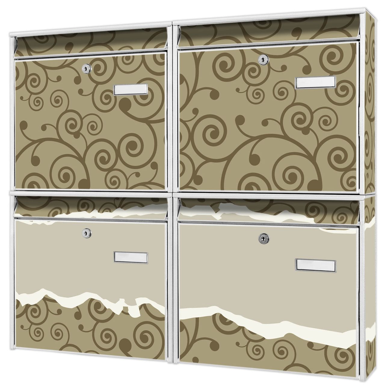 FUNKTION: Die Burg-Wächter Briefkastenanlage mit Motiv Kringel bietet Ihnen ausreichend Fassungsvermögen um auch A4 und C4 Sendungen zu empfangen. Das integrierte Namensschild lässt sich individuell beschriften. Wählen Sie aus den Grundfarben weiß, silber und schwarz. DESIGN: Die 4 Briefkästen haben ein ansprechendes und zeitloses Design, ohne dabei auf Funktionalität zu verzichten. Das Material ist sehr stabil, wetterfest und rostfrei. Durch das Motiv Kringel werden die Postkästen zu einem Blickfang. DETAILS: Die Postkästen bestehen aus verzinktem Stahl der zusätzlich mit Klarlack versiegelt wurde. Die Kästen sind gesamt 64,5cm hoch, 72,5cm breit und 10cm tief. Das Motiv besteht aus einer wetter- und UV-festen Folie, die Ihren Briefkasten zusätzlich vor Kratzern schützt. Die Postkästen werden mit Montagematerial, je einem Namensschild und je zwei Schlüsseln geliefert. NUTZEN: Das Briefkastenset eignet sich für die Wandmontage, die Größe bietet genügend Platz für Sendungen aller Art. Das zeitlose Design sowie die stabile Bauart bieten Ihnen einen treuen Begleiter für Ihre Post. BANJADO: