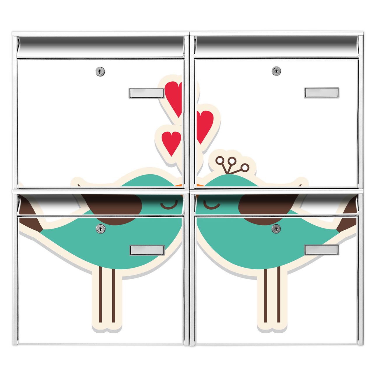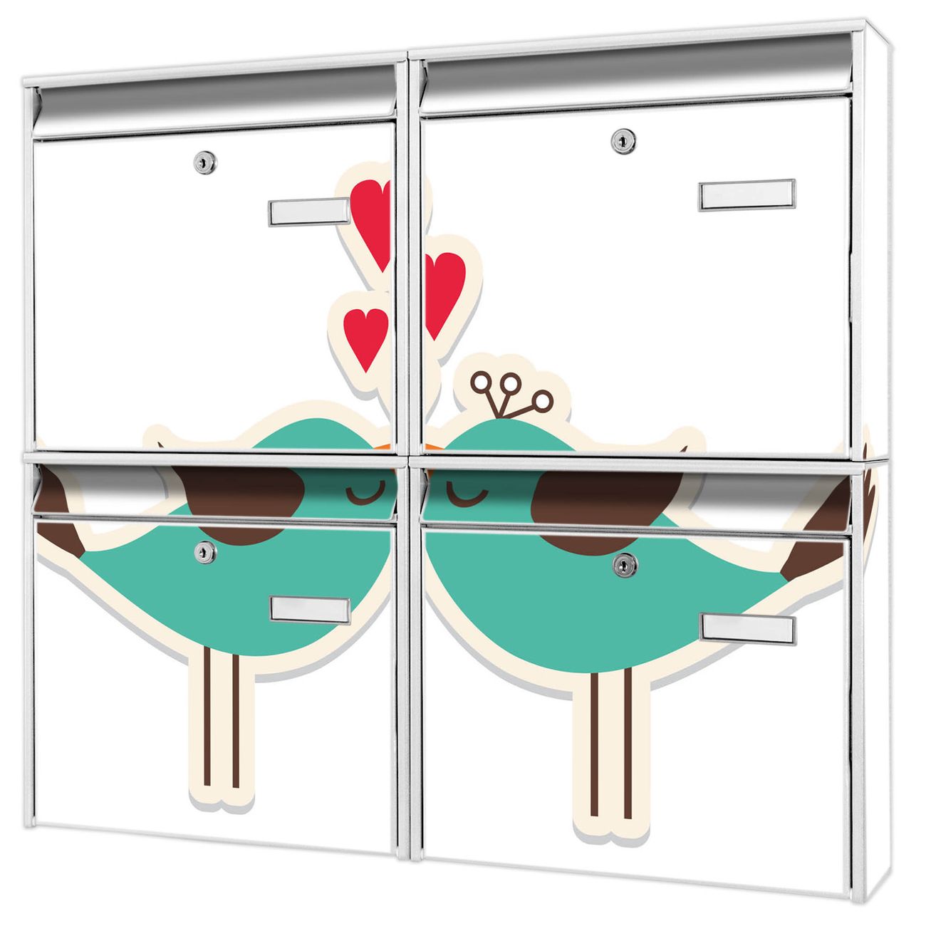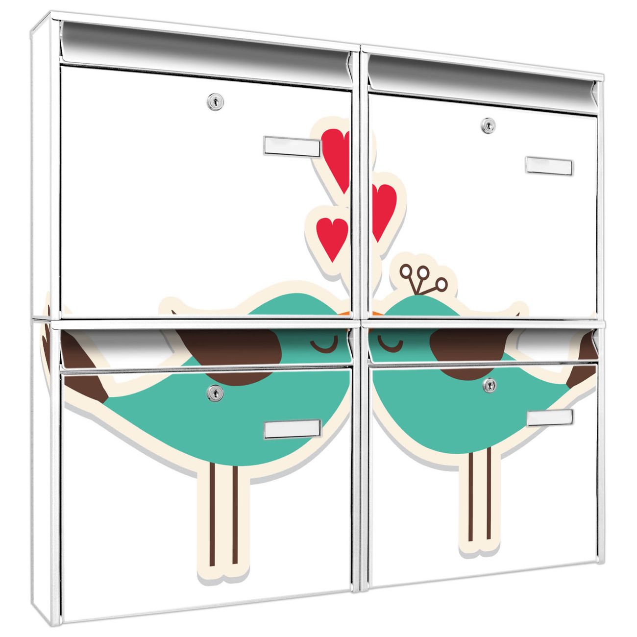 FUNKTION: Die Burg-Wächter Briefkastenanlage mit Motiv Küsschen bietet Ihnen ausreichend Fassungsvermögen um auch A4 und C4 Sendungen zu empfangen. Das integrierte Namensschild lässt sich individuell beschriften. Wählen Sie aus den Grundfarben weiß, silber und schwarz. DESIGN: Die 4 Briefkästen haben ein ansprechendes und zeitloses Design, ohne dabei auf Funktionalität zu verzichten. Das Material ist sehr stabil, wetterfest und rostfrei. Durch das Motiv Küsschen werden die Postkästen zu einem Blickfang. DETAILS: Die Postkästen bestehen aus verzinktem Stahl der zusätzlich mit Klarlack versiegelt wurde. Die Kästen sind gesamt 64,5cm hoch, 72,5cm breit und 10cm tief. Das Motiv besteht aus einer wetter- und UV-festen Folie, die Ihren Briefkasten zusätzlich vor Kratzern schützt. Die Postkästen werden mit Montagematerial, je einem Namensschild und je zwei Schlüsseln geliefert. NUTZEN: Das Briefkastenset eignet sich für die Wandmontage, die Größe bietet genügend Platz für Sendungen aller Art. Das zeitlose Design sowie die stabile Bauart bieten Ihnen einen treuen Begleiter für Ihre Post. BANJADO: