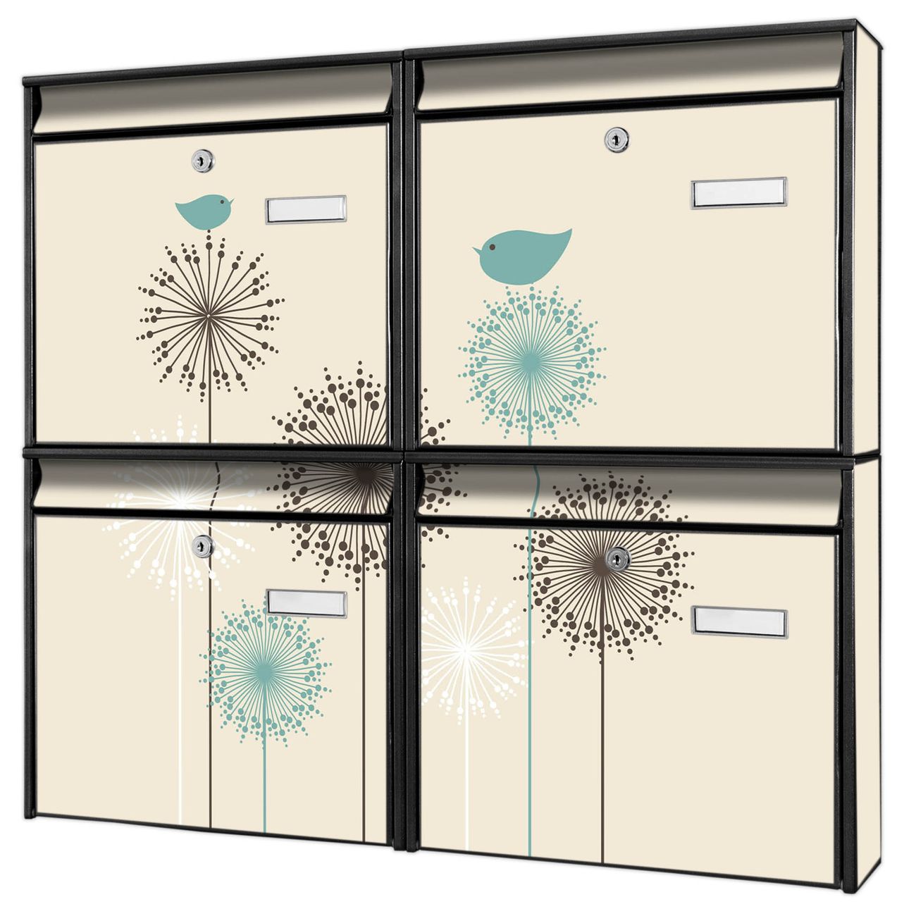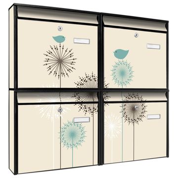 FUNKTION: Die Burg-Wächter Briefkastenanlage mit Motiv Kugelfontänen bietet Ihnen ausreichend Fassungsvermögen um auch A4 und C4 Sendungen zu empfangen. Das integrierte Namensschild lässt sich individuell beschriften. Wählen Sie aus den Grundfarben weiß, silber und schwarz. DESIGN: Die 4 Briefkästen haben ein ansprechendes und zeitloses Design, ohne dabei auf Funktionalität zu verzichten. Das Material ist sehr stabil, wetterfest und rostfrei. Durch das Motiv Kugelfontänen werden die Postkästen zu einem Blickfang. DETAILS: Die Postkästen bestehen aus verzinktem Stahl der zusätzlich mit Klarlack versiegelt wurde. Die Kästen sind gesamt 64,5cm hoch, 72,5cm breit und 10cm tief. Das Motiv besteht aus einer wetter- und UV-festen Folie, die Ihren Briefkasten zusätzlich vor Kratzern schützt. Die Postkästen werden mit Montagematerial, je einem Namensschild und je zwei Schlüsseln geliefert. NUTZEN: Das Briefkastenset eignet sich für die Wandmontage, die Größe bietet genügend Platz für Sendungen aller Art. Das zeitlose Design sowie die stabile Bauart bieten Ihnen einen treuen Begleiter für Ihre Post. BANJADO: