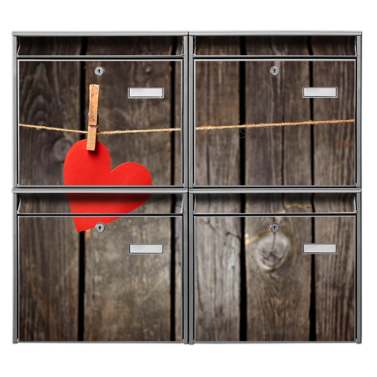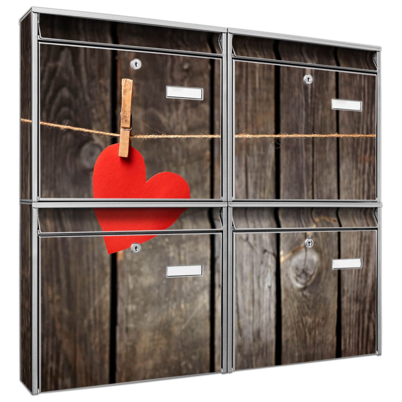 FUNKTION: Die Burg-Wächter Briefkastenanlage mit Motiv Kurznachricht bietet Ihnen ausreichend Fassungsvermögen um auch A4 und C4 Sendungen zu empfangen. Das integrierte Namensschild lässt sich individuell beschriften. Wählen Sie aus den Grundfarben weiß, silber und schwarz. DESIGN: Die 4 Briefkästen haben ein ansprechendes und zeitloses Design, ohne dabei auf Funktionalität zu verzichten. Das Material ist sehr stabil, wetterfest und rostfrei. Durch das Motiv Kurznachricht werden die Postkästen zu einem Blickfang. DETAILS: Die Postkästen bestehen aus verzinktem Stahl der zusätzlich mit Klarlack versiegelt wurde. Die Kästen sind gesamt 64,5cm hoch, 72,5cm breit und 10cm tief. Das Motiv besteht aus einer wetter- und UV-festen Folie, die Ihren Briefkasten zusätzlich vor Kratzern schützt. Die Postkästen werden mit Montagematerial, je einem Namensschild und je zwei Schlüsseln geliefert. NUTZEN: Das Briefkastenset eignet sich für die Wandmontage, die Größe bietet genügend Platz für Sendungen aller Art. Das zeitlose Design sowie die stabile Bauart bieten Ihnen einen treuen Begleiter für Ihre Post. BANJADO: