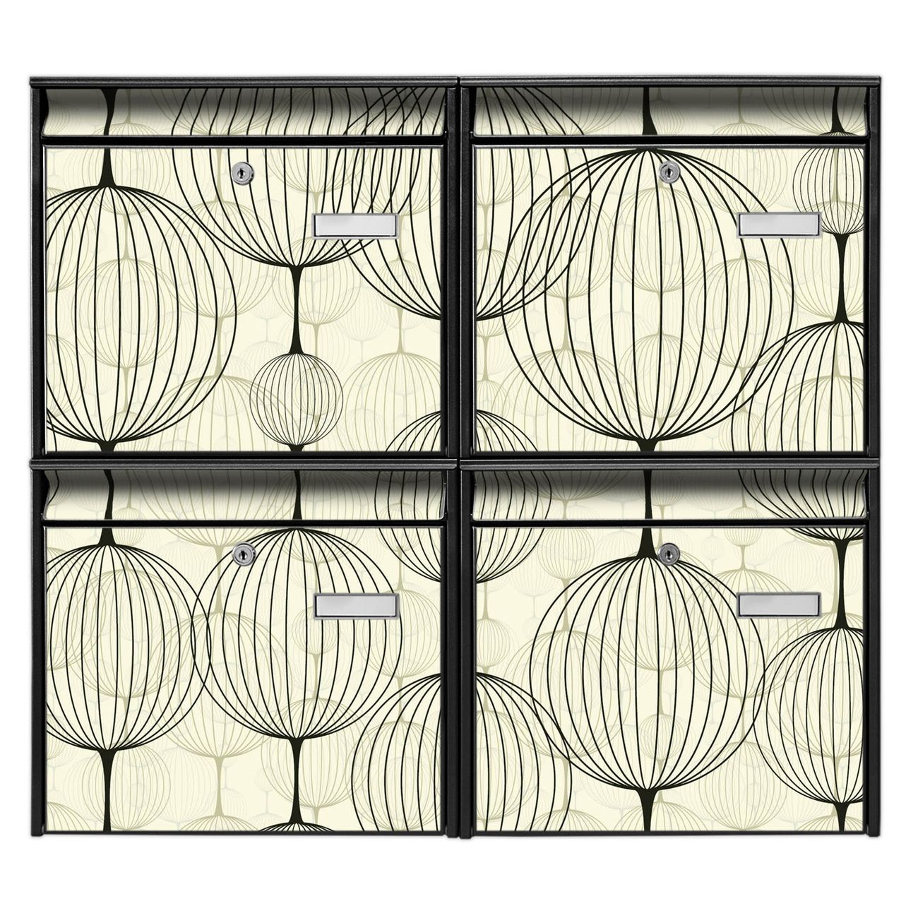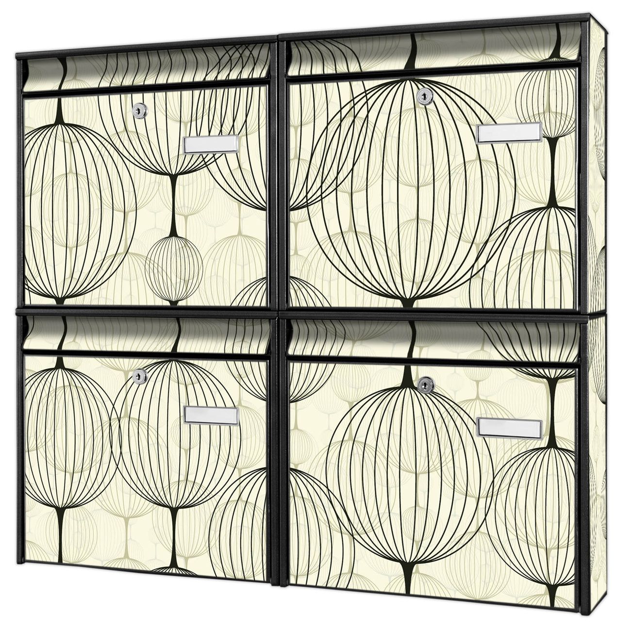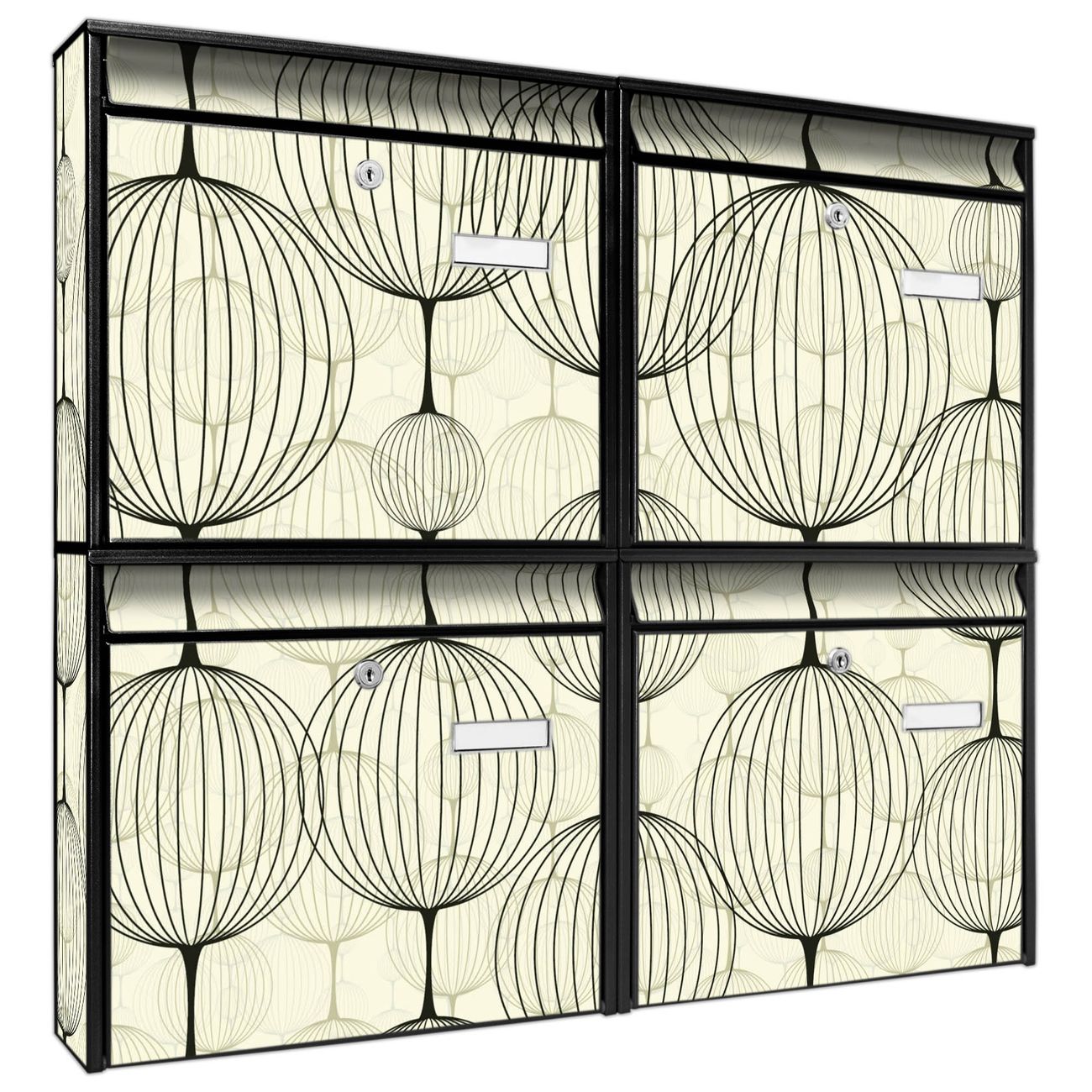 FUNKTION: Die Burg-Wächter Briefkastenanlage mit Motiv Lampions bietet Ihnen ausreichend Fassungsvermögen um auch A4 und C4 Sendungen zu empfangen. Das integrierte Namensschild lässt sich individuell beschriften. Wählen Sie aus den Grundfarben weiß, silber und schwarz. DESIGN: Die 4 Briefkästen haben ein ansprechendes und zeitloses Design, ohne dabei auf Funktionalität zu verzichten. Das Material ist sehr stabil, wetterfest und rostfrei. Durch das Motiv Lampions werden die Postkästen zu einem Blickfang. DETAILS: Die Postkästen bestehen aus verzinktem Stahl der zusätzlich mit Klarlack versiegelt wurde. Die Kästen sind gesamt 64,5cm hoch, 72,5cm breit und 10cm tief. Das Motiv besteht aus einer wetter- und UV-festen Folie, die Ihren Briefkasten zusätzlich vor Kratzern schützt. Die Postkästen werden mit Montagematerial, je einem Namensschild und je zwei Schlüsseln geliefert. NUTZEN: Das Briefkastenset eignet sich für die Wandmontage, die Größe bietet genügend Platz für Sendungen aller Art. Das zeitlose Design sowie die stabile Bauart bieten Ihnen einen treuen Begleiter für Ihre Post. BANJADO: