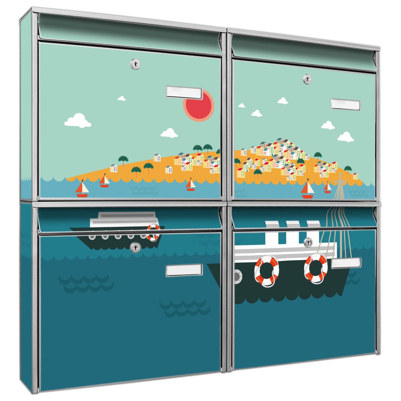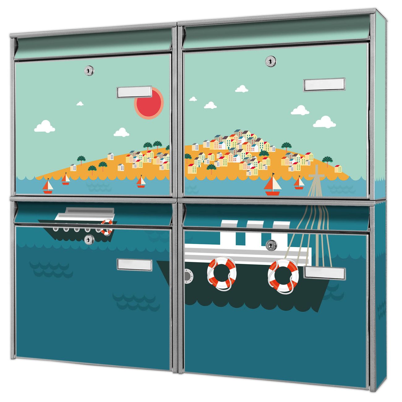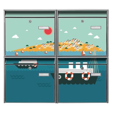 FUNKTION: Die Burg-Wächter Briefkastenanlage mit Motiv Land in Sicht bietet Ihnen ausreichend Fassungsvermögen um auch A4 und C4 Sendungen zu empfangen. Das integrierte Namensschild lässt sich individuell beschriften. Wählen Sie aus den Grundfarben weiß, silber und schwarz. DESIGN: Die 4 Briefkästen haben ein ansprechendes und zeitloses Design, ohne dabei auf Funktionalität zu verzichten. Das Material ist sehr stabil, wetterfest und rostfrei. Durch das Motiv Land in Sicht werden die Postkästen zu einem Blickfang. DETAILS: Die Postkästen bestehen aus verzinktem Stahl der zusätzlich mit Klarlack versiegelt wurde. Die Kästen sind gesamt 64,5cm hoch, 72,5cm breit und 10cm tief. Das Motiv besteht aus einer wetter- und UV-festen Folie, die Ihren Briefkasten zusätzlich vor Kratzern schützt. Die Postkästen werden mit Montagematerial, je einem Namensschild und je zwei Schlüsseln geliefert. NUTZEN: Das Briefkastenset eignet sich für die Wandmontage, die Größe bietet genügend Platz für Sendungen aller Art. Das zeitlose Design sowie die stabile Bauart bieten Ihnen einen treuen Begleiter für Ihre Post. BANJADO:
