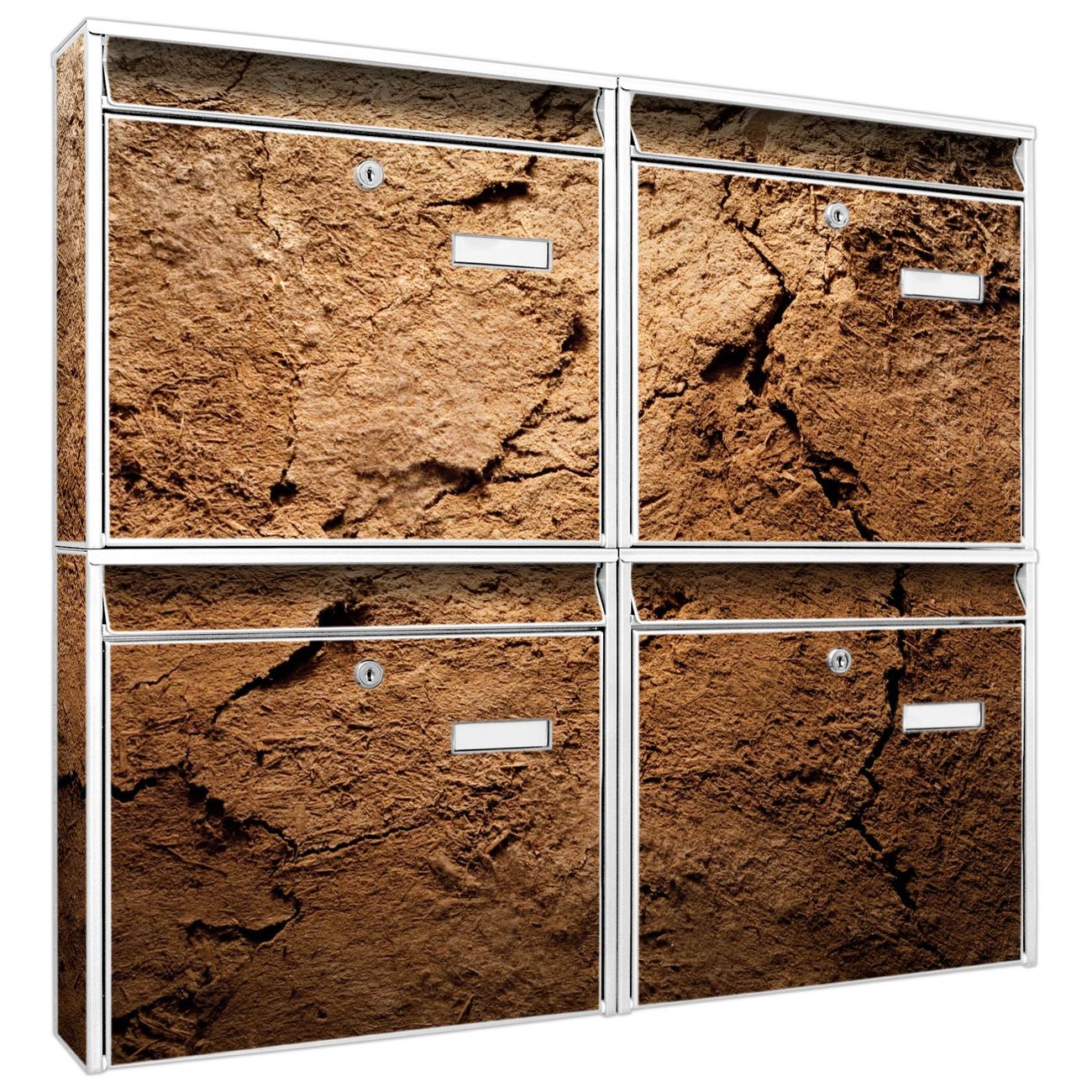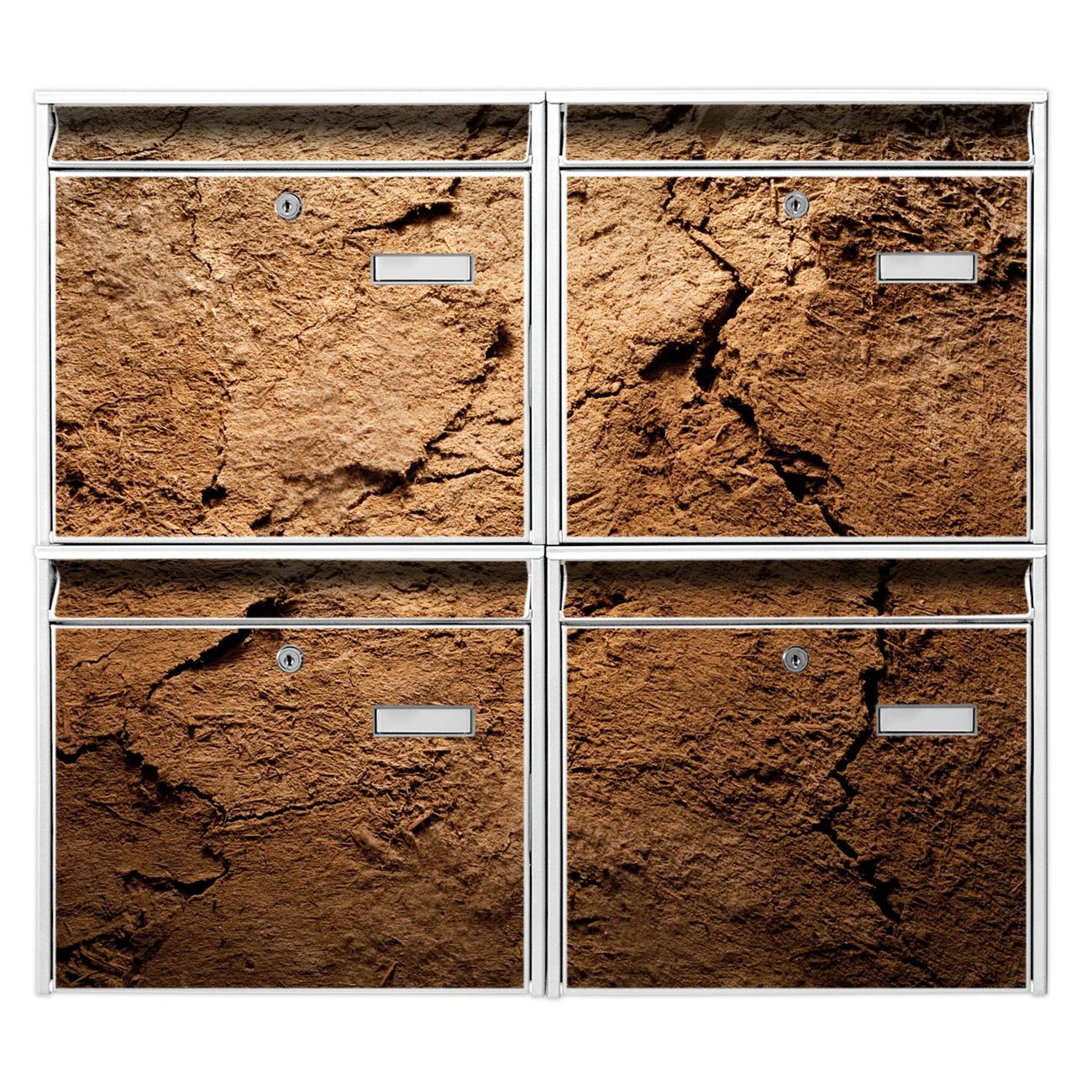 FUNKTION: Die Burg-Wächter Briefkastenanlage mit Motiv Lehmboden bietet Ihnen ausreichend Fassungsvermögen um auch A4 und C4 Sendungen zu empfangen. Das integrierte Namensschild lässt sich individuell beschriften. Wählen Sie aus den Grundfarben weiß, silber und schwarz. DESIGN: Die 4 Briefkästen haben ein ansprechendes und zeitloses Design, ohne dabei auf Funktionalität zu verzichten. Das Material ist sehr stabil, wetterfest und rostfrei. Durch das Motiv Lehmboden werden die Postkästen zu einem Blickfang. DETAILS: Die Postkästen bestehen aus verzinktem Stahl der zusätzlich mit Klarlack versiegelt wurde. Die Kästen sind gesamt 64,5cm hoch, 72,5cm breit und 10cm tief. Das Motiv besteht aus einer wetter- und UV-festen Folie, die Ihren Briefkasten zusätzlich vor Kratzern schützt. Die Postkästen werden mit Montagematerial, je einem Namensschild und je zwei Schlüsseln geliefert. NUTZEN: Das Briefkastenset eignet sich für die Wandmontage, die Größe bietet genügend Platz für Sendungen aller Art. Das zeitlose Design sowie die stabile Bauart bieten Ihnen einen treuen Begleiter für Ihre Post. BANJADO:
