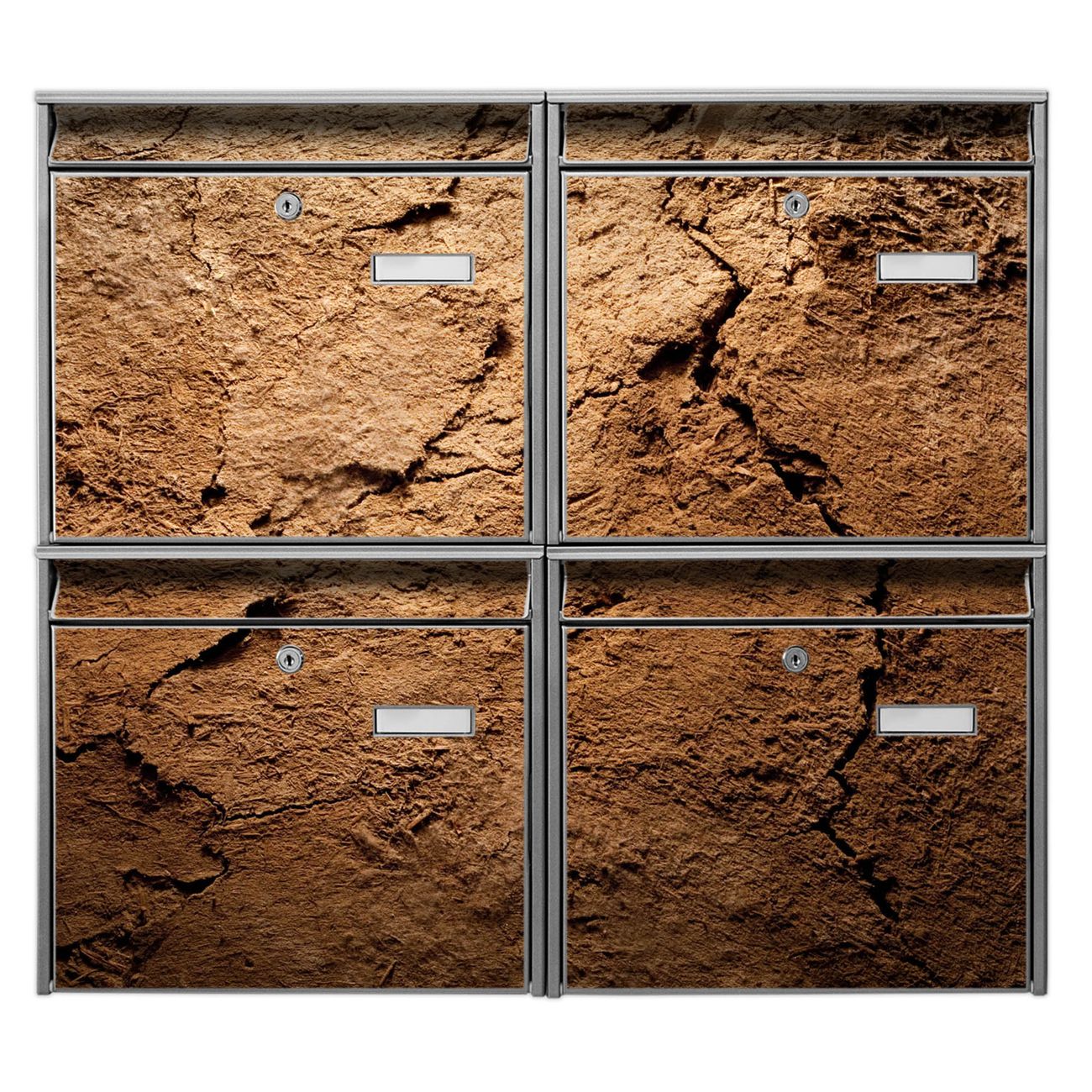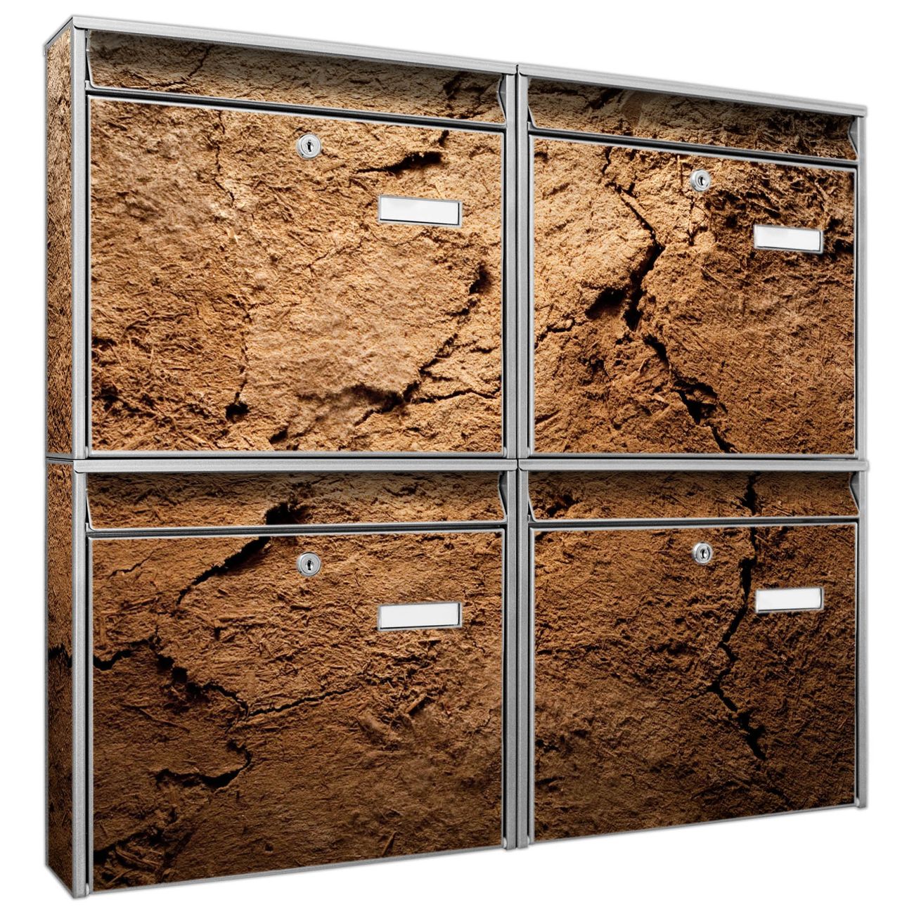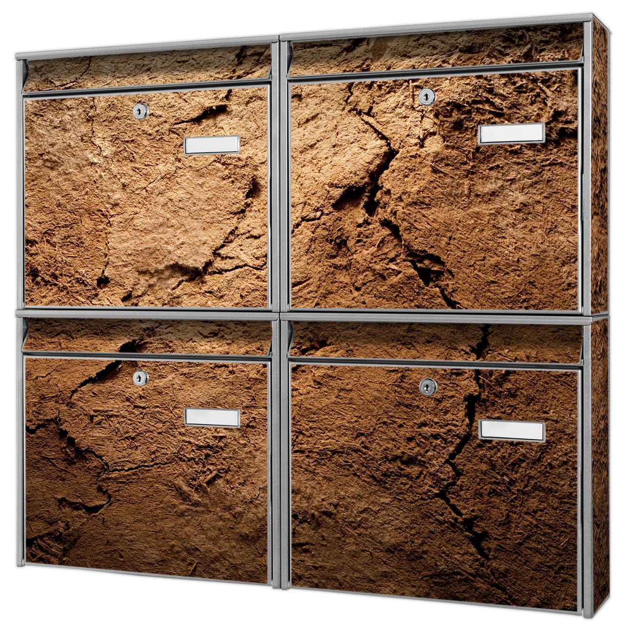 FUNKTION: Die Burg-Wächter Briefkastenanlage mit Motiv Lehmboden bietet Ihnen ausreichend Fassungsvermögen um auch A4 und C4 Sendungen zu empfangen. Das integrierte Namensschild lässt sich individuell beschriften. Wählen Sie aus den Grundfarben weiß, silber und schwarz. DESIGN: Die 4 Briefkästen haben ein ansprechendes und zeitloses Design, ohne dabei auf Funktionalität zu verzichten. Das Material ist sehr stabil, wetterfest und rostfrei. Durch das Motiv Lehmboden werden die Postkästen zu einem Blickfang. DETAILS: Die Postkästen bestehen aus verzinktem Stahl der zusätzlich mit Klarlack versiegelt wurde. Die Kästen sind gesamt 64,5cm hoch, 72,5cm breit und 10cm tief. Das Motiv besteht aus einer wetter- und UV-festen Folie, die Ihren Briefkasten zusätzlich vor Kratzern schützt. Die Postkästen werden mit Montagematerial, je einem Namensschild und je zwei Schlüsseln geliefert. NUTZEN: Das Briefkastenset eignet sich für die Wandmontage, die Größe bietet genügend Platz für Sendungen aller Art. Das zeitlose Design sowie die stabile Bauart bieten Ihnen einen treuen Begleiter für Ihre Post. BANJADO: