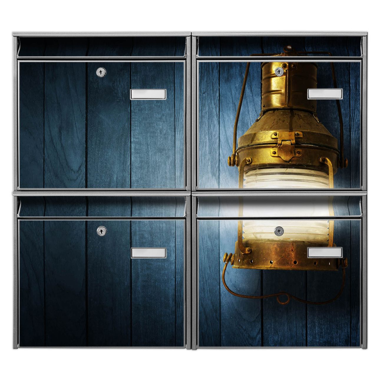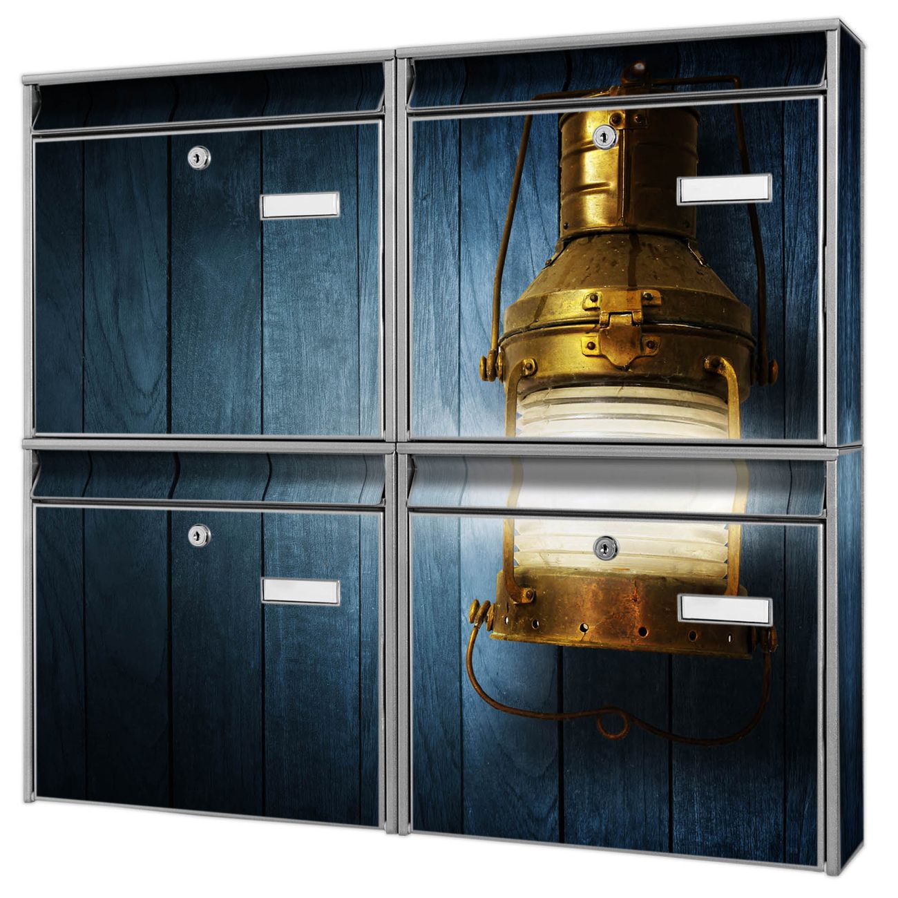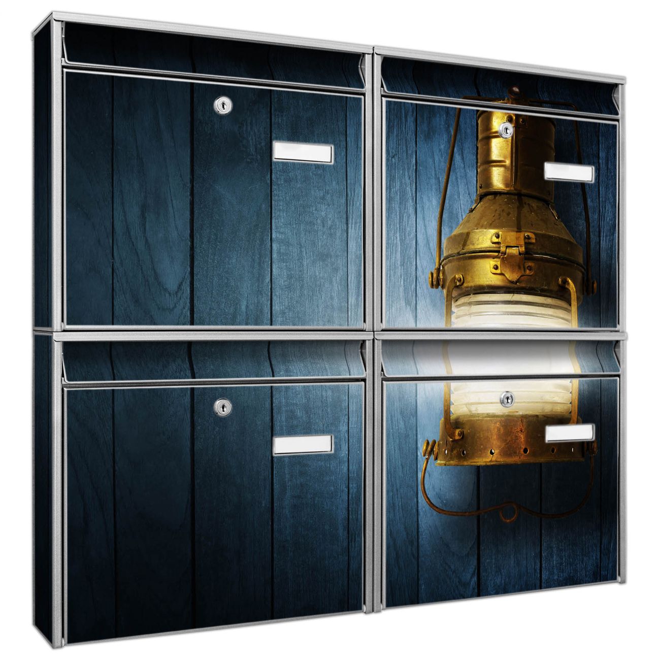 FUNKTION: Die Burg-Wächter Briefkastenanlage mit Motiv Leuchte bietet Ihnen ausreichend Fassungsvermögen um auch A4 und C4 Sendungen zu empfangen. Das integrierte Namensschild lässt sich individuell beschriften. Wählen Sie aus den Grundfarben weiß, silber und schwarz. DESIGN: Die 4 Briefkästen haben ein ansprechendes und zeitloses Design, ohne dabei auf Funktionalität zu verzichten. Das Material ist sehr stabil, wetterfest und rostfrei. Durch das Motiv Leuchte werden die Postkästen zu einem Blickfang. DETAILS: Die Postkästen bestehen aus verzinktem Stahl der zusätzlich mit Klarlack versiegelt wurde. Die Kästen sind gesamt 64,5cm hoch, 72,5cm breit und 10cm tief. Das Motiv besteht aus einer wetter- und UV-festen Folie, die Ihren Briefkasten zusätzlich vor Kratzern schützt. Die Postkästen werden mit Montagematerial, je einem Namensschild und je zwei Schlüsseln geliefert. NUTZEN: Das Briefkastenset eignet sich für die Wandmontage, die Größe bietet genügend Platz für Sendungen aller Art. Das zeitlose Design sowie die stabile Bauart bieten Ihnen einen treuen Begleiter für Ihre Post. BANJADO: