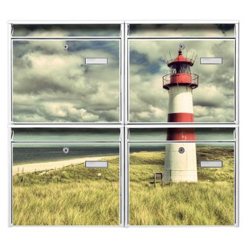 FUNKTION: Die Burg-Wächter Briefkastenanlage mit Motiv Leuchtturm Sylt bietet Ihnen ausreichend Fassungsvermögen um auch A4 und C4 Sendungen zu empfangen. Das integrierte Namensschild lässt sich individuell beschriften. Wählen Sie aus den Grundfarben weiß, silber und schwarz. DESIGN: Die 4 Briefkästen haben ein ansprechendes und zeitloses Design, ohne dabei auf Funktionalität zu verzichten. Das Material ist sehr stabil, wetterfest und rostfrei. Durch das Motiv Leuchtturm Sylt werden die Postkästen zu einem Blickfang. DETAILS: Die Postkästen bestehen aus verzinktem Stahl der zusätzlich mit Klarlack versiegelt wurde. Die Kästen sind gesamt 64,5cm hoch, 72,5cm breit und 10cm tief. Das Motiv besteht aus einer wetter- und UV-festen Folie, die Ihren Briefkasten zusätzlich vor Kratzern schützt. Die Postkästen werden mit Montagematerial, je einem Namensschild und je zwei Schlüsseln geliefert. NUTZEN: Das Briefkastenset eignet sich für die Wandmontage, die Größe bietet genügend Platz für Sendungen aller Art. Das zeitlose Design sowie die stabile Bauart bieten Ihnen einen treuen Begleiter für Ihre Post. BANJADO:
