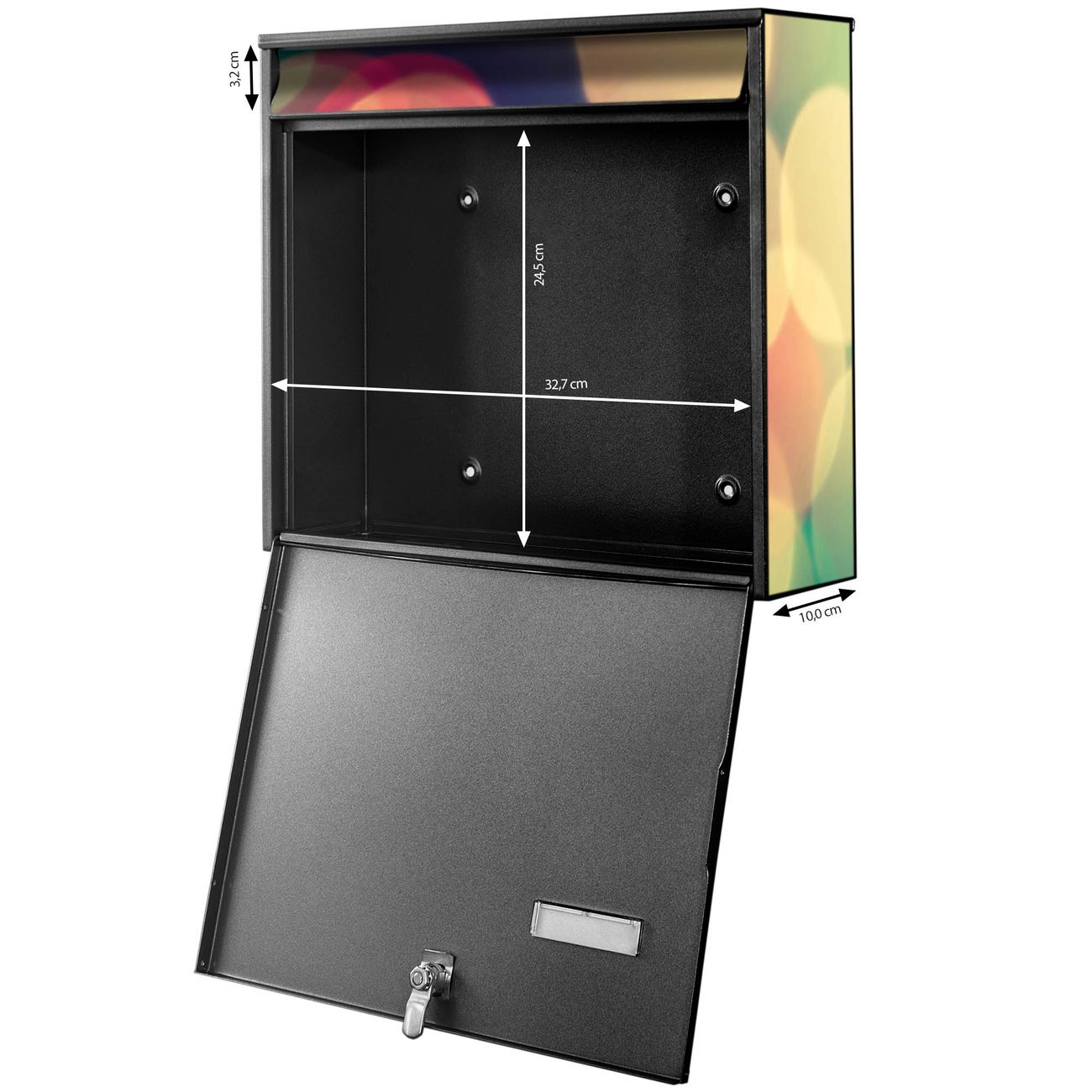 FUNKTION: Die Burg-Wächter Briefkastenanlage mit Motiv Lichtpunkte Weiß Grün Rot bietet Ihnen ausreichend Fassungsvermögen um auch A4 und C4 Sendungen zu empfangen. Das integrierte Namensschild lässt sich individuell beschriften. Wählen Sie aus den Grundfarben weiß, silber und schwarz. DESIGN: Die 4 Briefkästen haben ein ansprechendes und zeitloses Design, ohne dabei auf Funktionalität zu verzichten. Das Material ist sehr stabil, wetterfest und rostfrei. Durch das Motiv Lichtpunkte Weiß Grün Rot werden die Postkästen zu einem Blickfang. DETAILS: Die Postkästen bestehen aus verzinktem Stahl der zusätzlich mit Klarlack versiegelt wurde. Die Kästen sind gesamt 64,5cm hoch, 72,5cm breit und 10cm tief. Das Motiv besteht aus einer wetter- und UV-festen Folie, die Ihren Briefkasten zusätzlich vor Kratzern schützt. Die Postkästen werden mit Montagematerial, je einem Namensschild und je zwei Schlüsseln geliefert. NUTZEN: Das Briefkastenset eignet sich für die Wandmontage, die Größe bietet genügend Platz für Sendungen aller Art. Das zeitlose Design sowie die stabile Bauart bieten Ihnen einen treuen Begleiter für Ihre Post. BANJADO: