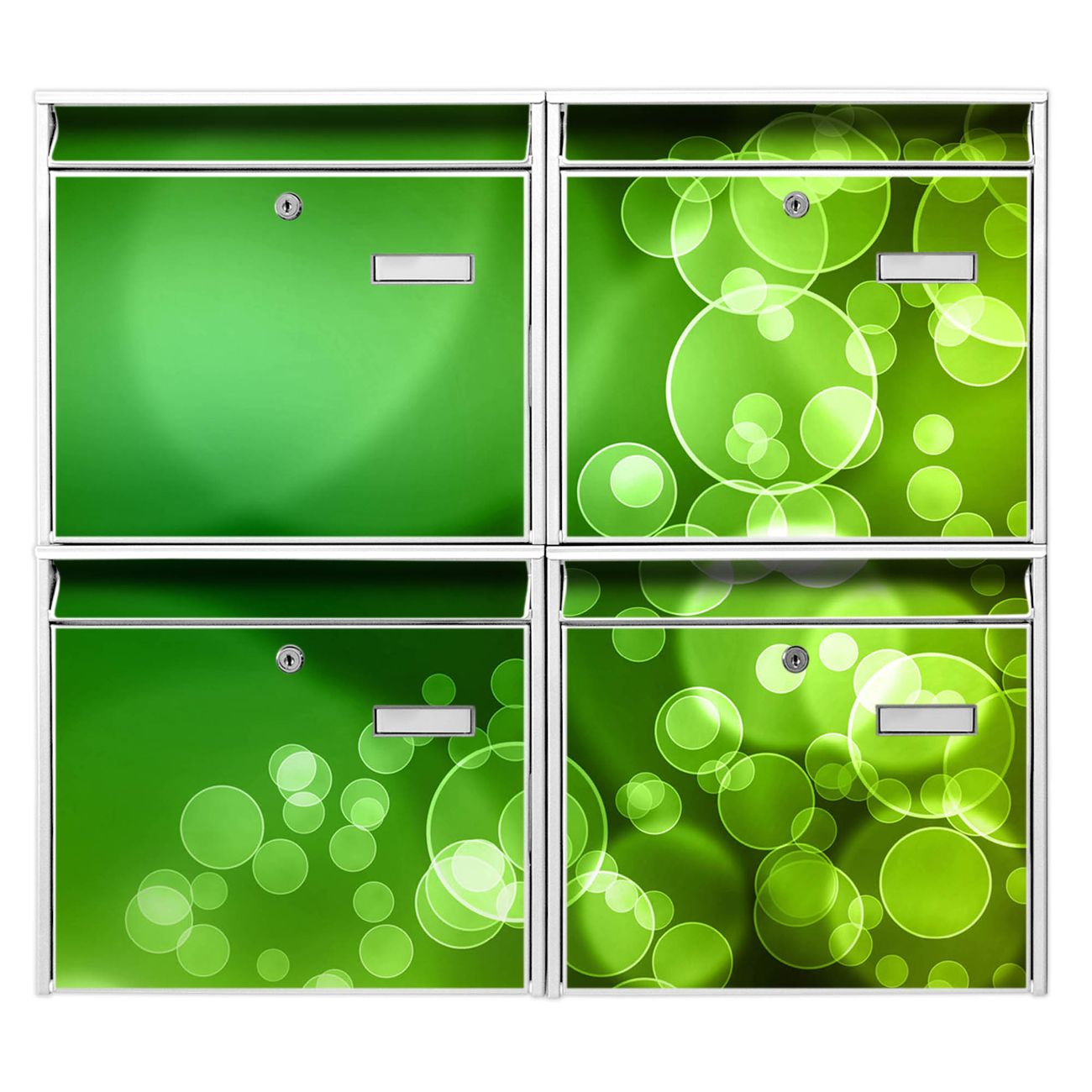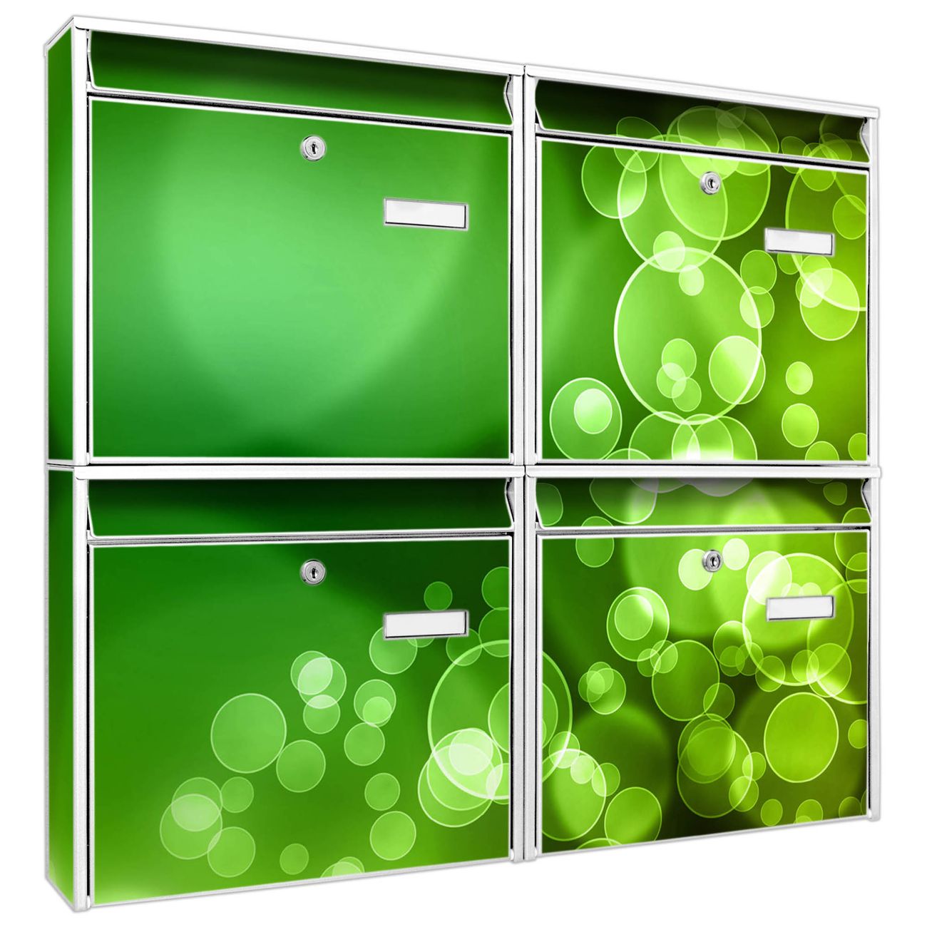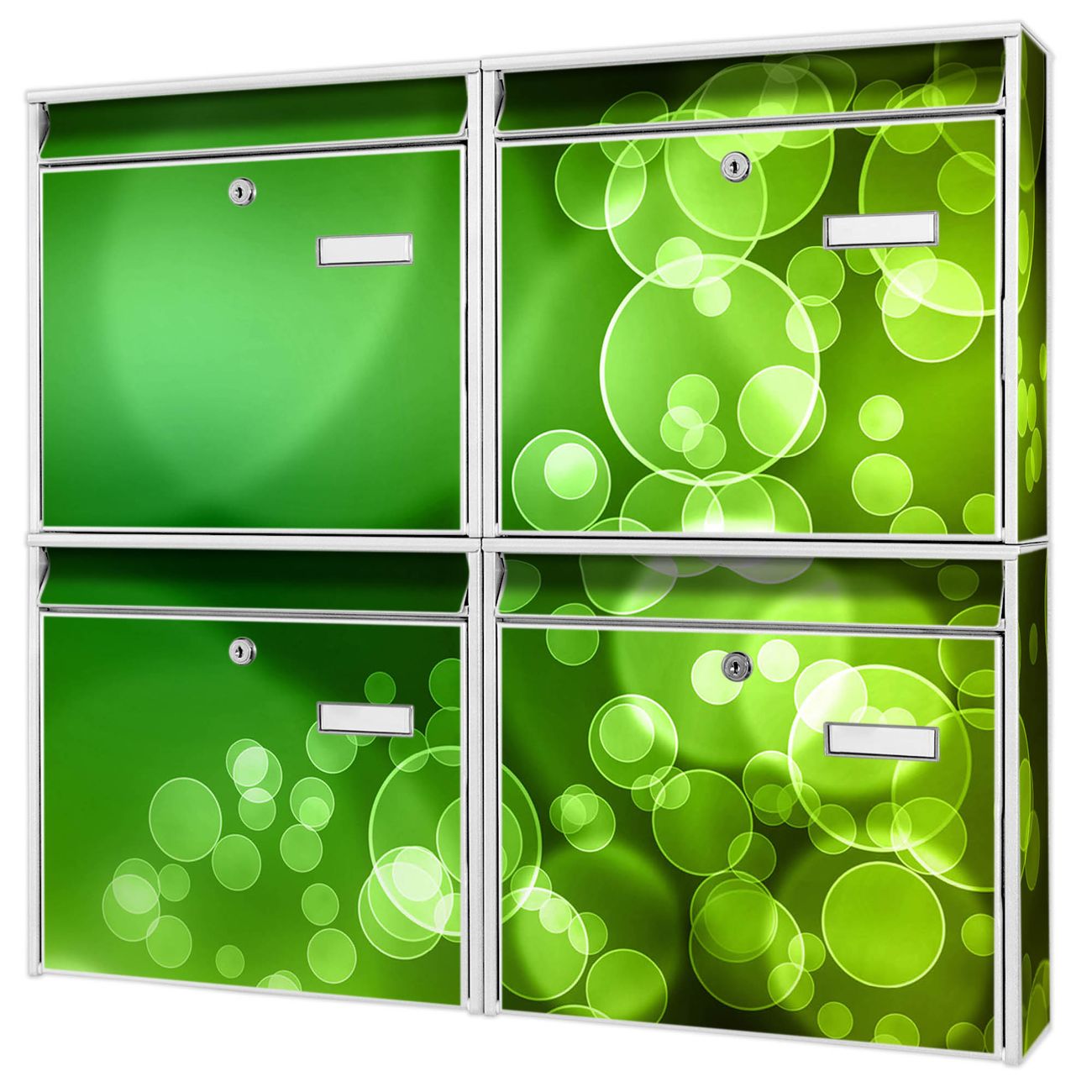 FUNKTION: Die Burg-Wächter Briefkastenanlage mit Motiv Lichtspiel bietet Ihnen ausreichend Fassungsvermögen um auch A4 und C4 Sendungen zu empfangen. Das integrierte Namensschild lässt sich individuell beschriften. Wählen Sie aus den Grundfarben weiß, silber und schwarz. DESIGN: Die 4 Briefkästen haben ein ansprechendes und zeitloses Design, ohne dabei auf Funktionalität zu verzichten. Das Material ist sehr stabil, wetterfest und rostfrei. Durch das Motiv Lichtspiel werden die Postkästen zu einem Blickfang. DETAILS: Die Postkästen bestehen aus verzinktem Stahl der zusätzlich mit Klarlack versiegelt wurde. Die Kästen sind gesamt 64,5cm hoch, 72,5cm breit und 10cm tief. Das Motiv besteht aus einer wetter- und UV-festen Folie, die Ihren Briefkasten zusätzlich vor Kratzern schützt. Die Postkästen werden mit Montagematerial, je einem Namensschild und je zwei Schlüsseln geliefert. NUTZEN: Das Briefkastenset eignet sich für die Wandmontage, die Größe bietet genügend Platz für Sendungen aller Art. Das zeitlose Design sowie die stabile Bauart bieten Ihnen einen treuen Begleiter für Ihre Post. BANJADO: