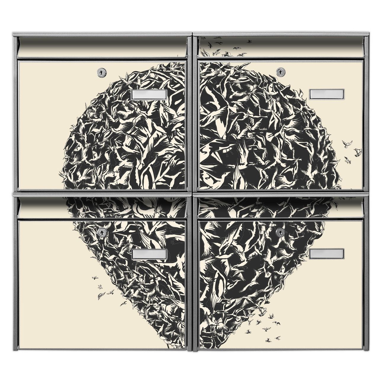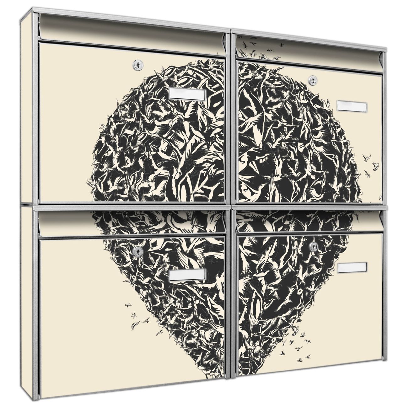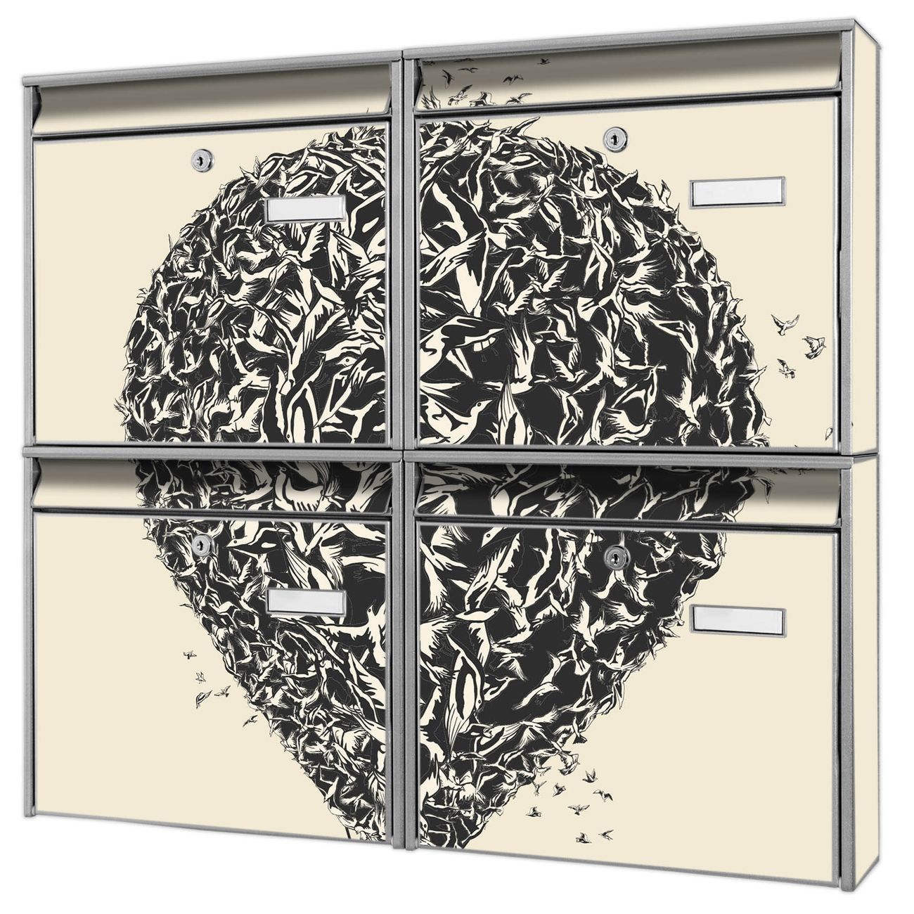 FUNKTION: Die Burg-Wächter Briefkastenanlage mit Motiv Lift bietet Ihnen ausreichend Fassungsvermögen um auch A4 und C4 Sendungen zu empfangen. Das integrierte Namensschild lässt sich individuell beschriften. Wählen Sie aus den Grundfarben weiß, silber und schwarz. DESIGN: Die 4 Briefkästen haben ein ansprechendes und zeitloses Design, ohne dabei auf Funktionalität zu verzichten. Das Material ist sehr stabil, wetterfest und rostfrei. Durch das Motiv Lift werden die Postkästen zu einem Blickfang. DETAILS: Die Postkästen bestehen aus verzinktem Stahl der zusätzlich mit Klarlack versiegelt wurde. Die Kästen sind gesamt 64,5cm hoch, 72,5cm breit und 10cm tief. Das Motiv besteht aus einer wetter- und UV-festen Folie, die Ihren Briefkasten zusätzlich vor Kratzern schützt. Die Postkästen werden mit Montagematerial, je einem Namensschild und je zwei Schlüsseln geliefert. NUTZEN: Das Briefkastenset eignet sich für die Wandmontage, die Größe bietet genügend Platz für Sendungen aller Art. Das zeitlose Design sowie die stabile Bauart bieten Ihnen einen treuen Begleiter für Ihre Post. BANJADO: