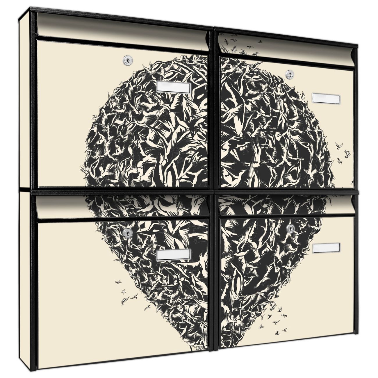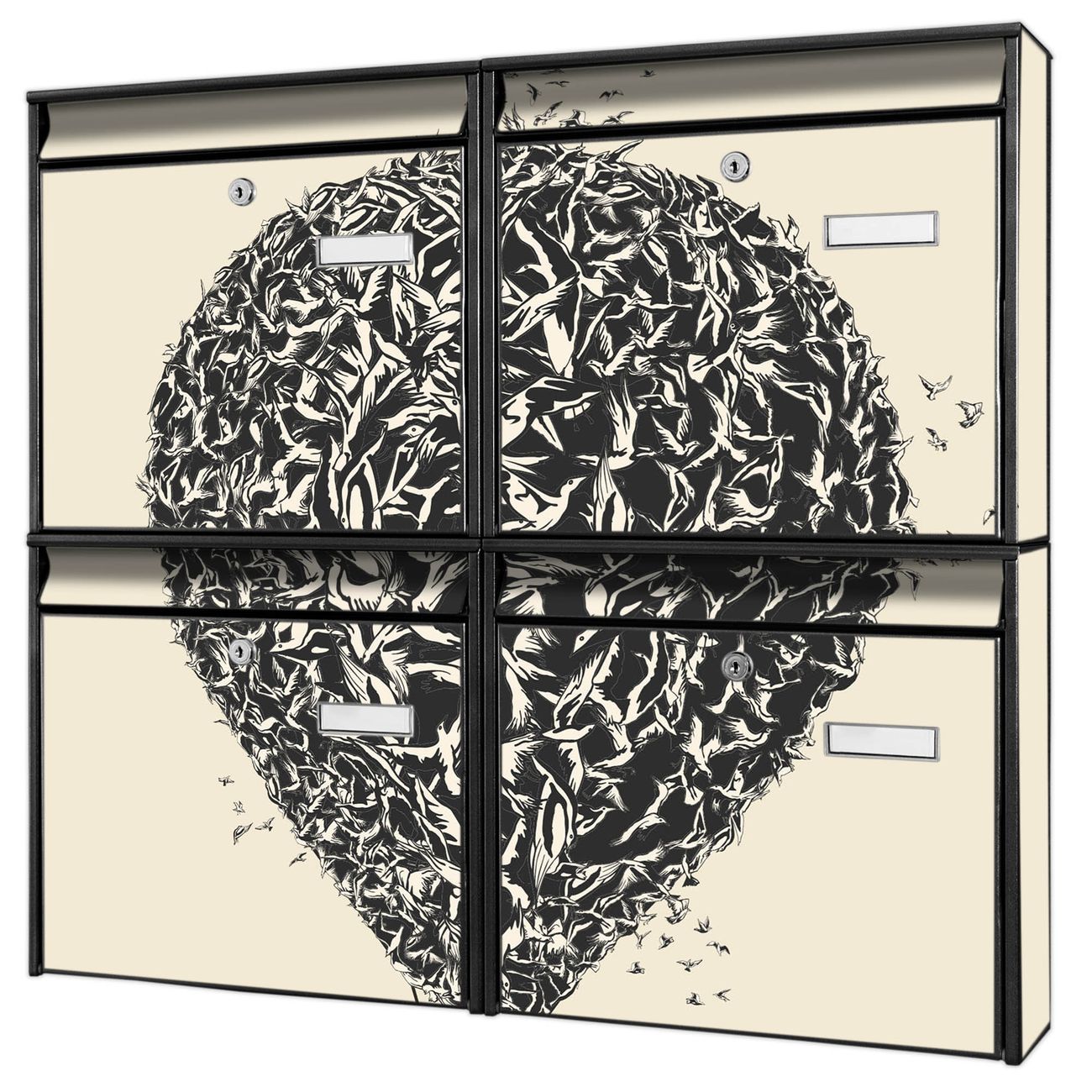 FUNKTION: Die Burg-Wächter Briefkastenanlage mit Motiv Lift bietet Ihnen ausreichend Fassungsvermögen um auch A4 und C4 Sendungen zu empfangen. Das integrierte Namensschild lässt sich individuell beschriften. Wählen Sie aus den Grundfarben weiß, silber und schwarz. DESIGN: Die 4 Briefkästen haben ein ansprechendes und zeitloses Design, ohne dabei auf Funktionalität zu verzichten. Das Material ist sehr stabil, wetterfest und rostfrei. Durch das Motiv Lift werden die Postkästen zu einem Blickfang. DETAILS: Die Postkästen bestehen aus verzinktem Stahl der zusätzlich mit Klarlack versiegelt wurde. Die Kästen sind gesamt 64,5cm hoch, 72,5cm breit und 10cm tief. Das Motiv besteht aus einer wetter- und UV-festen Folie, die Ihren Briefkasten zusätzlich vor Kratzern schützt. Die Postkästen werden mit Montagematerial, je einem Namensschild und je zwei Schlüsseln geliefert. NUTZEN: Das Briefkastenset eignet sich für die Wandmontage, die Größe bietet genügend Platz für Sendungen aller Art. Das zeitlose Design sowie die stabile Bauart bieten Ihnen einen treuen Begleiter für Ihre Post. BANJADO: