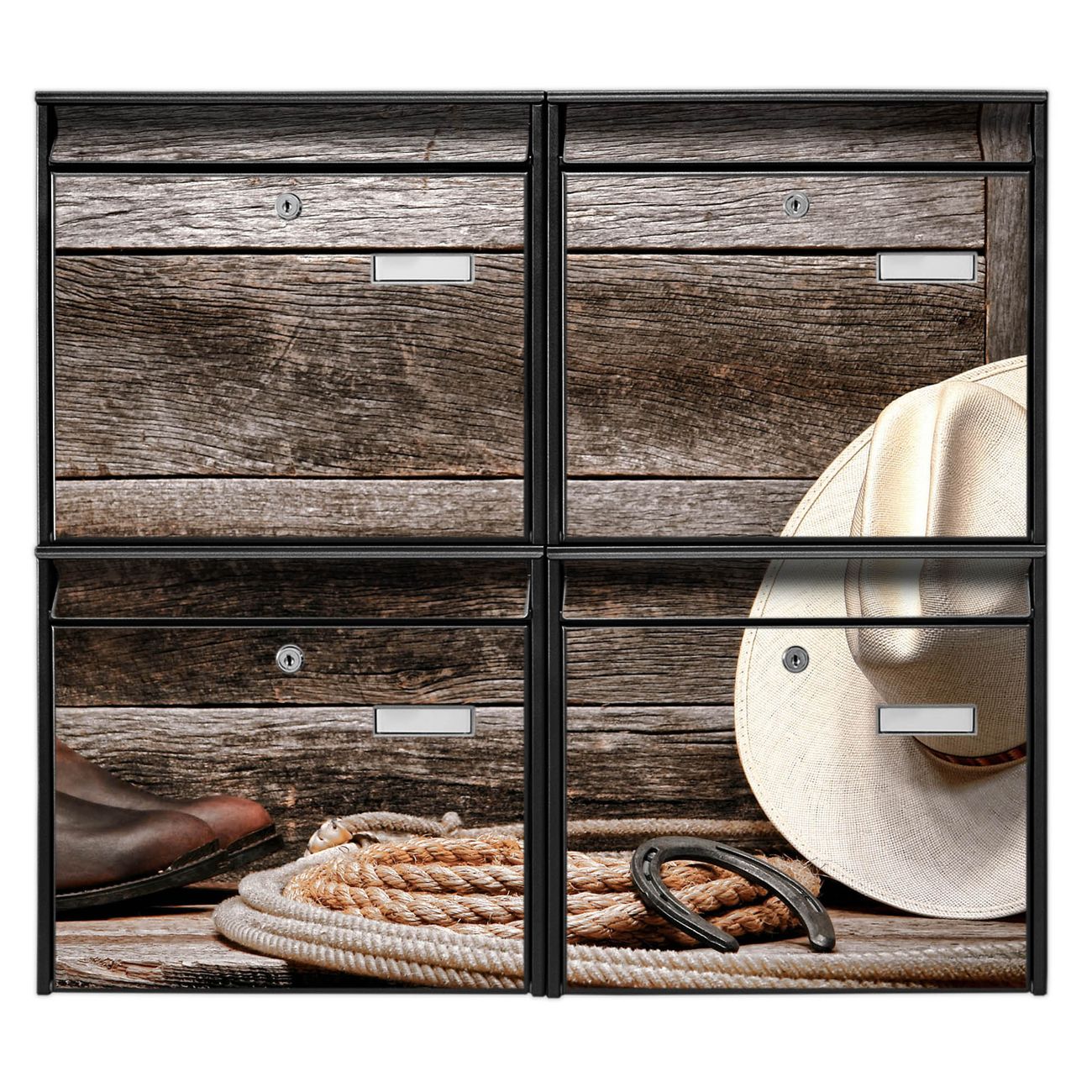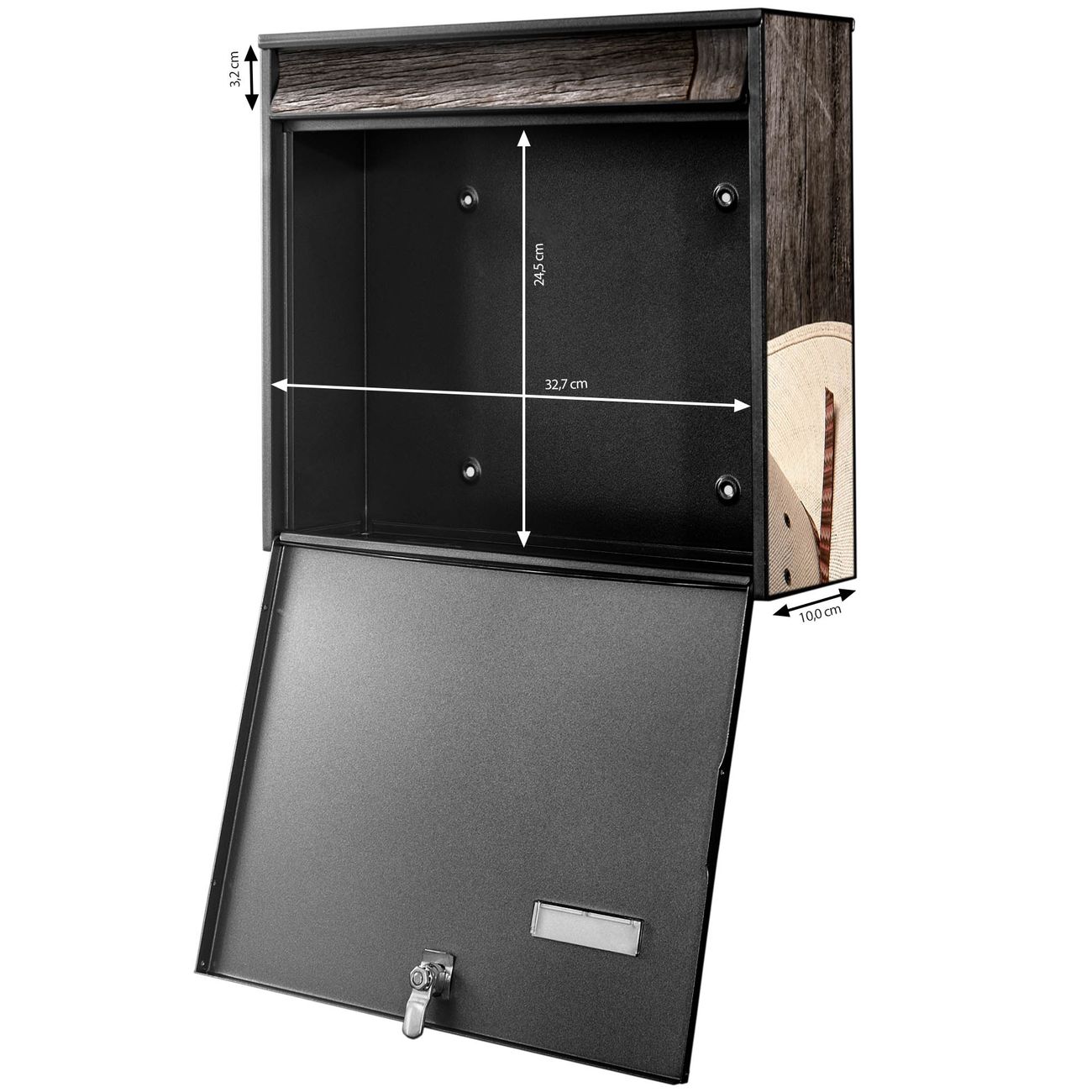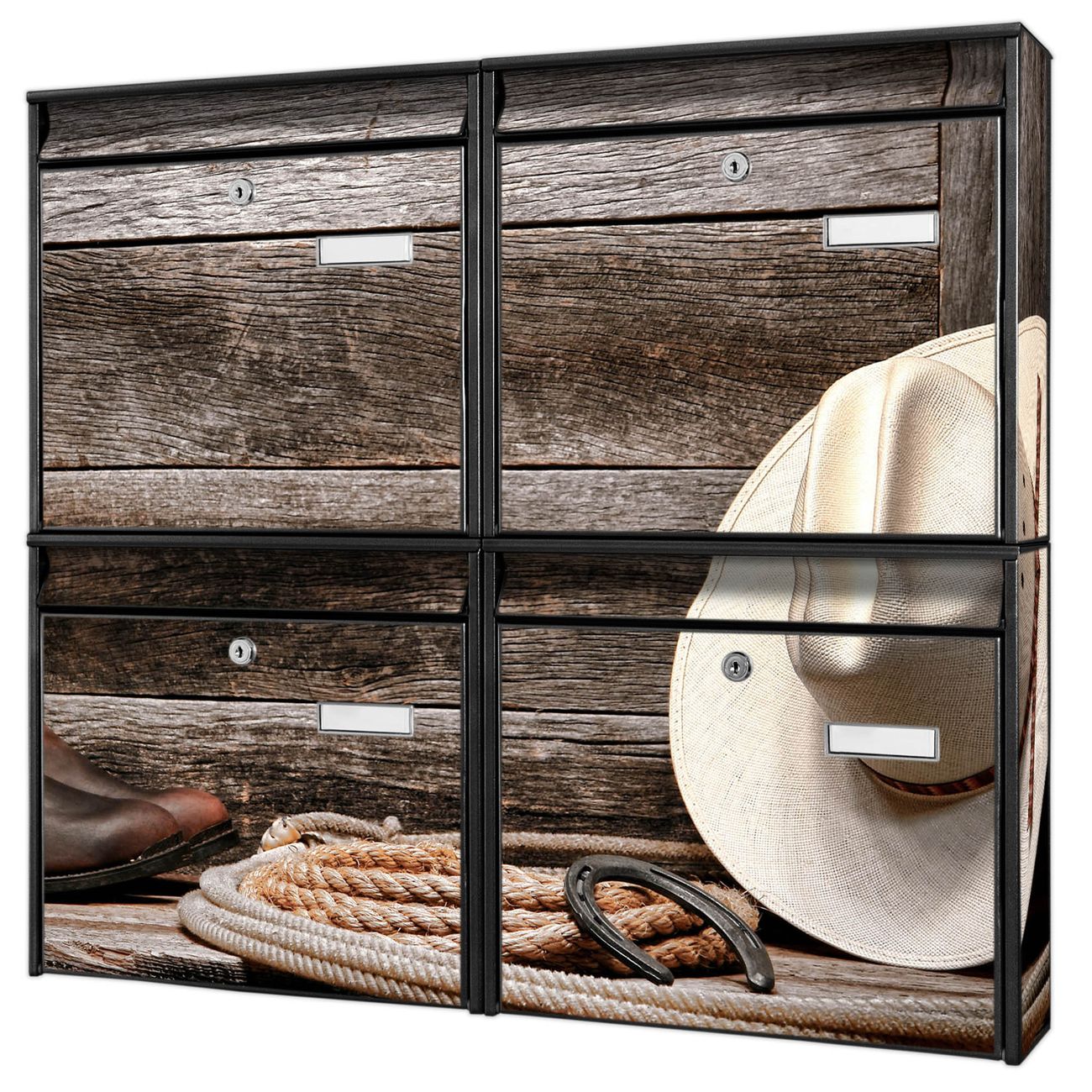 FUNKTION: Die Burg-Wächter Briefkastenanlage mit Motiv Linedance Set bietet Ihnen ausreichend Fassungsvermögen um auch A4 und C4 Sendungen zu empfangen. Das integrierte Namensschild lässt sich individuell beschriften. Wählen Sie aus den Grundfarben weiß, silber und schwarz. DESIGN: Die 4 Briefkästen haben ein ansprechendes und zeitloses Design, ohne dabei auf Funktionalität zu verzichten. Das Material ist sehr stabil, wetterfest und rostfrei. Durch das Motiv Linedance Set werden die Postkästen zu einem Blickfang. DETAILS: Die Postkästen bestehen aus verzinktem Stahl der zusätzlich mit Klarlack versiegelt wurde. Die Kästen sind gesamt 64,5cm hoch, 72,5cm breit und 10cm tief. Das Motiv besteht aus einer wetter- und UV-festen Folie, die Ihren Briefkasten zusätzlich vor Kratzern schützt. Die Postkästen werden mit Montagematerial, je einem Namensschild und je zwei Schlüsseln geliefert. NUTZEN: Das Briefkastenset eignet sich für die Wandmontage, die Größe bietet genügend Platz für Sendungen aller Art. Das zeitlose Design sowie die stabile Bauart bieten Ihnen einen treuen Begleiter für Ihre Post. BANJADO: