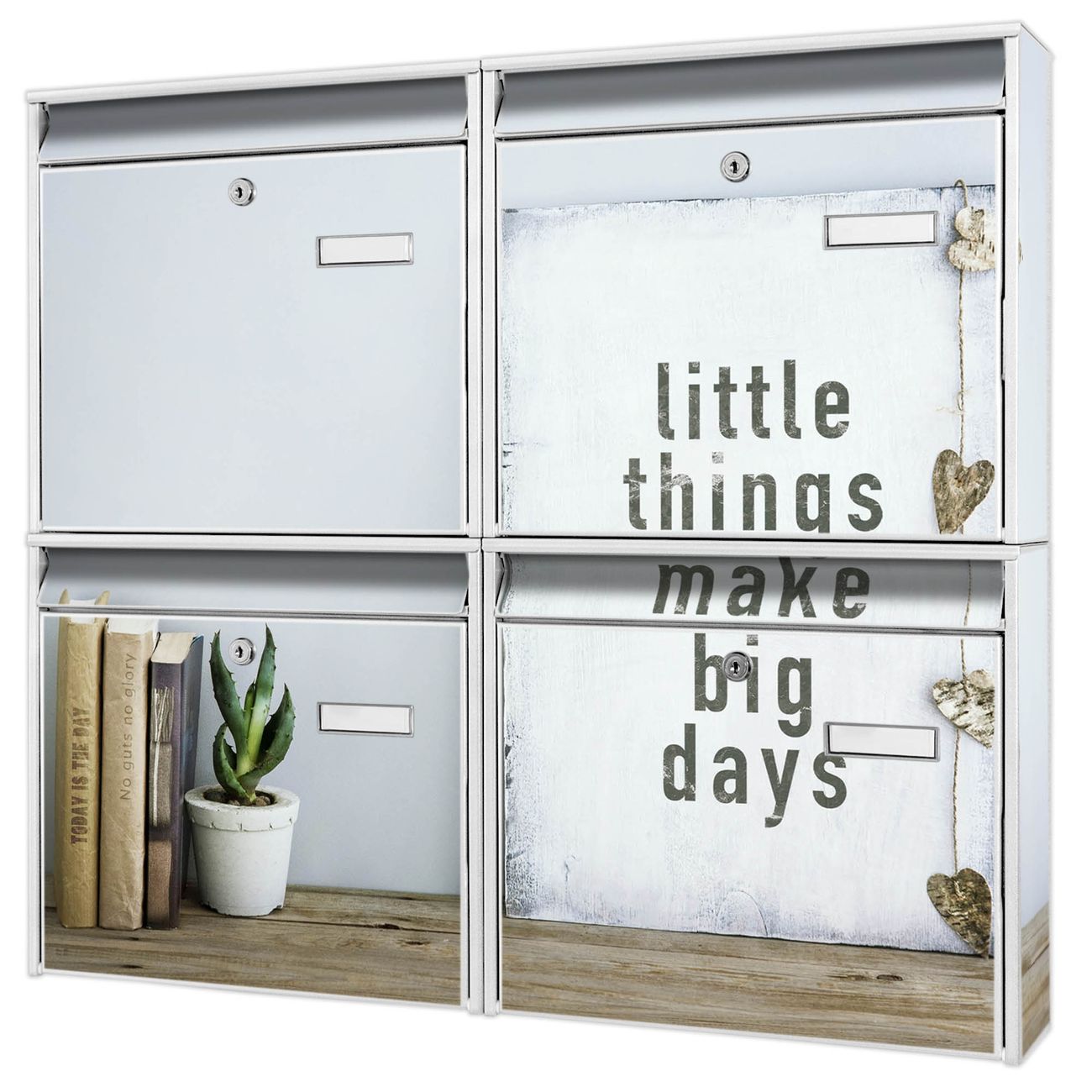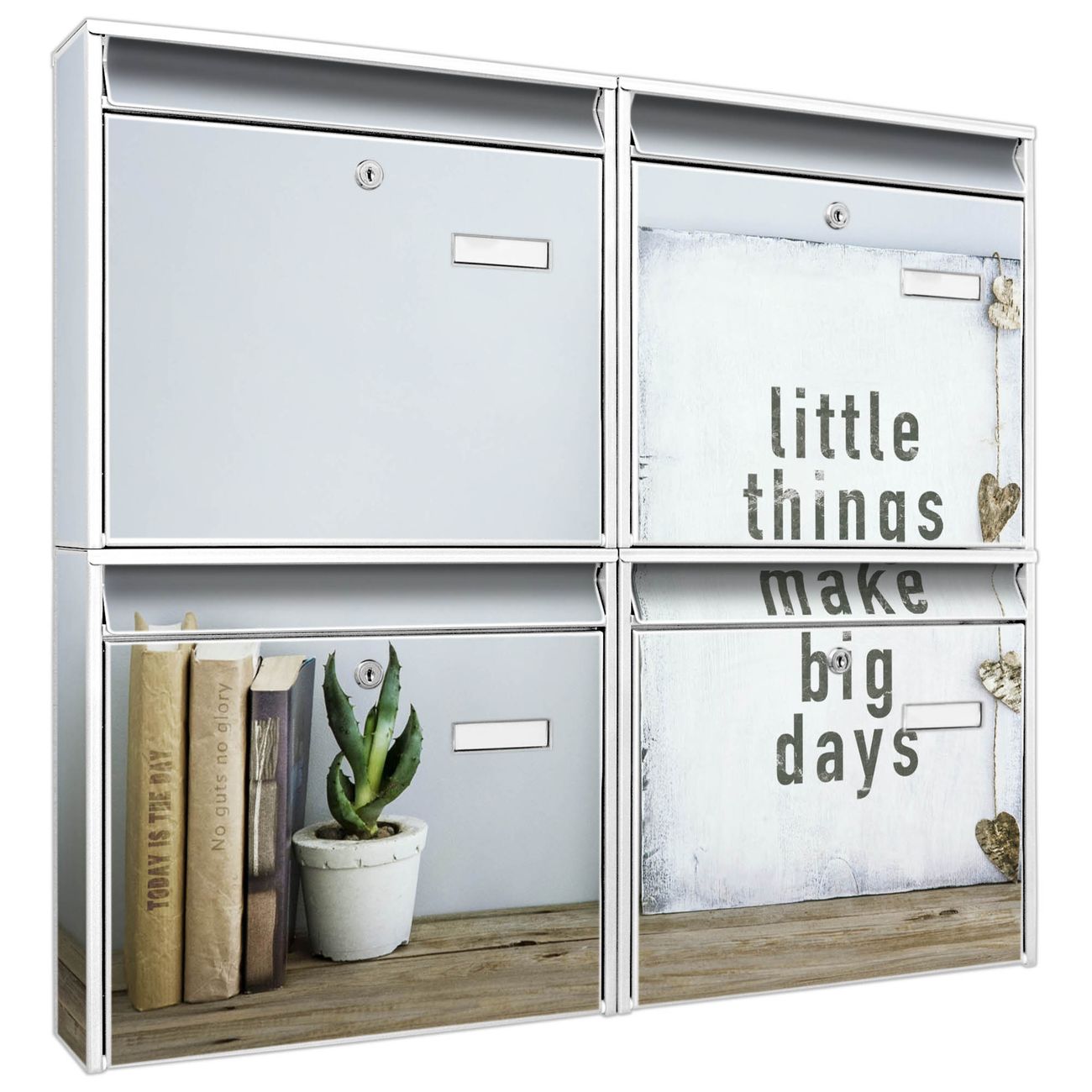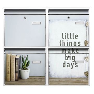 FUNKTION: Die Burg-Wächter Briefkastenanlage mit Motiv Little Things bietet Ihnen ausreichend Fassungsvermögen um auch A4 und C4 Sendungen zu empfangen. Das integrierte Namensschild lässt sich individuell beschriften. Wählen Sie aus den Grundfarben weiß, silber und schwarz. DESIGN: Die 4 Briefkästen haben ein ansprechendes und zeitloses Design, ohne dabei auf Funktionalität zu verzichten. Das Material ist sehr stabil, wetterfest und rostfrei. Durch das Motiv Little Things werden die Postkästen zu einem Blickfang. DETAILS: Die Postkästen bestehen aus verzinktem Stahl der zusätzlich mit Klarlack versiegelt wurde. Die Kästen sind gesamt 64,5cm hoch, 72,5cm breit und 10cm tief. Das Motiv besteht aus einer wetter- und UV-festen Folie, die Ihren Briefkasten zusätzlich vor Kratzern schützt. Die Postkästen werden mit Montagematerial, je einem Namensschild und je zwei Schlüsseln geliefert. NUTZEN: Das Briefkastenset eignet sich für die Wandmontage, die Größe bietet genügend Platz für Sendungen aller Art. Das zeitlose Design sowie die stabile Bauart bieten Ihnen einen treuen Begleiter für Ihre Post. BANJADO: