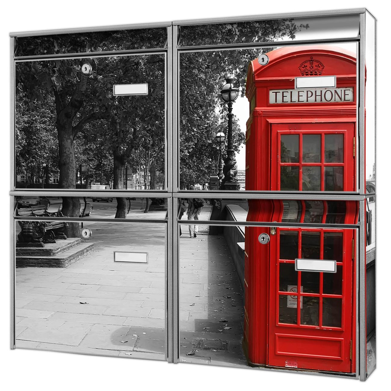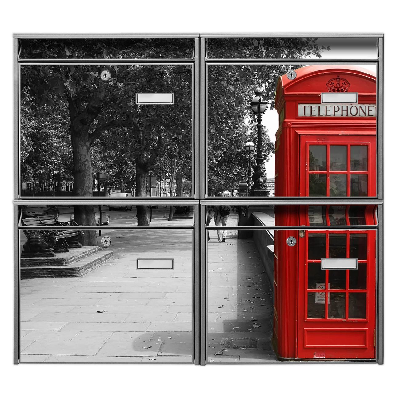 FUNKTION: Die Burg-Wächter Briefkastenanlage mit Motiv London Red Telephone bietet Ihnen ausreichend Fassungsvermögen um auch A4 und C4 Sendungen zu empfangen. Das integrierte Namensschild lässt sich individuell beschriften. Wählen Sie aus den Grundfarben weiß, silber und schwarz. DESIGN: Die 4 Briefkästen haben ein ansprechendes und zeitloses Design, ohne dabei auf Funktionalität zu verzichten. Das Material ist sehr stabil, wetterfest und rostfrei. Durch das Motiv London Red Telephone werden die Postkästen zu einem Blickfang. DETAILS: Die Postkästen bestehen aus verzinktem Stahl der zusätzlich mit Klarlack versiegelt wurde. Die Kästen sind gesamt 64,5cm hoch, 72,5cm breit und 10cm tief. Das Motiv besteht aus einer wetter- und UV-festen Folie, die Ihren Briefkasten zusätzlich vor Kratzern schützt. Die Postkästen werden mit Montagematerial, je einem Namensschild und je zwei Schlüsseln geliefert. NUTZEN: Das Briefkastenset eignet sich für die Wandmontage, die Größe bietet genügend Platz für Sendungen aller Art. Das zeitlose Design sowie die stabile Bauart bieten Ihnen einen treuen Begleiter für Ihre Post. BANJADO: