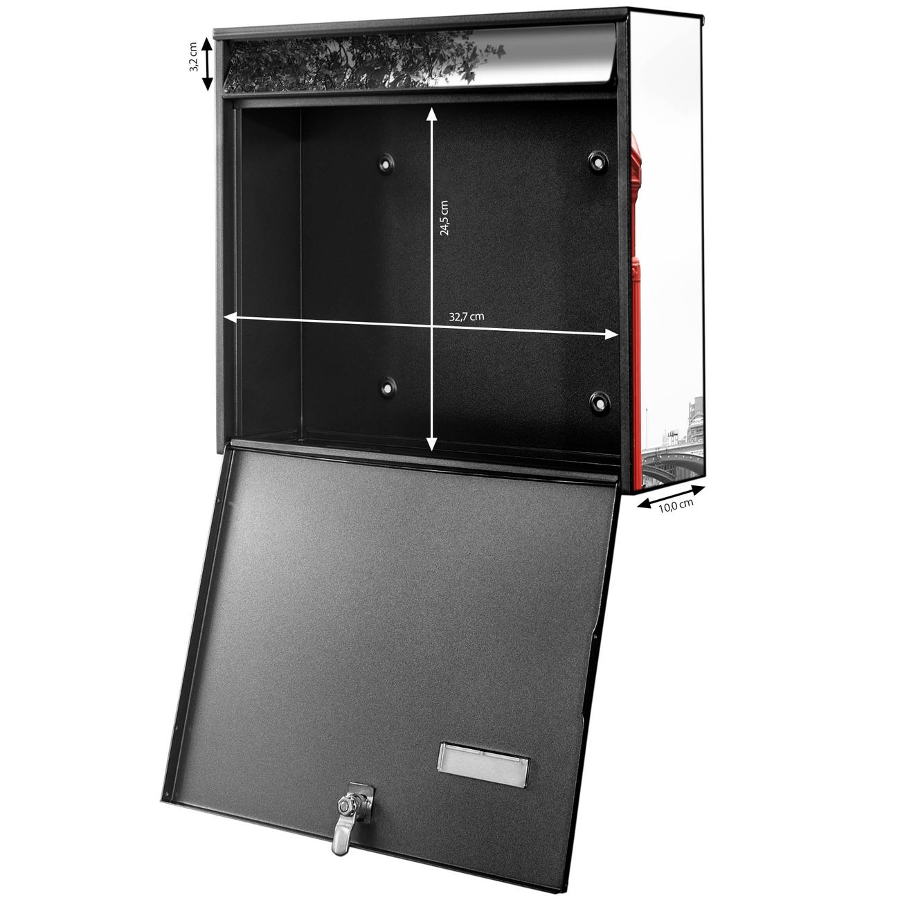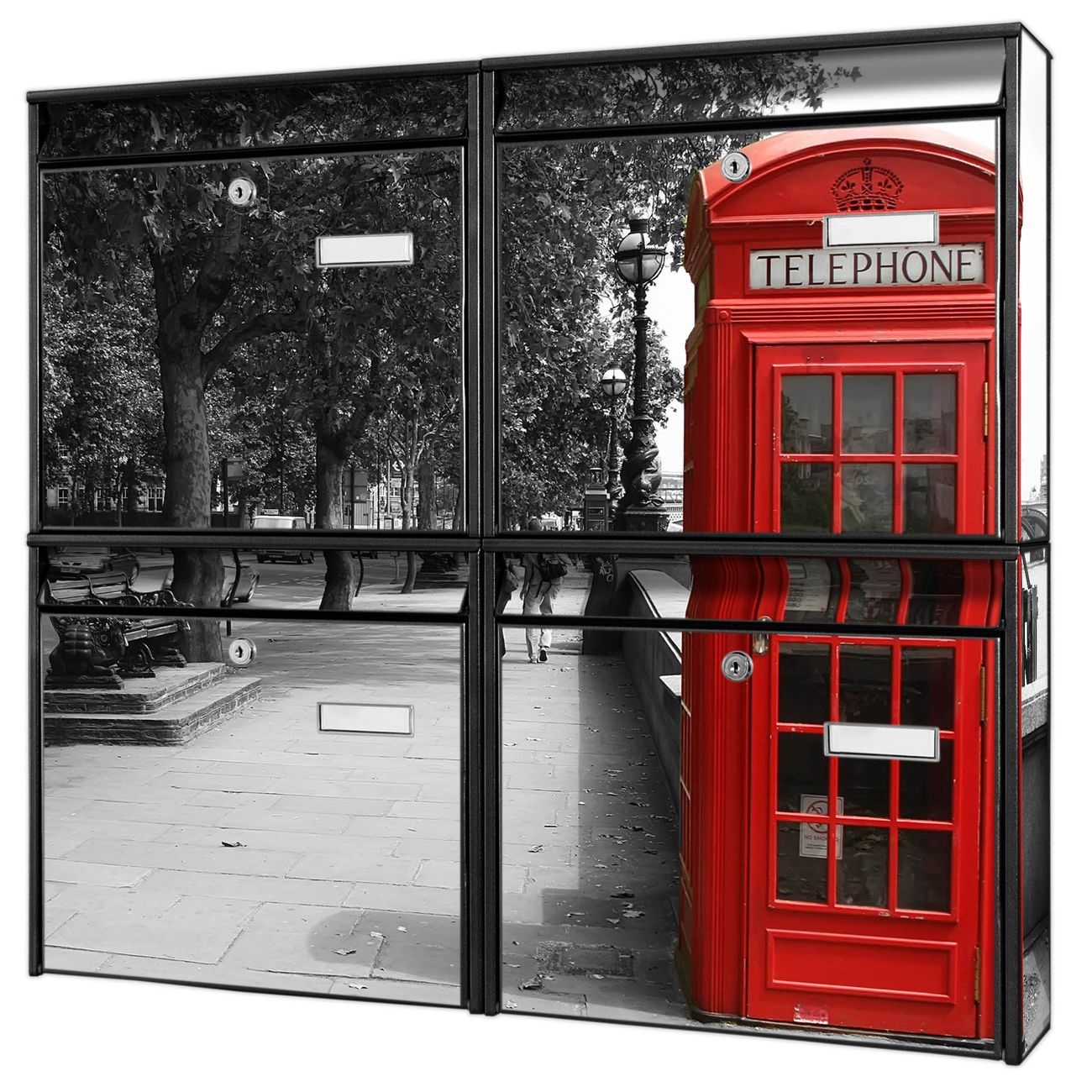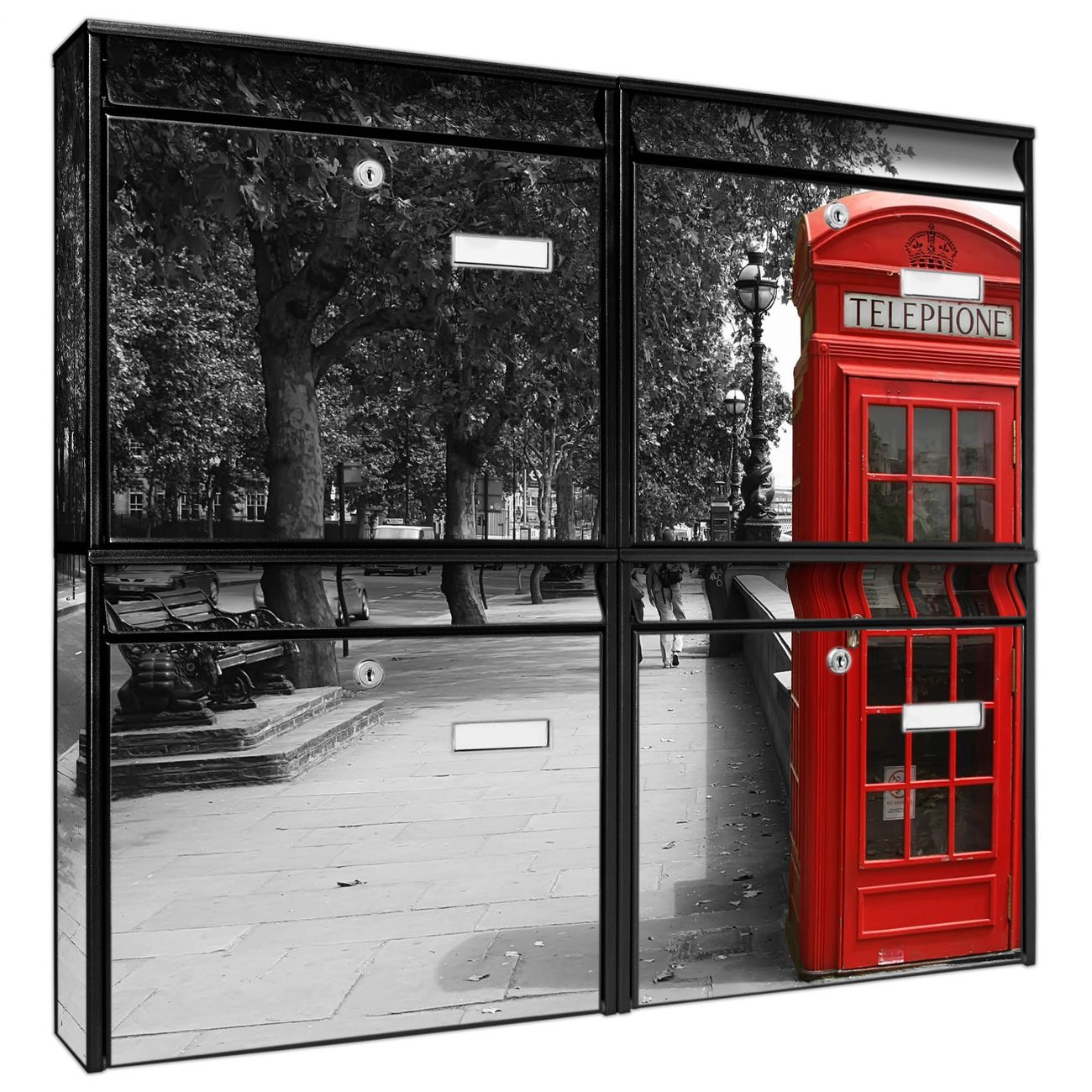 FUNKTION: Die Burg-Wächter Briefkastenanlage mit Motiv London Red Telephone bietet Ihnen ausreichend Fassungsvermögen um auch A4 und C4 Sendungen zu empfangen. Das integrierte Namensschild lässt sich individuell beschriften. Wählen Sie aus den Grundfarben weiß, silber und schwarz. DESIGN: Die 4 Briefkästen haben ein ansprechendes und zeitloses Design, ohne dabei auf Funktionalität zu verzichten. Das Material ist sehr stabil, wetterfest und rostfrei. Durch das Motiv London Red Telephone werden die Postkästen zu einem Blickfang. DETAILS: Die Postkästen bestehen aus verzinktem Stahl der zusätzlich mit Klarlack versiegelt wurde. Die Kästen sind gesamt 64,5cm hoch, 72,5cm breit und 10cm tief. Das Motiv besteht aus einer wetter- und UV-festen Folie, die Ihren Briefkasten zusätzlich vor Kratzern schützt. Die Postkästen werden mit Montagematerial, je einem Namensschild und je zwei Schlüsseln geliefert. NUTZEN: Das Briefkastenset eignet sich für die Wandmontage, die Größe bietet genügend Platz für Sendungen aller Art. Das zeitlose Design sowie die stabile Bauart bieten Ihnen einen treuen Begleiter für Ihre Post. BANJADO: