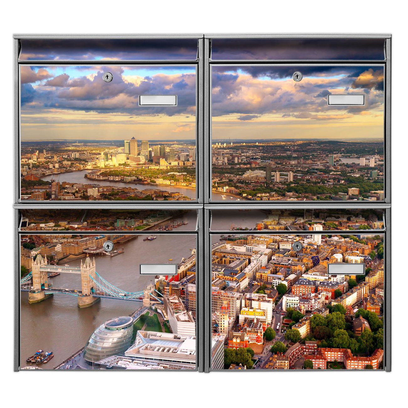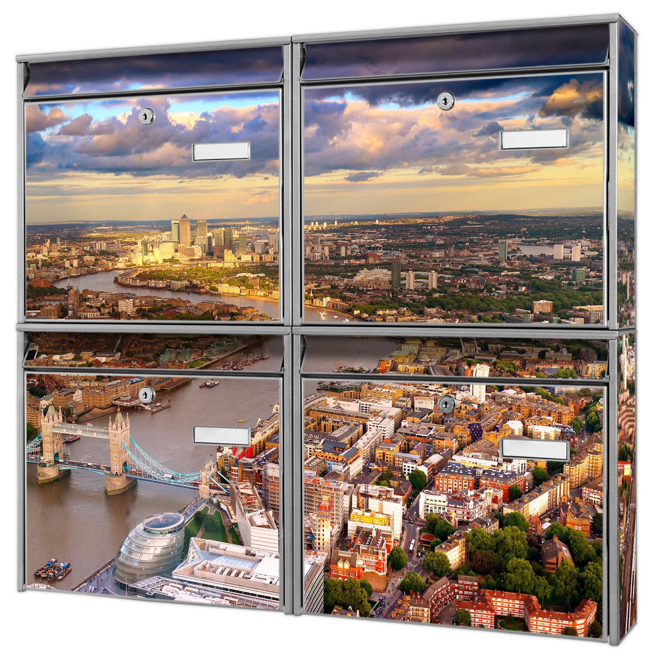 FUNKTION: Die Burg-Wächter Briefkastenanlage mit Motiv London bietet Ihnen ausreichend Fassungsvermögen um auch A4 und C4 Sendungen zu empfangen. Das integrierte Namensschild lässt sich individuell beschriften. Wählen Sie aus den Grundfarben weiß, silber und schwarz. DESIGN: Die 4 Briefkästen haben ein ansprechendes und zeitloses Design, ohne dabei auf Funktionalität zu verzichten. Das Material ist sehr stabil, wetterfest und rostfrei. Durch das Motiv London werden die Postkästen zu einem Blickfang. DETAILS: Die Postkästen bestehen aus verzinktem Stahl der zusätzlich mit Klarlack versiegelt wurde. Die Kästen sind gesamt 64,5cm hoch, 72,5cm breit und 10cm tief. Das Motiv besteht aus einer wetter- und UV-festen Folie, die Ihren Briefkasten zusätzlich vor Kratzern schützt. Die Postkästen werden mit Montagematerial, je einem Namensschild und je zwei Schlüsseln geliefert. NUTZEN: Das Briefkastenset eignet sich für die Wandmontage, die Größe bietet genügend Platz für Sendungen aller Art. Das zeitlose Design sowie die stabile Bauart bieten Ihnen einen treuen Begleiter für Ihre Post. BANJADO: