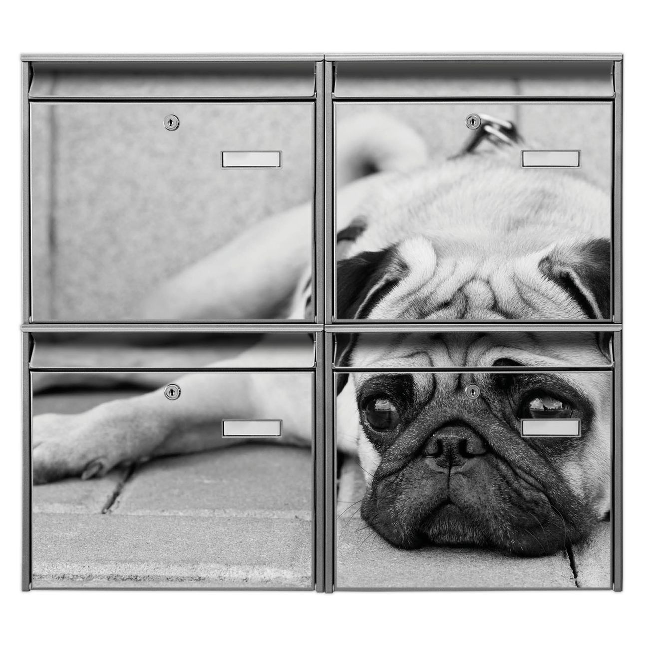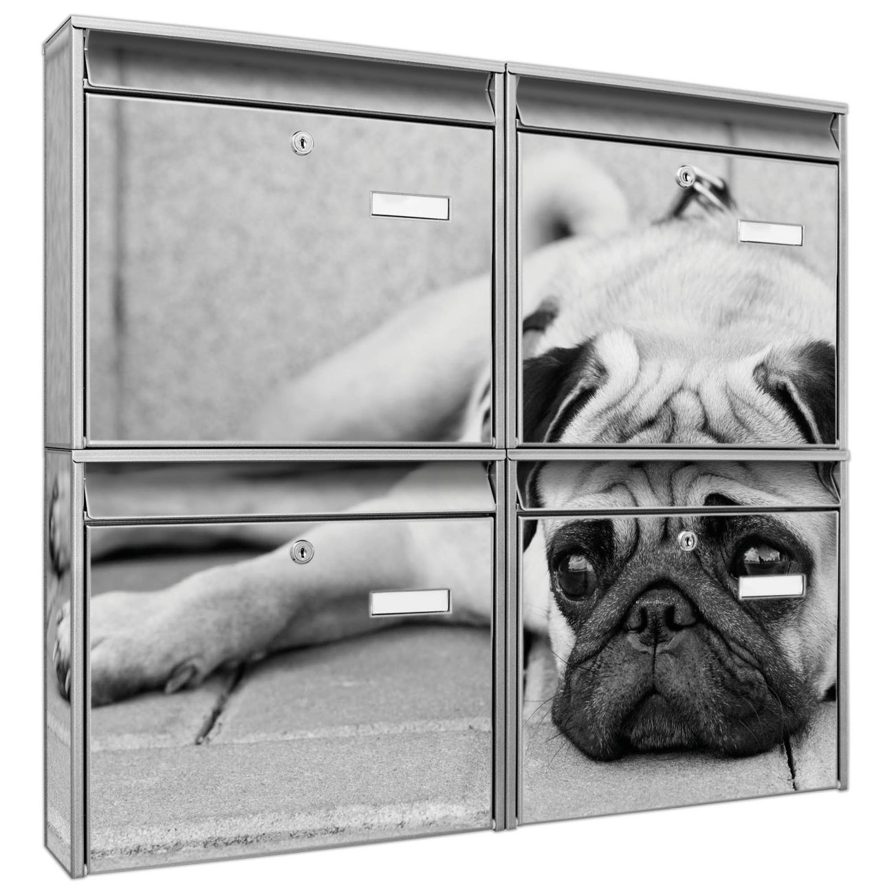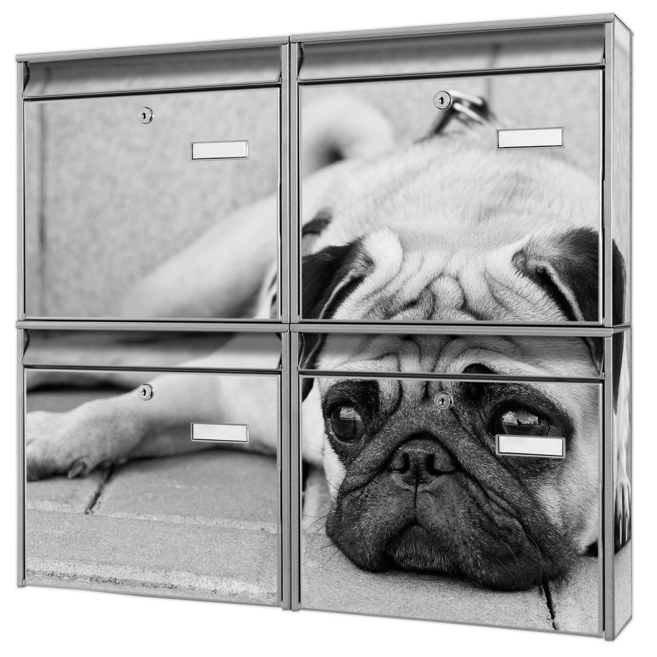 FUNKTION: Die Burg-Wächter Briefkastenanlage mit Motiv Lotty bietet Ihnen ausreichend Fassungsvermögen um auch A4 und C4 Sendungen zu empfangen. Das integrierte Namensschild lässt sich individuell beschriften. Wählen Sie aus den Grundfarben weiß, silber und schwarz. DESIGN: Die 4 Briefkästen haben ein ansprechendes und zeitloses Design, ohne dabei auf Funktionalität zu verzichten. Das Material ist sehr stabil, wetterfest und rostfrei. Durch das Motiv Lotty werden die Postkästen zu einem Blickfang. DETAILS: Die Postkästen bestehen aus verzinktem Stahl der zusätzlich mit Klarlack versiegelt wurde. Die Kästen sind gesamt 64,5cm hoch, 72,5cm breit und 10cm tief. Das Motiv besteht aus einer wetter- und UV-festen Folie, die Ihren Briefkasten zusätzlich vor Kratzern schützt. Die Postkästen werden mit Montagematerial, je einem Namensschild und je zwei Schlüsseln geliefert. NUTZEN: Das Briefkastenset eignet sich für die Wandmontage, die Größe bietet genügend Platz für Sendungen aller Art. Das zeitlose Design sowie die stabile Bauart bieten Ihnen einen treuen Begleiter für Ihre Post. BANJADO: