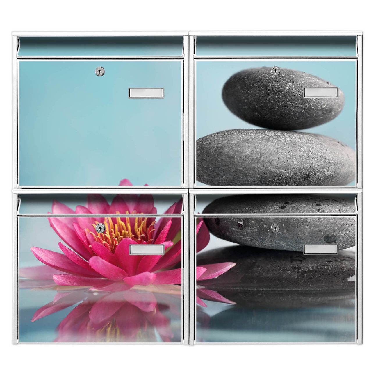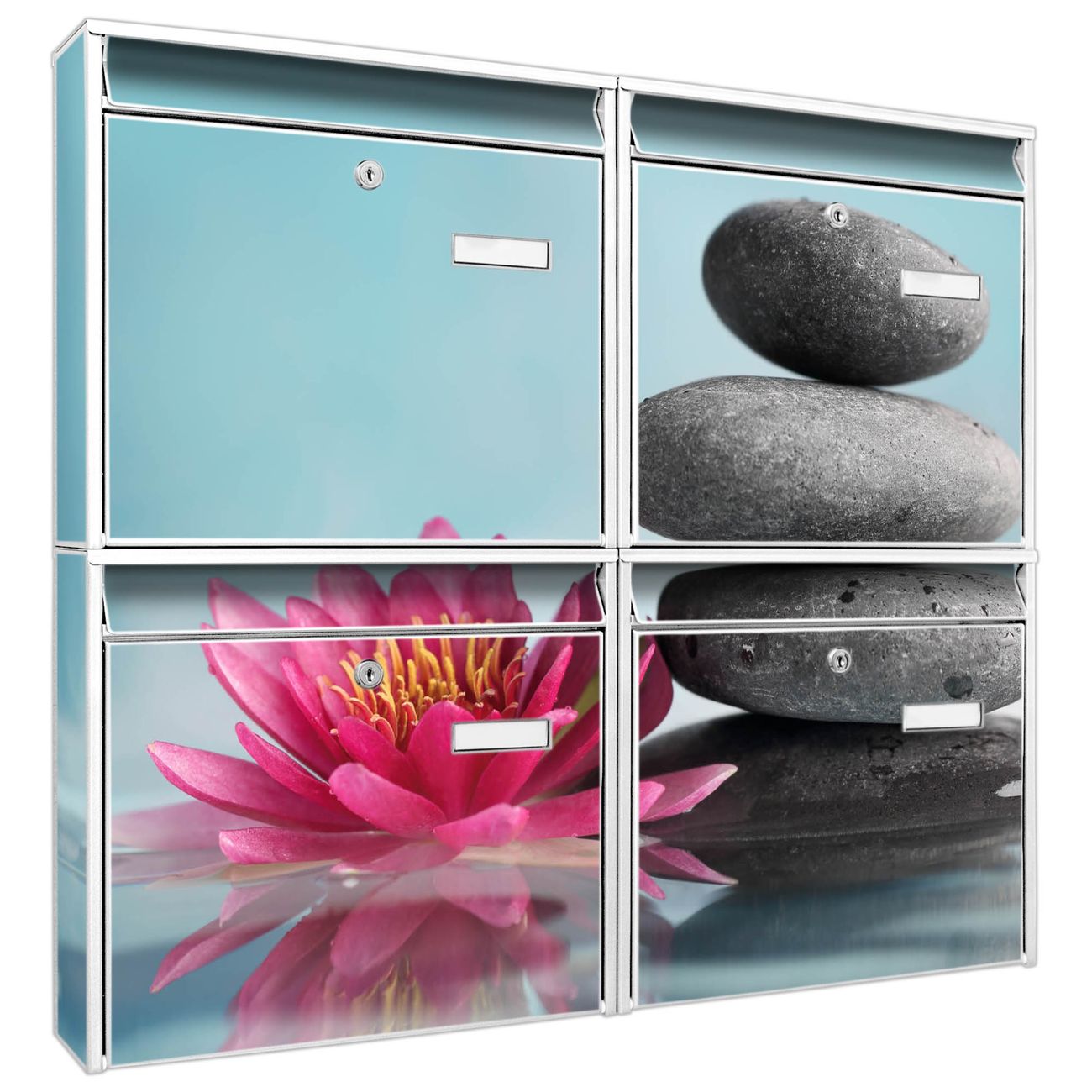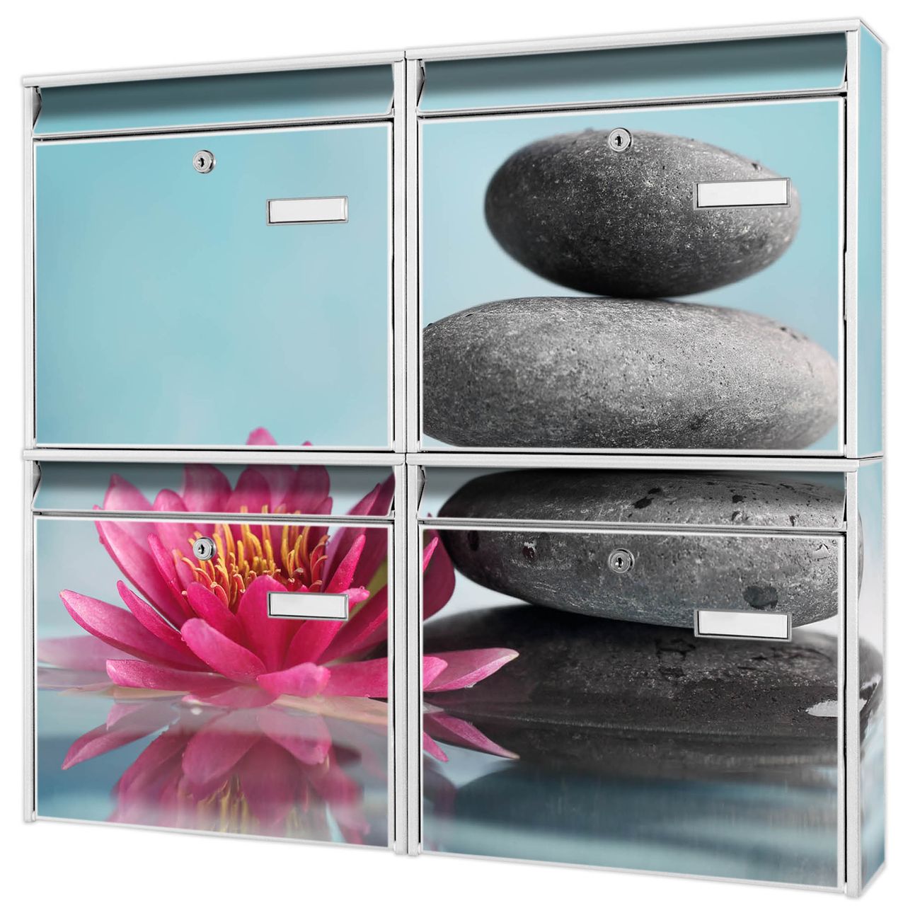 FUNKTION: Die Burg-Wächter Briefkastenanlage mit Motiv Lotus Und Steine bietet Ihnen ausreichend Fassungsvermögen um auch A4 und C4 Sendungen zu empfangen. Das integrierte Namensschild lässt sich individuell beschriften. Wählen Sie aus den Grundfarben weiß, silber und schwarz. DESIGN: Die 4 Briefkästen haben ein ansprechendes und zeitloses Design, ohne dabei auf Funktionalität zu verzichten. Das Material ist sehr stabil, wetterfest und rostfrei. Durch das Motiv Lotus Und Steine werden die Postkästen zu einem Blickfang. DETAILS: Die Postkästen bestehen aus verzinktem Stahl der zusätzlich mit Klarlack versiegelt wurde. Die Kästen sind gesamt 64,5cm hoch, 72,5cm breit und 10cm tief. Das Motiv besteht aus einer wetter- und UV-festen Folie, die Ihren Briefkasten zusätzlich vor Kratzern schützt. Die Postkästen werden mit Montagematerial, je einem Namensschild und je zwei Schlüsseln geliefert. NUTZEN: Das Briefkastenset eignet sich für die Wandmontage, die Größe bietet genügend Platz für Sendungen aller Art. Das zeitlose Design sowie die stabile Bauart bieten Ihnen einen treuen Begleiter für Ihre Post. BANJADO: