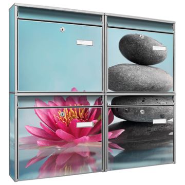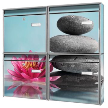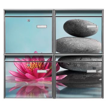 FUNKTION: Die Burg-Wächter Briefkastenanlage mit Motiv Lotus Und Steine bietet Ihnen ausreichend Fassungsvermögen um auch A4 und C4 Sendungen zu empfangen. Das integrierte Namensschild lässt sich individuell beschriften. Wählen Sie aus den Grundfarben weiß, silber und schwarz. DESIGN: Die 4 Briefkästen haben ein ansprechendes und zeitloses Design, ohne dabei auf Funktionalität zu verzichten. Das Material ist sehr stabil, wetterfest und rostfrei. Durch das Motiv Lotus Und Steine werden die Postkästen zu einem Blickfang. DETAILS: Die Postkästen bestehen aus verzinktem Stahl der zusätzlich mit Klarlack versiegelt wurde. Die Kästen sind gesamt 64,5cm hoch, 72,5cm breit und 10cm tief. Das Motiv besteht aus einer wetter- und UV-festen Folie, die Ihren Briefkasten zusätzlich vor Kratzern schützt. Die Postkästen werden mit Montagematerial, je einem Namensschild und je zwei Schlüsseln geliefert. NUTZEN: Das Briefkastenset eignet sich für die Wandmontage, die Größe bietet genügend Platz für Sendungen aller Art. Das zeitlose Design sowie die stabile Bauart bieten Ihnen einen treuen Begleiter für Ihre Post. BANJADO: