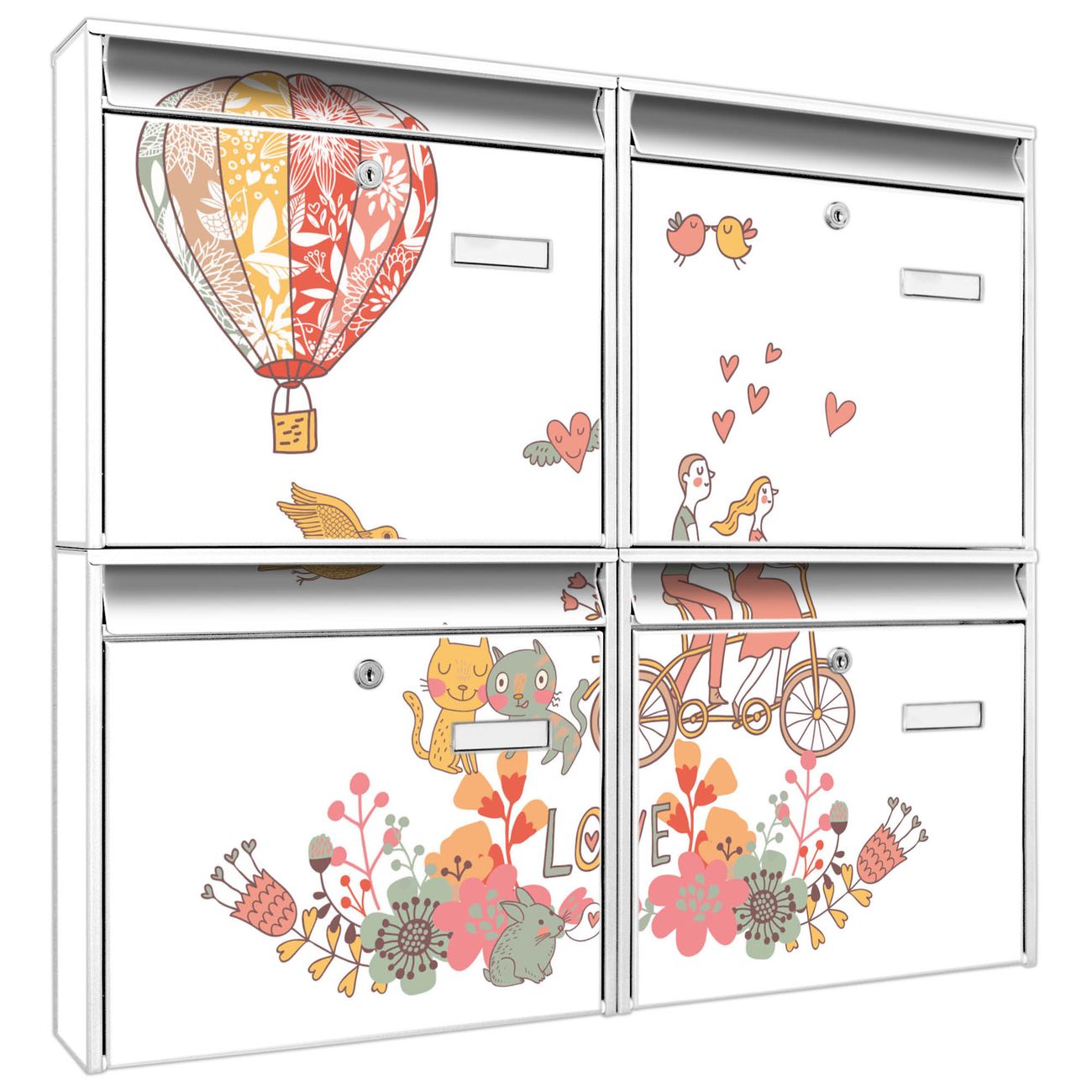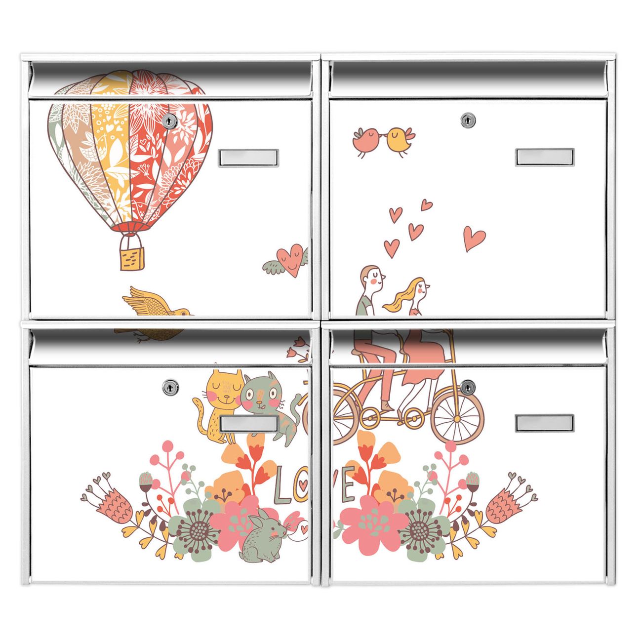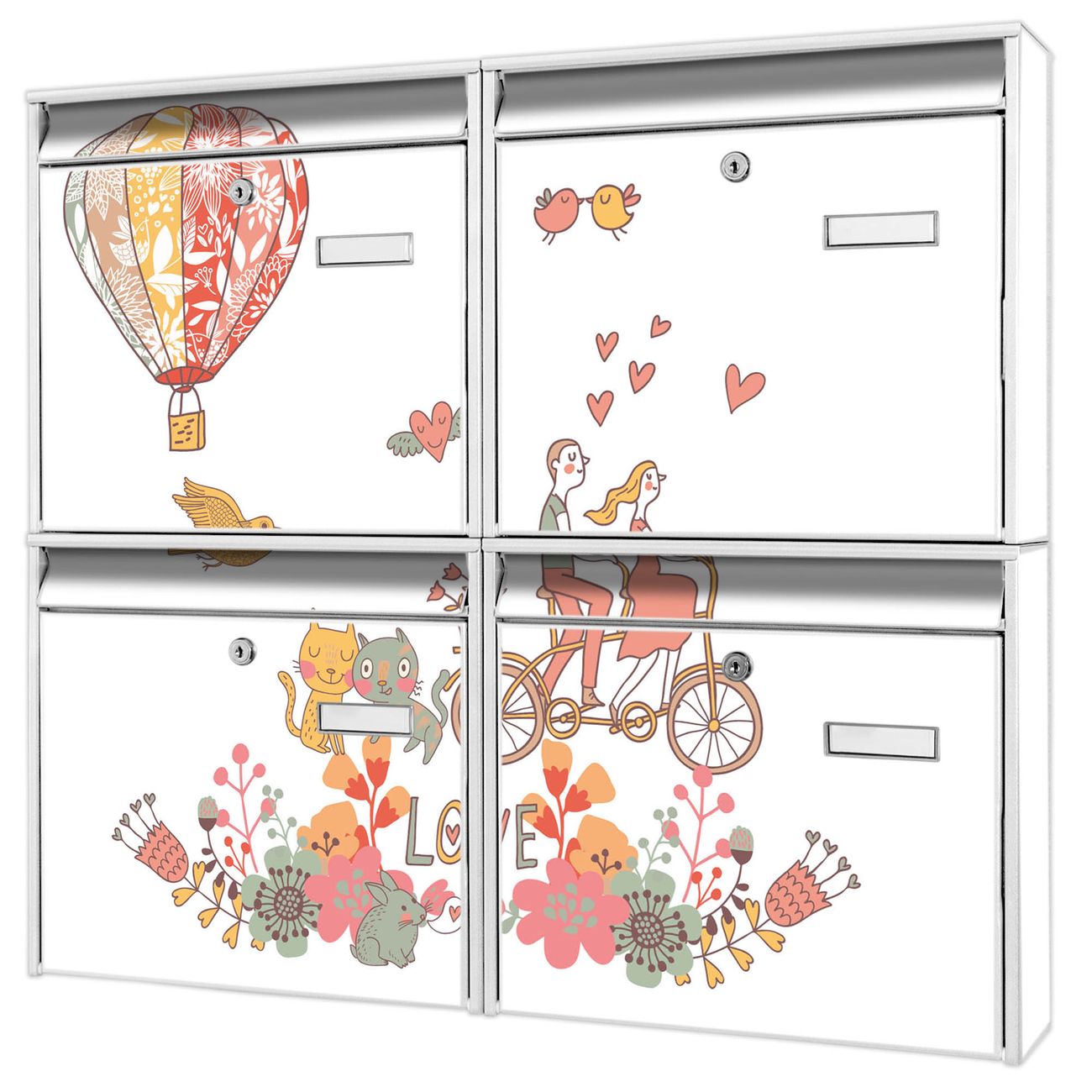 FUNKTION: Die Burg-Wächter Briefkastenanlage mit Motiv Love bietet Ihnen ausreichend Fassungsvermögen um auch A4 und C4 Sendungen zu empfangen. Das integrierte Namensschild lässt sich individuell beschriften. Wählen Sie aus den Grundfarben weiß, silber und schwarz. DESIGN: Die 4 Briefkästen haben ein ansprechendes und zeitloses Design, ohne dabei auf Funktionalität zu verzichten. Das Material ist sehr stabil, wetterfest und rostfrei. Durch das Motiv Love werden die Postkästen zu einem Blickfang. DETAILS: Die Postkästen bestehen aus verzinktem Stahl der zusätzlich mit Klarlack versiegelt wurde. Die Kästen sind gesamt 64,5cm hoch, 72,5cm breit und 10cm tief. Das Motiv besteht aus einer wetter- und UV-festen Folie, die Ihren Briefkasten zusätzlich vor Kratzern schützt. Die Postkästen werden mit Montagematerial, je einem Namensschild und je zwei Schlüsseln geliefert. NUTZEN: Das Briefkastenset eignet sich für die Wandmontage, die Größe bietet genügend Platz für Sendungen aller Art. Das zeitlose Design sowie die stabile Bauart bieten Ihnen einen treuen Begleiter für Ihre Post. BANJADO: