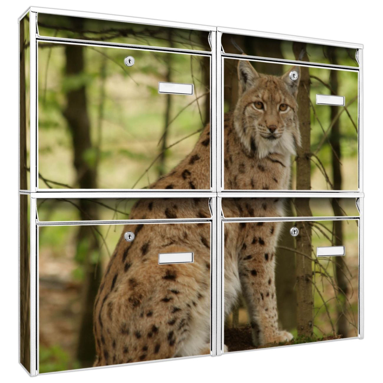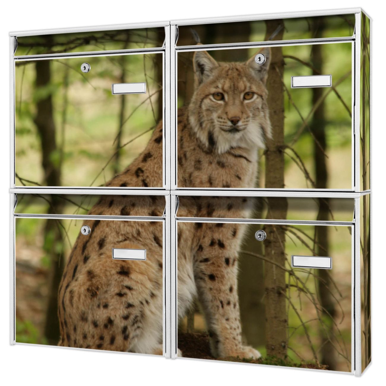 FUNKTION: Die Burg-Wächter Briefkastenanlage mit Motiv Luchs bietet Ihnen ausreichend Fassungsvermögen um auch A4 und C4 Sendungen zu empfangen. Das integrierte Namensschild lässt sich individuell beschriften. Wählen Sie aus den Grundfarben weiß, silber und schwarz. DESIGN: Die 4 Briefkästen haben ein ansprechendes und zeitloses Design, ohne dabei auf Funktionalität zu verzichten. Das Material ist sehr stabil, wetterfest und rostfrei. Durch das Motiv Luchs werden die Postkästen zu einem Blickfang. DETAILS: Die Postkästen bestehen aus verzinktem Stahl der zusätzlich mit Klarlack versiegelt wurde. Die Kästen sind gesamt 64,5cm hoch, 72,5cm breit und 10cm tief. Das Motiv besteht aus einer wetter- und UV-festen Folie, die Ihren Briefkasten zusätzlich vor Kratzern schützt. Die Postkästen werden mit Montagematerial, je einem Namensschild und je zwei Schlüsseln geliefert. NUTZEN: Das Briefkastenset eignet sich für die Wandmontage, die Größe bietet genügend Platz für Sendungen aller Art. Das zeitlose Design sowie die stabile Bauart bieten Ihnen einen treuen Begleiter für Ihre Post. BANJADO: