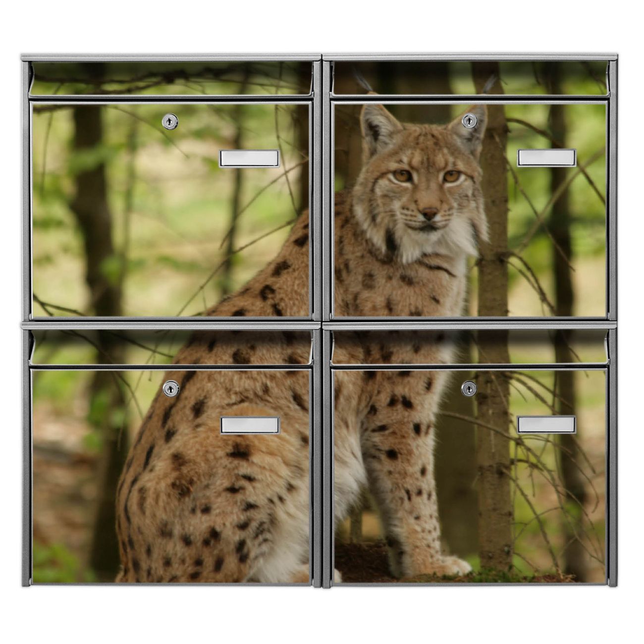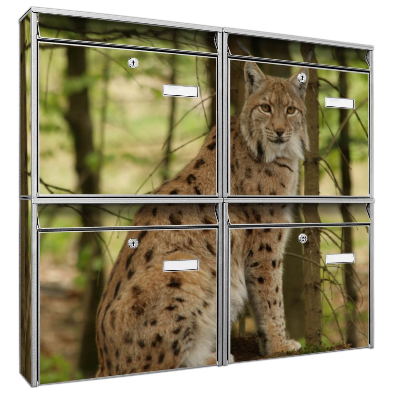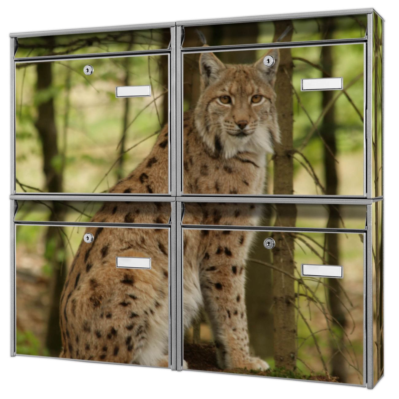 FUNKTION: Die Burg-Wächter Briefkastenanlage mit Motiv Luchs bietet Ihnen ausreichend Fassungsvermögen um auch A4 und C4 Sendungen zu empfangen. Das integrierte Namensschild lässt sich individuell beschriften. Wählen Sie aus den Grundfarben weiß, silber und schwarz. DESIGN: Die 4 Briefkästen haben ein ansprechendes und zeitloses Design, ohne dabei auf Funktionalität zu verzichten. Das Material ist sehr stabil, wetterfest und rostfrei. Durch das Motiv Luchs werden die Postkästen zu einem Blickfang. DETAILS: Die Postkästen bestehen aus verzinktem Stahl der zusätzlich mit Klarlack versiegelt wurde. Die Kästen sind gesamt 64,5cm hoch, 72,5cm breit und 10cm tief. Das Motiv besteht aus einer wetter- und UV-festen Folie, die Ihren Briefkasten zusätzlich vor Kratzern schützt. Die Postkästen werden mit Montagematerial, je einem Namensschild und je zwei Schlüsseln geliefert. NUTZEN: Das Briefkastenset eignet sich für die Wandmontage, die Größe bietet genügend Platz für Sendungen aller Art. Das zeitlose Design sowie die stabile Bauart bieten Ihnen einen treuen Begleiter für Ihre Post. BANJADO: