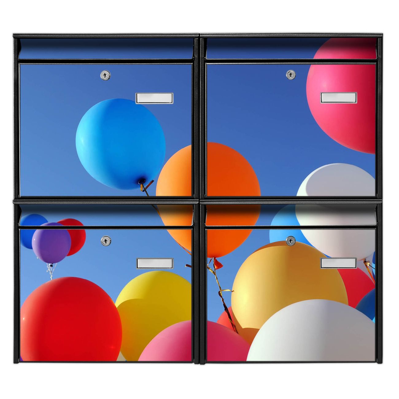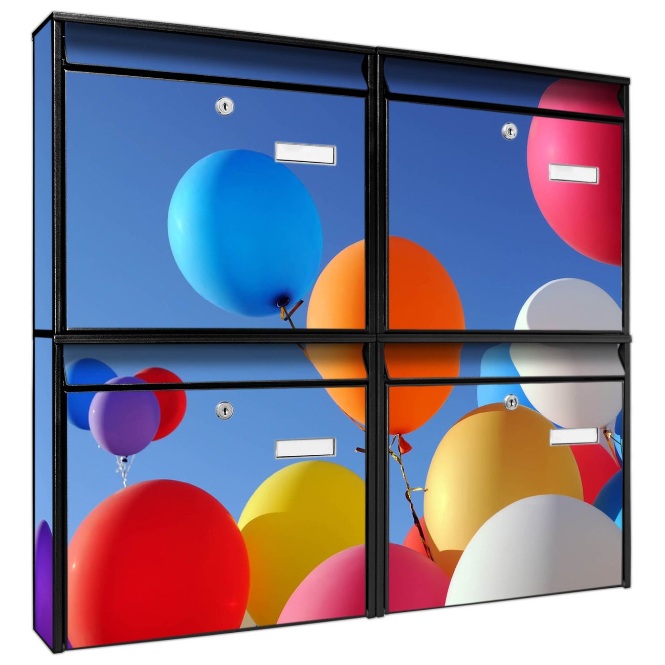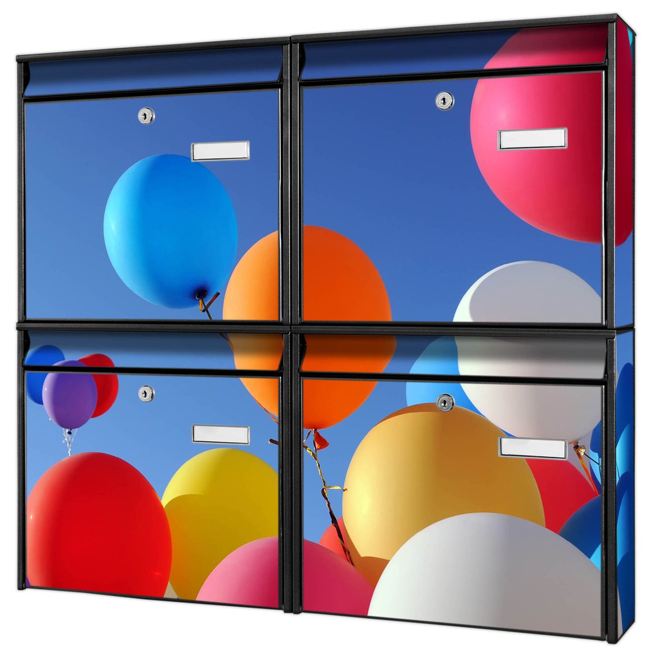 FUNKTION: Die Burg-Wächter Briefkastenanlage mit Motiv Luftballons bietet Ihnen ausreichend Fassungsvermögen um auch A4 und C4 Sendungen zu empfangen. Das integrierte Namensschild lässt sich individuell beschriften. Wählen Sie aus den Grundfarben weiß, silber und schwarz. DESIGN: Die 4 Briefkästen haben ein ansprechendes und zeitloses Design, ohne dabei auf Funktionalität zu verzichten. Das Material ist sehr stabil, wetterfest und rostfrei. Durch das Motiv Luftballons werden die Postkästen zu einem Blickfang. DETAILS: Die Postkästen bestehen aus verzinktem Stahl der zusätzlich mit Klarlack versiegelt wurde. Die Kästen sind gesamt 64,5cm hoch, 72,5cm breit und 10cm tief. Das Motiv besteht aus einer wetter- und UV-festen Folie, die Ihren Briefkasten zusätzlich vor Kratzern schützt. Die Postkästen werden mit Montagematerial, je einem Namensschild und je zwei Schlüsseln geliefert. NUTZEN: Das Briefkastenset eignet sich für die Wandmontage, die Größe bietet genügend Platz für Sendungen aller Art. Das zeitlose Design sowie die stabile Bauart bieten Ihnen einen treuen Begleiter für Ihre Post. BANJADO: