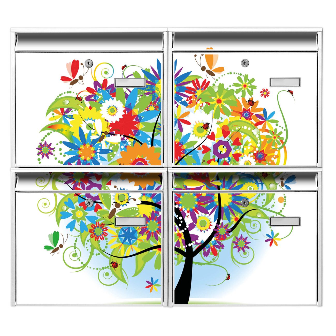 FUNKTION: Die Burg-Wächter Briefkastenanlage mit Motiv Märchenzauberbaum bietet Ihnen ausreichend Fassungsvermögen um auch A4 und C4 Sendungen zu empfangen. Das integrierte Namensschild lässt sich individuell beschriften. Wählen Sie aus den Grundfarben weiß, silber und schwarz. DESIGN: Die 4 Briefkästen haben ein ansprechendes und zeitloses Design, ohne dabei auf Funktionalität zu verzichten. Das Material ist sehr stabil, wetterfest und rostfrei. Durch das Motiv Märchenzauberbaum werden die Postkästen zu einem Blickfang. DETAILS: Die Postkästen bestehen aus verzinktem Stahl der zusätzlich mit Klarlack versiegelt wurde. Die Kästen sind gesamt 64,5cm hoch, 72,5cm breit und 10cm tief. Das Motiv besteht aus einer wetter- und UV-festen Folie, die Ihren Briefkasten zusätzlich vor Kratzern schützt. Die Postkästen werden mit Montagematerial, je einem Namensschild und je zwei Schlüsseln geliefert. NUTZEN: Das Briefkastenset eignet sich für die Wandmontage, die Größe bietet genügend Platz für Sendungen aller Art. Das zeitlose Design sowie die stabile Bauart bieten Ihnen einen treuen Begleiter für Ihre Post. BANJADO: