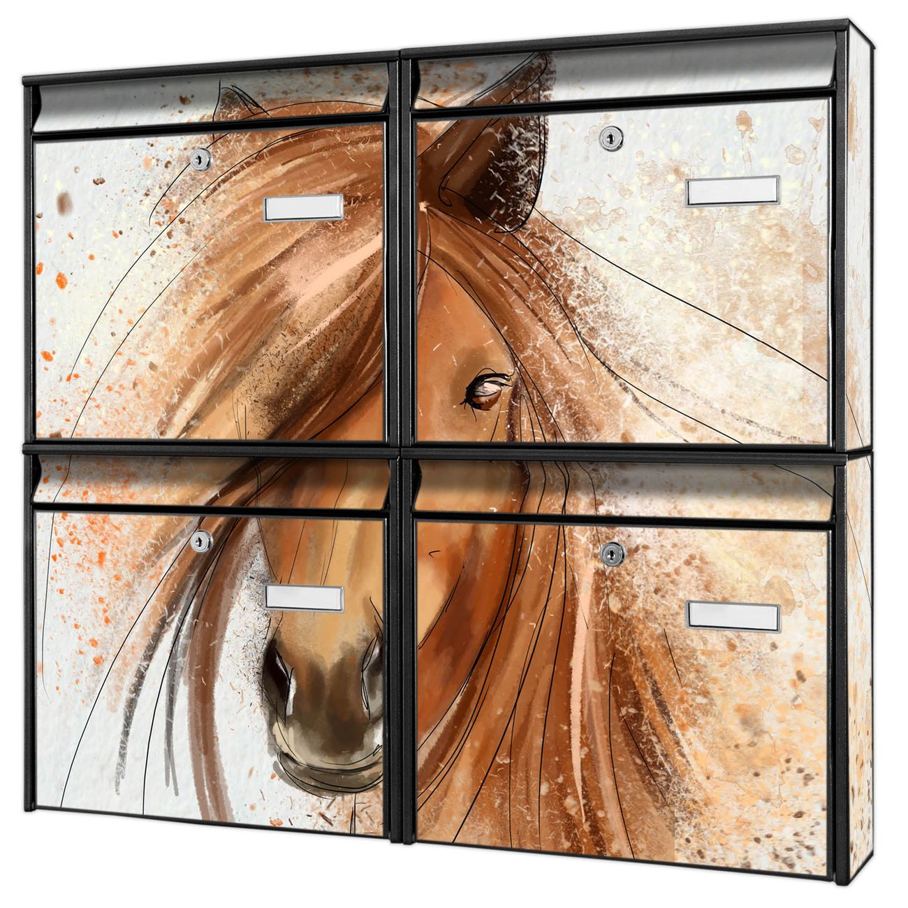 FUNKTION: Die Burg-Wächter Briefkastenanlage mit Motiv Magic Horse bietet Ihnen ausreichend Fassungsvermögen um auch A4 und C4 Sendungen zu empfangen. Das integrierte Namensschild lässt sich individuell beschriften. Wählen Sie aus den Grundfarben weiß, silber und schwarz. DESIGN: Die 4 Briefkästen haben ein ansprechendes und zeitloses Design, ohne dabei auf Funktionalität zu verzichten. Das Material ist sehr stabil, wetterfest und rostfrei. Durch das Motiv Magic Horse werden die Postkästen zu einem Blickfang. DETAILS: Die Postkästen bestehen aus verzinktem Stahl der zusätzlich mit Klarlack versiegelt wurde. Die Kästen sind gesamt 64,5cm hoch, 72,5cm breit und 10cm tief. Das Motiv besteht aus einer wetter- und UV-festen Folie, die Ihren Briefkasten zusätzlich vor Kratzern schützt. Die Postkästen werden mit Montagematerial, je einem Namensschild und je zwei Schlüsseln geliefert. NUTZEN: Das Briefkastenset eignet sich für die Wandmontage, die Größe bietet genügend Platz für Sendungen aller Art. Das zeitlose Design sowie die stabile Bauart bieten Ihnen einen treuen Begleiter für Ihre Post. BANJADO: