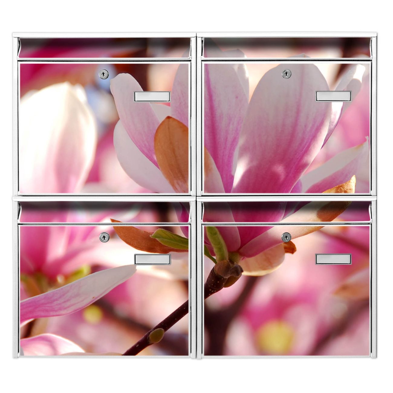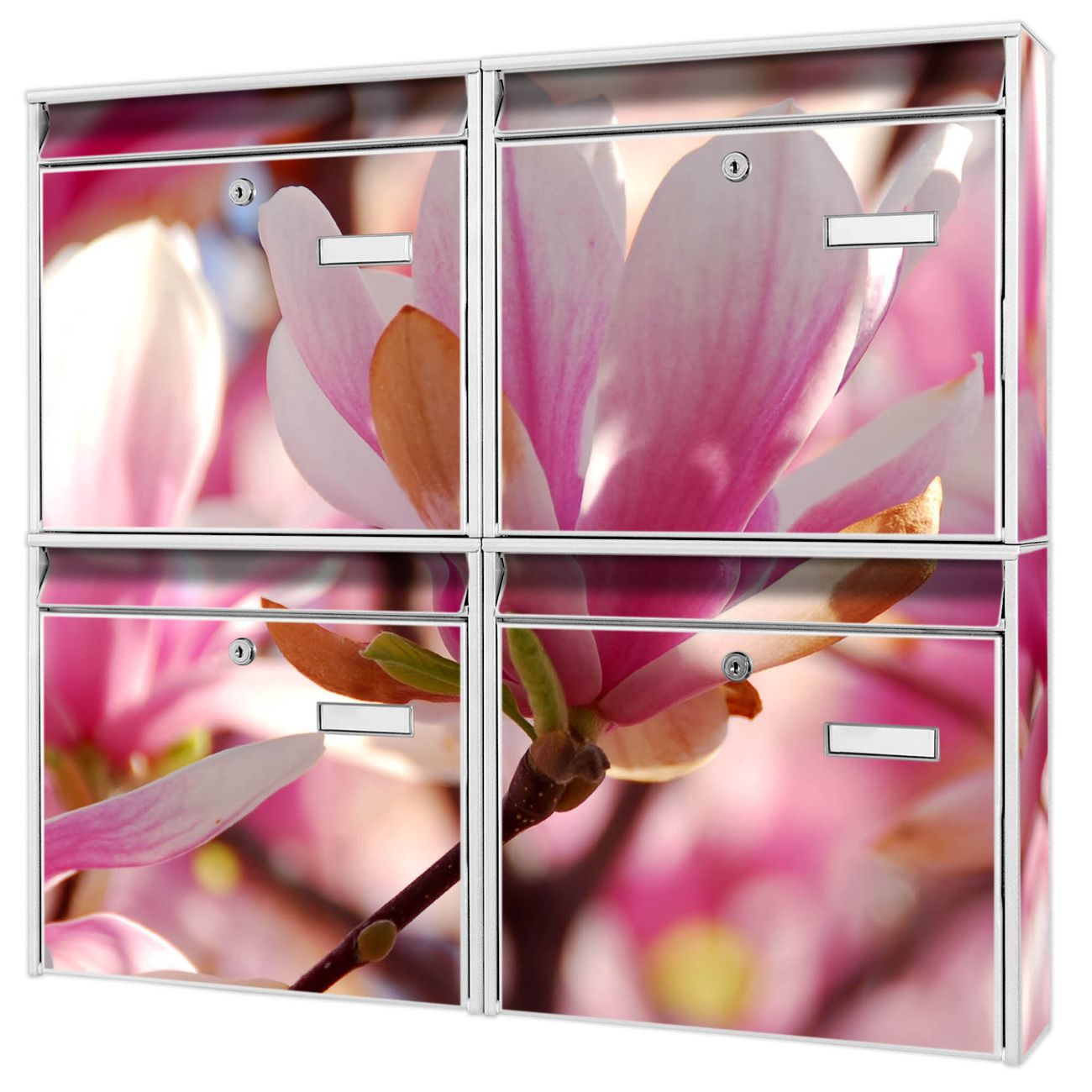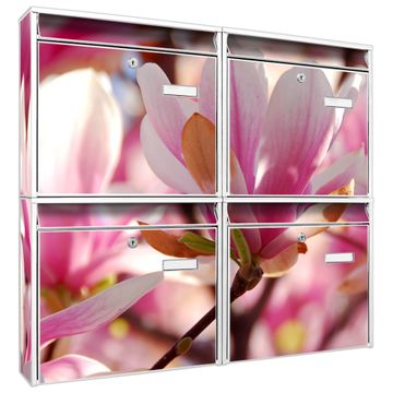 FUNKTION: Die Burg-Wächter Briefkastenanlage mit Motiv Magnolia bietet Ihnen ausreichend Fassungsvermögen um auch A4 und C4 Sendungen zu empfangen. Das integrierte Namensschild lässt sich individuell beschriften. Wählen Sie aus den Grundfarben weiß, silber und schwarz. DESIGN: Die 4 Briefkästen haben ein ansprechendes und zeitloses Design, ohne dabei auf Funktionalität zu verzichten. Das Material ist sehr stabil, wetterfest und rostfrei. Durch das Motiv Magnolia werden die Postkästen zu einem Blickfang. DETAILS: Die Postkästen bestehen aus verzinktem Stahl der zusätzlich mit Klarlack versiegelt wurde. Die Kästen sind gesamt 64,5cm hoch, 72,5cm breit und 10cm tief. Das Motiv besteht aus einer wetter- und UV-festen Folie, die Ihren Briefkasten zusätzlich vor Kratzern schützt. Die Postkästen werden mit Montagematerial, je einem Namensschild und je zwei Schlüsseln geliefert. NUTZEN: Das Briefkastenset eignet sich für die Wandmontage, die Größe bietet genügend Platz für Sendungen aller Art. Das zeitlose Design sowie die stabile Bauart bieten Ihnen einen treuen Begleiter für Ihre Post. BANJADO:
