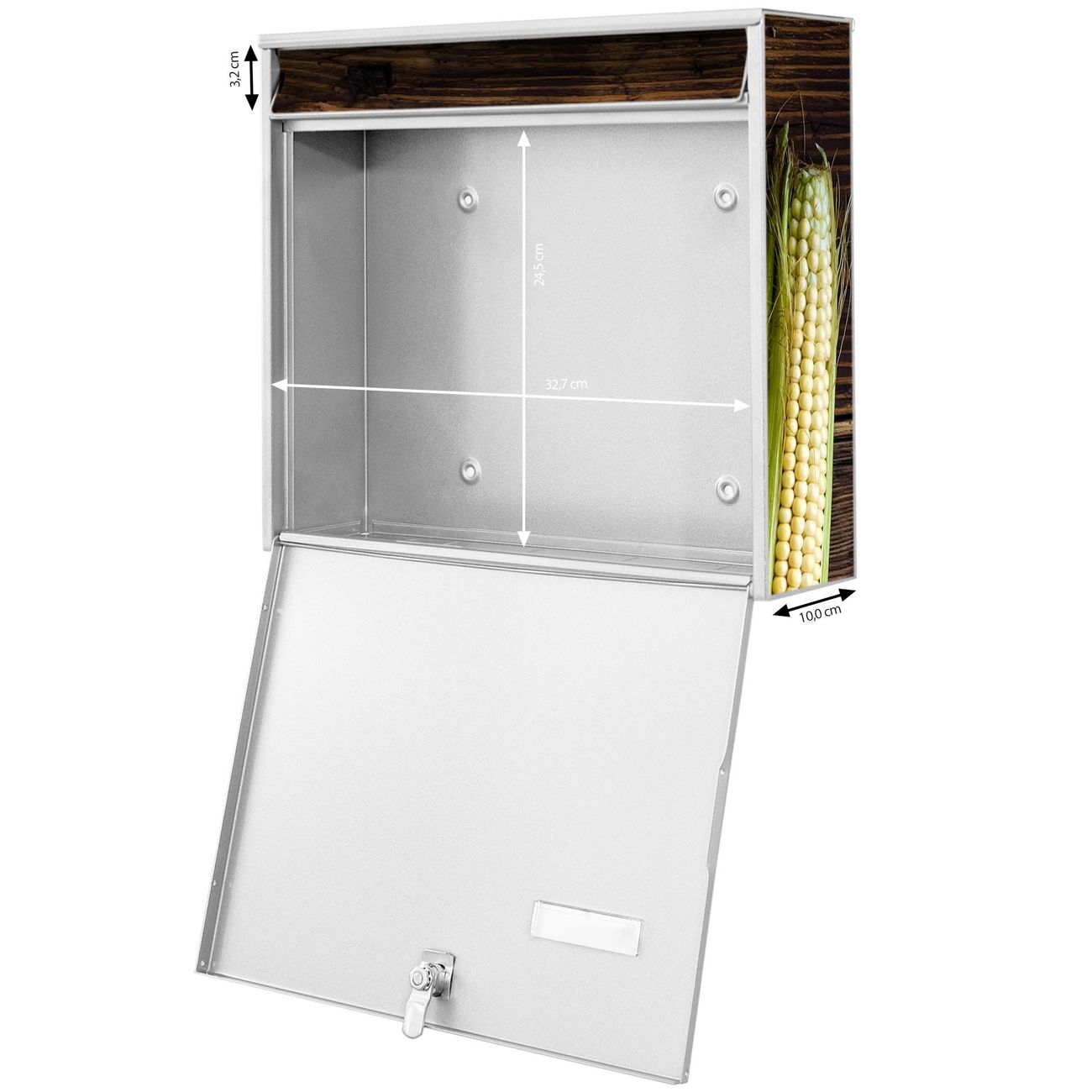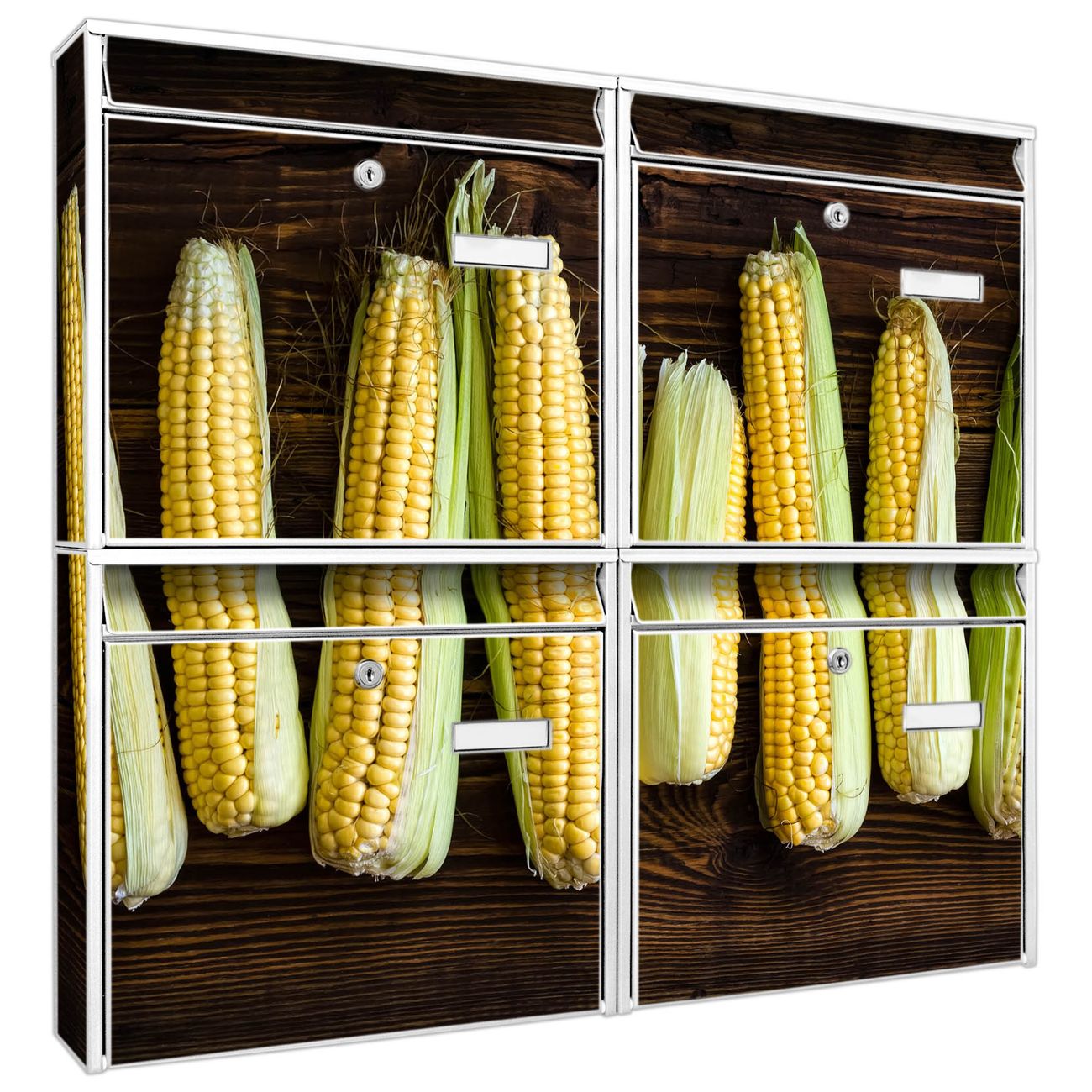 FUNKTION: Die Burg-Wächter Briefkastenanlage mit Motiv Maiskolben bietet Ihnen ausreichend Fassungsvermögen um auch A4 und C4 Sendungen zu empfangen. Das integrierte Namensschild lässt sich individuell beschriften. Wählen Sie aus den Grundfarben weiß, silber und schwarz. DESIGN: Die 4 Briefkästen haben ein ansprechendes und zeitloses Design, ohne dabei auf Funktionalität zu verzichten. Das Material ist sehr stabil, wetterfest und rostfrei. Durch das Motiv Maiskolben werden die Postkästen zu einem Blickfang. DETAILS: Die Postkästen bestehen aus verzinktem Stahl der zusätzlich mit Klarlack versiegelt wurde. Die Kästen sind gesamt 64,5cm hoch, 72,5cm breit und 10cm tief. Das Motiv besteht aus einer wetter- und UV-festen Folie, die Ihren Briefkasten zusätzlich vor Kratzern schützt. Die Postkästen werden mit Montagematerial, je einem Namensschild und je zwei Schlüsseln geliefert. NUTZEN: Das Briefkastenset eignet sich für die Wandmontage, die Größe bietet genügend Platz für Sendungen aller Art. Das zeitlose Design sowie die stabile Bauart bieten Ihnen einen treuen Begleiter für Ihre Post. BANJADO: