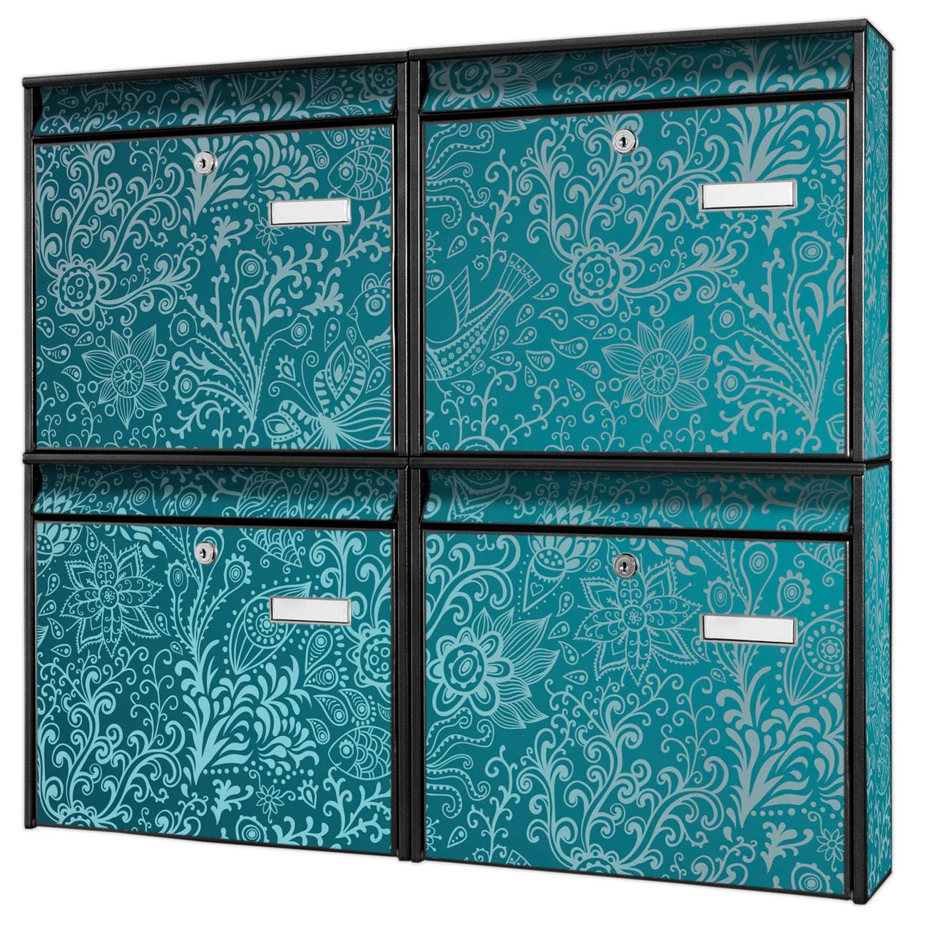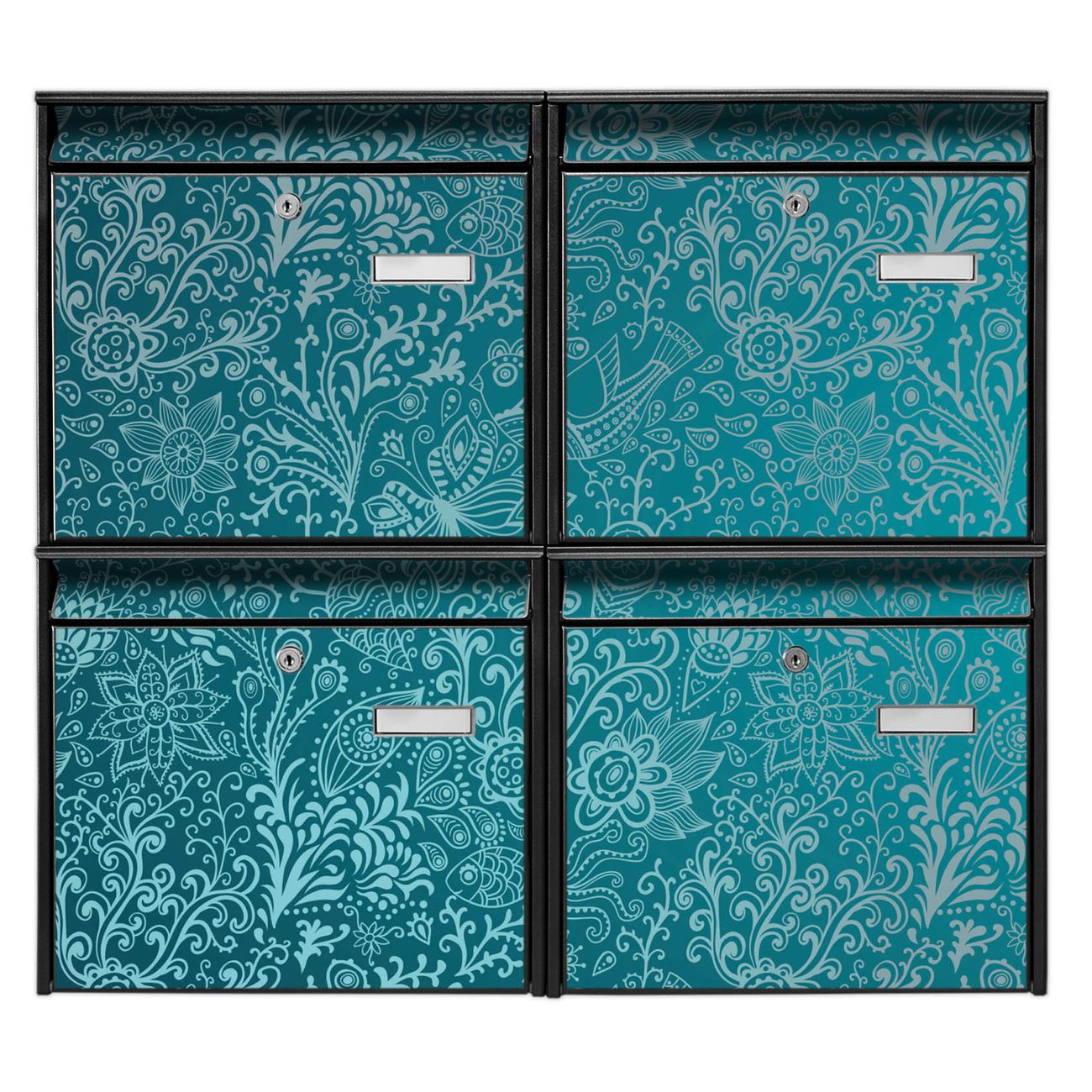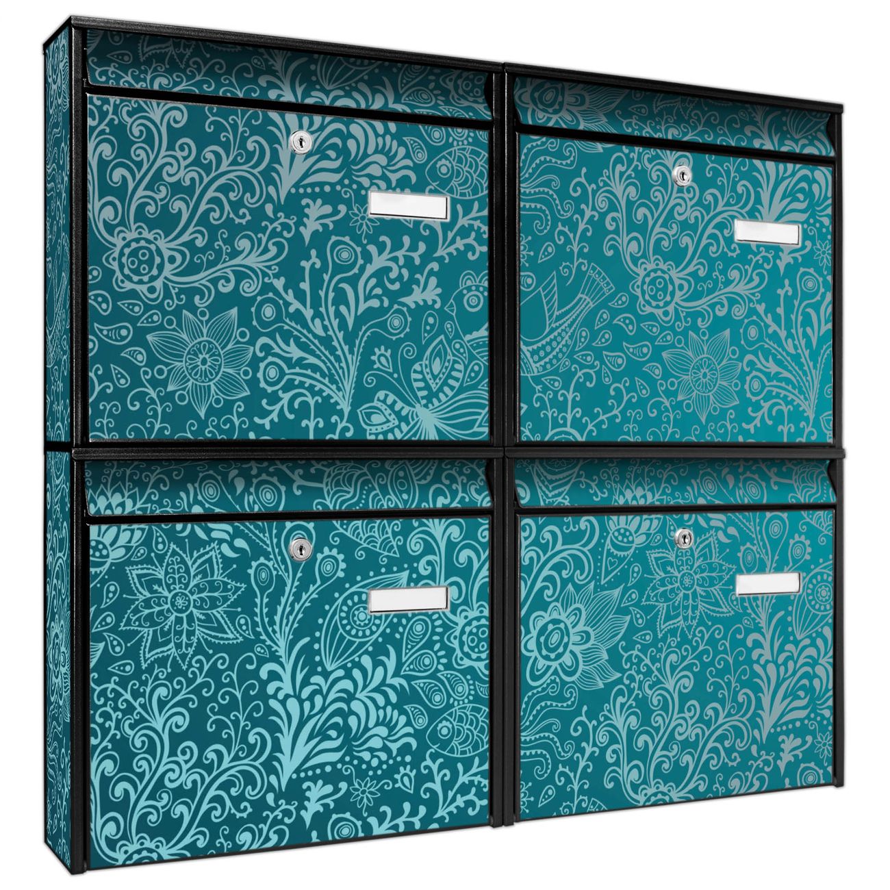 FUNKTION: Die Burg-Wächter Briefkastenanlage mit Motiv Mandala Landschaft bietet Ihnen ausreichend Fassungsvermögen um auch A4 und C4 Sendungen zu empfangen. Das integrierte Namensschild lässt sich individuell beschriften. Wählen Sie aus den Grundfarben weiß, silber und schwarz. DESIGN: Die 4 Briefkästen haben ein ansprechendes und zeitloses Design, ohne dabei auf Funktionalität zu verzichten. Das Material ist sehr stabil, wetterfest und rostfrei. Durch das Motiv Mandala Landschaft werden die Postkästen zu einem Blickfang. DETAILS: Die Postkästen bestehen aus verzinktem Stahl der zusätzlich mit Klarlack versiegelt wurde. Die Kästen sind gesamt 64,5cm hoch, 72,5cm breit und 10cm tief. Das Motiv besteht aus einer wetter- und UV-festen Folie, die Ihren Briefkasten zusätzlich vor Kratzern schützt. Die Postkästen werden mit Montagematerial, je einem Namensschild und je zwei Schlüsseln geliefert. NUTZEN: Das Briefkastenset eignet sich für die Wandmontage, die Größe bietet genügend Platz für Sendungen aller Art. Das zeitlose Design sowie die stabile Bauart bieten Ihnen einen treuen Begleiter für Ihre Post. BANJADO: