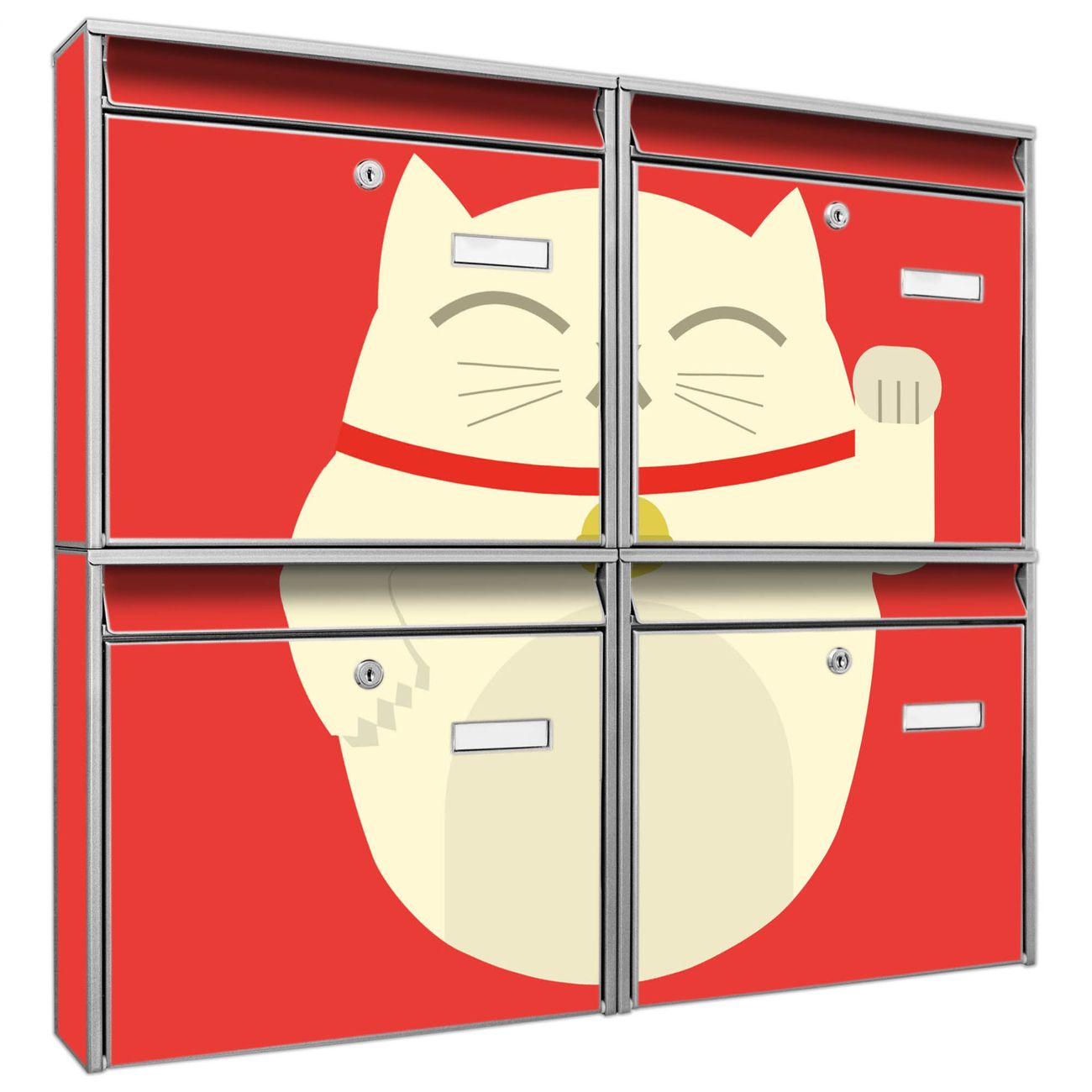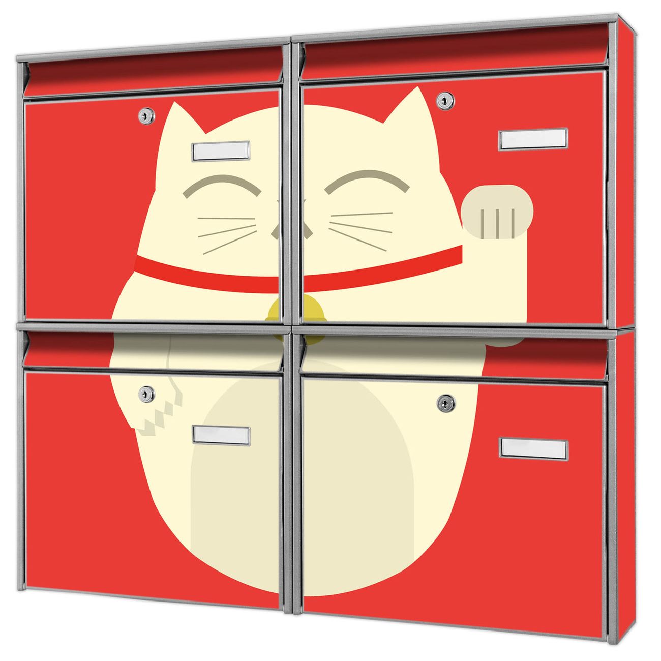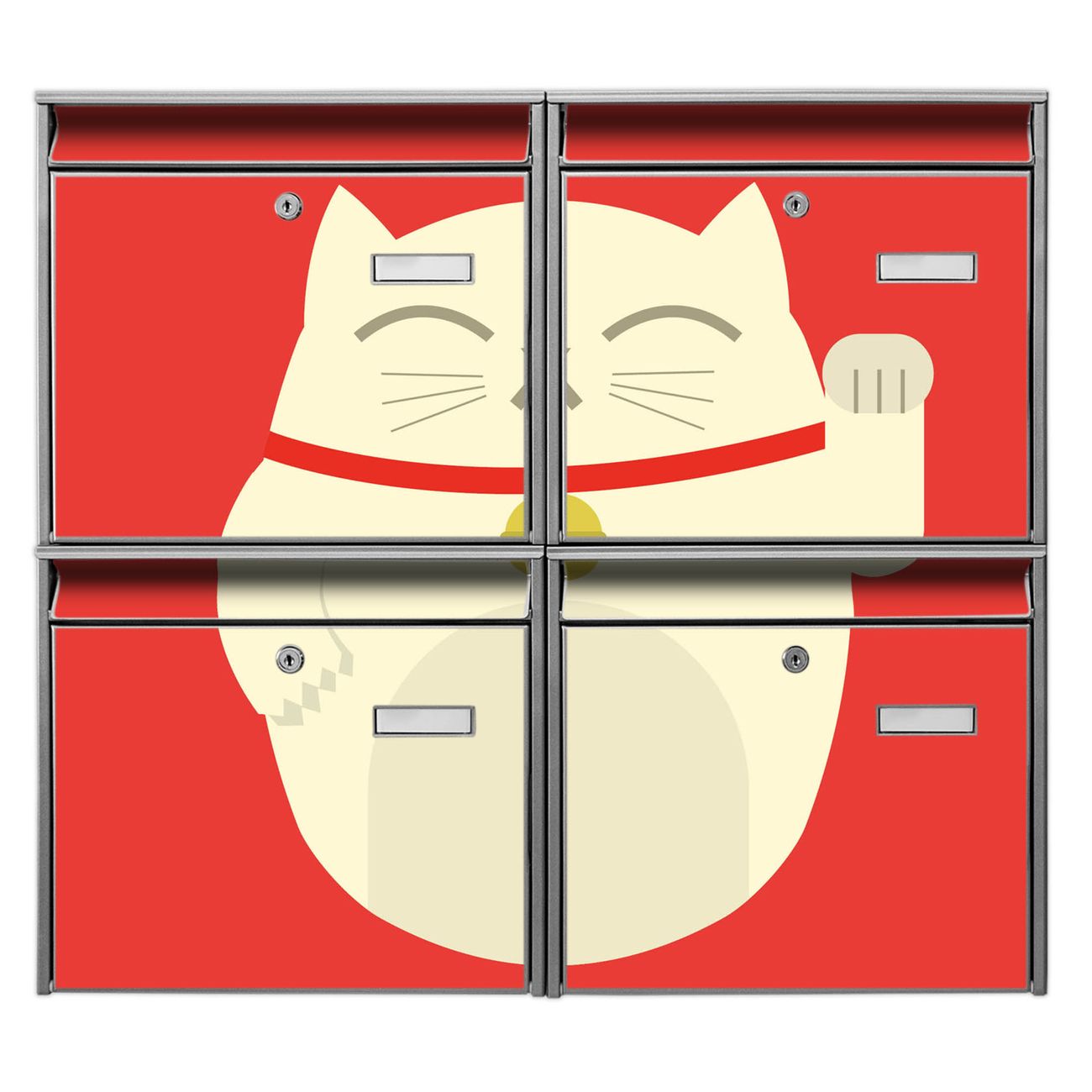 FUNKTION: Die Burg-Wächter Briefkastenanlage mit Motiv Manekineko bietet Ihnen ausreichend Fassungsvermögen um auch A4 und C4 Sendungen zu empfangen. Das integrierte Namensschild lässt sich individuell beschriften. Wählen Sie aus den Grundfarben weiß, silber und schwarz. DESIGN: Die 4 Briefkästen haben ein ansprechendes und zeitloses Design, ohne dabei auf Funktionalität zu verzichten. Das Material ist sehr stabil, wetterfest und rostfrei. Durch das Motiv Manekineko werden die Postkästen zu einem Blickfang. DETAILS: Die Postkästen bestehen aus verzinktem Stahl der zusätzlich mit Klarlack versiegelt wurde. Die Kästen sind gesamt 64,5cm hoch, 72,5cm breit und 10cm tief. Das Motiv besteht aus einer wetter- und UV-festen Folie, die Ihren Briefkasten zusätzlich vor Kratzern schützt. Die Postkästen werden mit Montagematerial, je einem Namensschild und je zwei Schlüsseln geliefert. NUTZEN: Das Briefkastenset eignet sich für die Wandmontage, die Größe bietet genügend Platz für Sendungen aller Art. Das zeitlose Design sowie die stabile Bauart bieten Ihnen einen treuen Begleiter für Ihre Post. BANJADO: