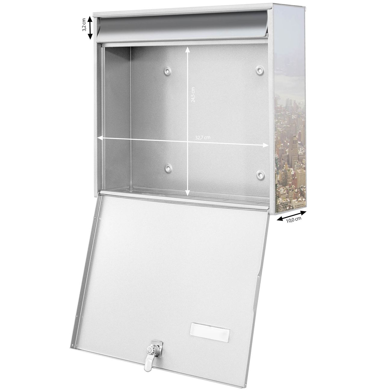FUNKTION: Die Burg-Wächter Briefkastenanlage mit Motiv Manhattan 1 bietet Ihnen ausreichend Fassungsvermögen um auch A4 und C4 Sendungen zu empfangen. Das integrierte Namensschild lässt sich individuell beschriften. Wählen Sie aus den Grundfarben weiß, silber und schwarz. DESIGN: Die 4 Briefkästen haben ein ansprechendes und zeitloses Design, ohne dabei auf Funktionalität zu verzichten. Das Material ist sehr stabil, wetterfest und rostfrei. Durch das Motiv Manhattan 1 werden die Postkästen zu einem Blickfang. DETAILS: Die Postkästen bestehen aus verzinktem Stahl der zusätzlich mit Klarlack versiegelt wurde. Die Kästen sind gesamt 64,5cm hoch, 72,5cm breit und 10cm tief. Das Motiv besteht aus einer wetter- und UV-festen Folie, die Ihren Briefkasten zusätzlich vor Kratzern schützt. Die Postkästen werden mit Montagematerial, je einem Namensschild und je zwei Schlüsseln geliefert. NUTZEN: Das Briefkastenset eignet sich für die Wandmontage, die Größe bietet genügend Platz für Sendungen aller Art. Das zeitlose Design sowie die stabile Bauart bieten Ihnen einen treuen Begleiter für Ihre Post. BANJADO: