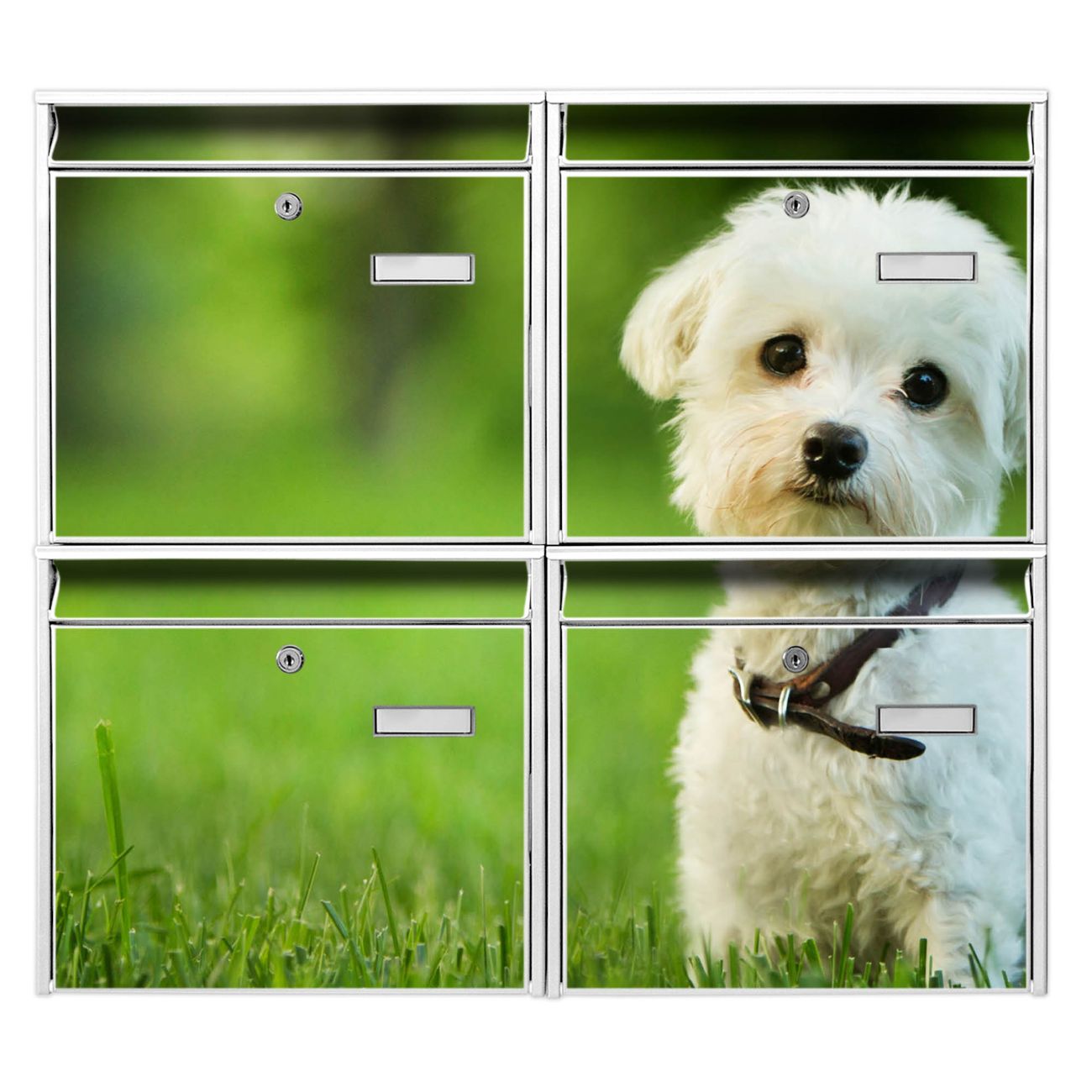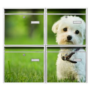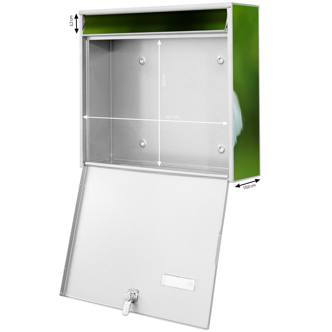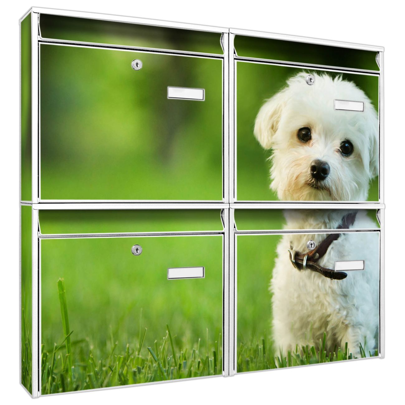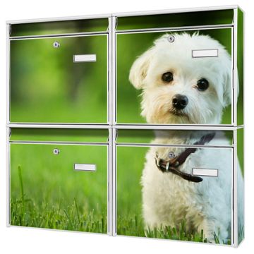 FUNKTION: Die Burg-Wächter Briefkastenanlage mit Motiv Mareike bietet Ihnen ausreichend Fassungsvermögen um auch A4 und C4 Sendungen zu empfangen. Das integrierte Namensschild lässt sich individuell beschriften. Wählen Sie aus den Grundfarben weiß, silber und schwarz. DESIGN: Die 4 Briefkästen haben ein ansprechendes und zeitloses Design, ohne dabei auf Funktionalität zu verzichten. Das Material ist sehr stabil, wetterfest und rostfrei. Durch das Motiv Mareike werden die Postkästen zu einem Blickfang. DETAILS: Die Postkästen bestehen aus verzinktem Stahl der zusätzlich mit Klarlack versiegelt wurde. Die Kästen sind gesamt 64,5cm hoch, 72,5cm breit und 10cm tief. Das Motiv besteht aus einer wetter- und UV-festen Folie, die Ihren Briefkasten zusätzlich vor Kratzern schützt. Die Postkästen werden mit Montagematerial, je einem Namensschild und je zwei Schlüsseln geliefert. NUTZEN: Das Briefkastenset eignet sich für die Wandmontage, die Größe bietet genügend Platz für Sendungen aller Art. Das zeitlose Design sowie die stabile Bauart bieten Ihnen einen treuen Begleiter für Ihre Post. BANJADO: