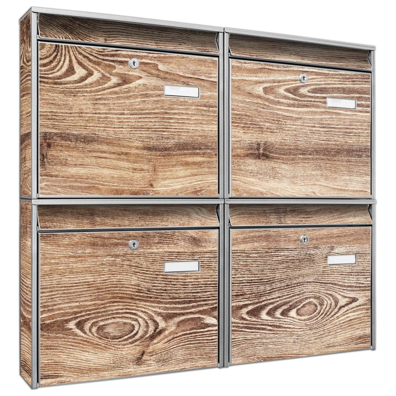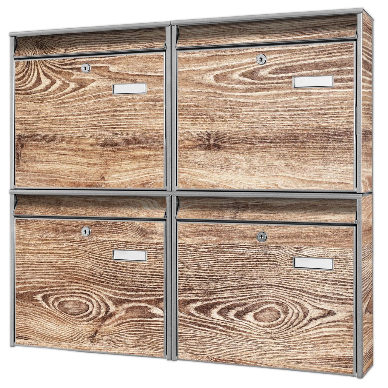 FUNKTION: Die Burg-Wächter Briefkastenanlage mit Motiv Maserung bietet Ihnen ausreichend Fassungsvermögen um auch A4 und C4 Sendungen zu empfangen. Das integrierte Namensschild lässt sich individuell beschriften. Wählen Sie aus den Grundfarben weiß, silber und schwarz. DESIGN: Die 4 Briefkästen haben ein ansprechendes und zeitloses Design, ohne dabei auf Funktionalität zu verzichten. Das Material ist sehr stabil, wetterfest und rostfrei. Durch das Motiv Maserung werden die Postkästen zu einem Blickfang. DETAILS: Die Postkästen bestehen aus verzinktem Stahl der zusätzlich mit Klarlack versiegelt wurde. Die Kästen sind gesamt 64,5cm hoch, 72,5cm breit und 10cm tief. Das Motiv besteht aus einer wetter- und UV-festen Folie, die Ihren Briefkasten zusätzlich vor Kratzern schützt. Die Postkästen werden mit Montagematerial, je einem Namensschild und je zwei Schlüsseln geliefert. NUTZEN: Das Briefkastenset eignet sich für die Wandmontage, die Größe bietet genügend Platz für Sendungen aller Art. Das zeitlose Design sowie die stabile Bauart bieten Ihnen einen treuen Begleiter für Ihre Post. BANJADO: