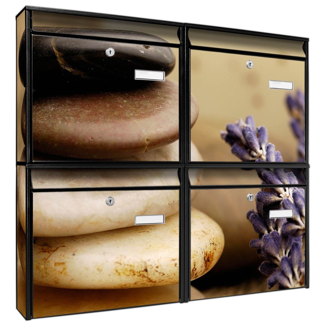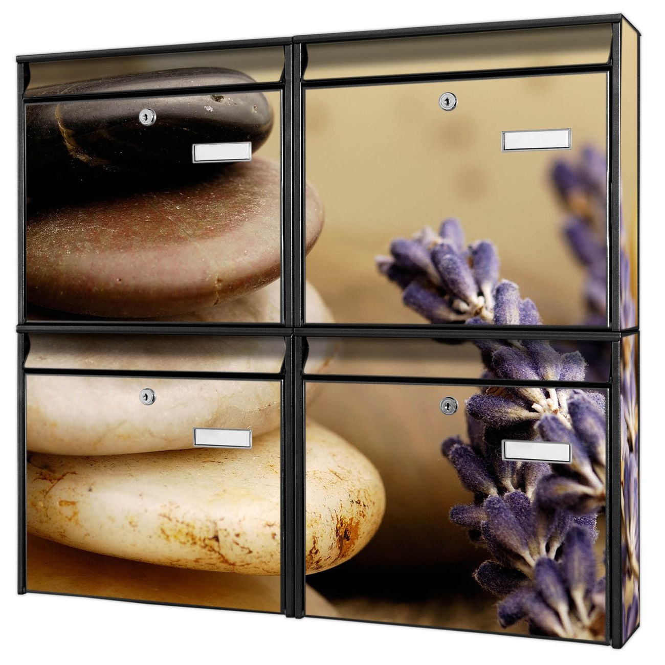 FUNKTION: Die Burg-Wächter Briefkastenanlage mit Motiv Meditation bietet Ihnen ausreichend Fassungsvermögen um auch A4 und C4 Sendungen zu empfangen. Das integrierte Namensschild lässt sich individuell beschriften. Wählen Sie aus den Grundfarben weiß, silber und schwarz. DESIGN: Die 4 Briefkästen haben ein ansprechendes und zeitloses Design, ohne dabei auf Funktionalität zu verzichten. Das Material ist sehr stabil, wetterfest und rostfrei. Durch das Motiv Meditation werden die Postkästen zu einem Blickfang. DETAILS: Die Postkästen bestehen aus verzinktem Stahl der zusätzlich mit Klarlack versiegelt wurde. Die Kästen sind gesamt 64,5cm hoch, 72,5cm breit und 10cm tief. Das Motiv besteht aus einer wetter- und UV-festen Folie, die Ihren Briefkasten zusätzlich vor Kratzern schützt. Die Postkästen werden mit Montagematerial, je einem Namensschild und je zwei Schlüsseln geliefert. NUTZEN: Das Briefkastenset eignet sich für die Wandmontage, die Größe bietet genügend Platz für Sendungen aller Art. Das zeitlose Design sowie die stabile Bauart bieten Ihnen einen treuen Begleiter für Ihre Post. BANJADO: