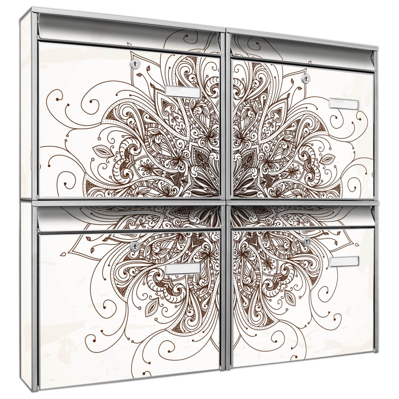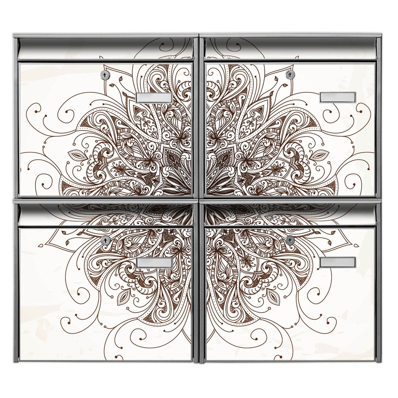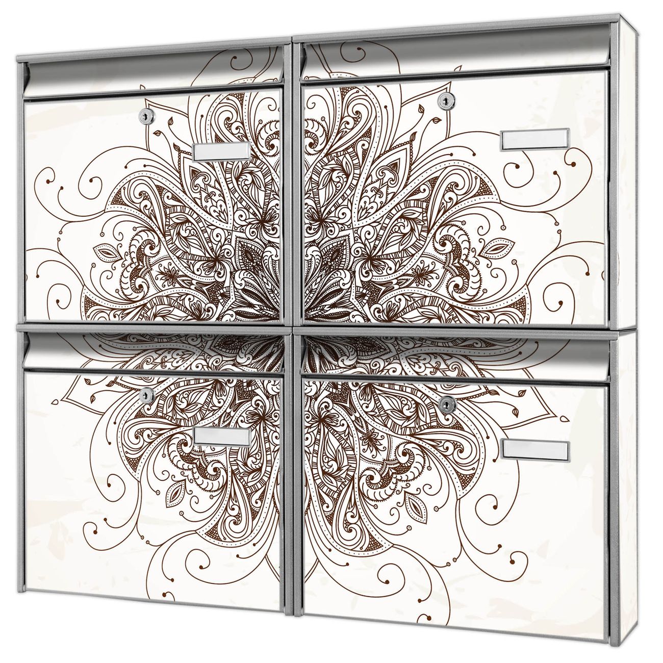 FUNKTION: Die Burg-Wächter Briefkastenanlage mit Motiv Mehendi bietet Ihnen ausreichend Fassungsvermögen um auch A4 und C4 Sendungen zu empfangen. Das integrierte Namensschild lässt sich individuell beschriften. Wählen Sie aus den Grundfarben weiß, silber und schwarz. DESIGN: Die 4 Briefkästen haben ein ansprechendes und zeitloses Design, ohne dabei auf Funktionalität zu verzichten. Das Material ist sehr stabil, wetterfest und rostfrei. Durch das Motiv Mehendi werden die Postkästen zu einem Blickfang. DETAILS: Die Postkästen bestehen aus verzinktem Stahl der zusätzlich mit Klarlack versiegelt wurde. Die Kästen sind gesamt 64,5cm hoch, 72,5cm breit und 10cm tief. Das Motiv besteht aus einer wetter- und UV-festen Folie, die Ihren Briefkasten zusätzlich vor Kratzern schützt. Die Postkästen werden mit Montagematerial, je einem Namensschild und je zwei Schlüsseln geliefert. NUTZEN: Das Briefkastenset eignet sich für die Wandmontage, die Größe bietet genügend Platz für Sendungen aller Art. Das zeitlose Design sowie die stabile Bauart bieten Ihnen einen treuen Begleiter für Ihre Post. BANJADO: