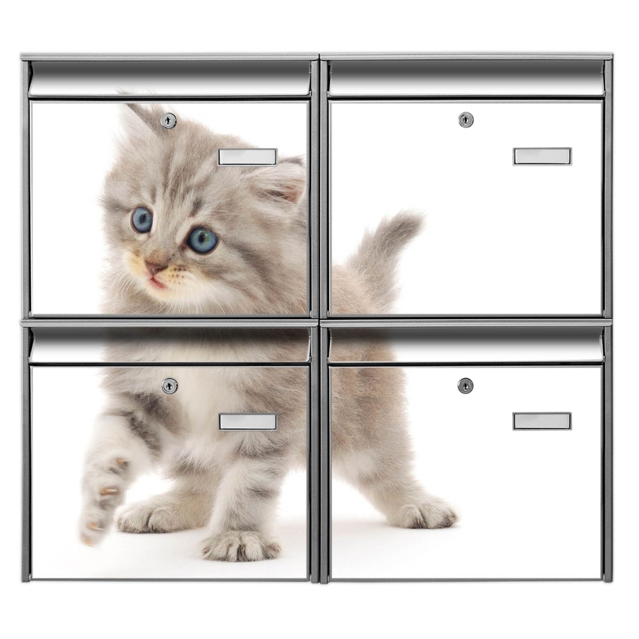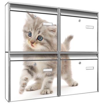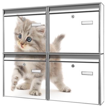 FUNKTION: Die Burg-Wächter Briefkastenanlage mit Motiv Miau bietet Ihnen ausreichend Fassungsvermögen um auch A4 und C4 Sendungen zu empfangen. Das integrierte Namensschild lässt sich individuell beschriften. Wählen Sie aus den Grundfarben weiß, silber und schwarz. DESIGN: Die 4 Briefkästen haben ein ansprechendes und zeitloses Design, ohne dabei auf Funktionalität zu verzichten. Das Material ist sehr stabil, wetterfest und rostfrei. Durch das Motiv Miau werden die Postkästen zu einem Blickfang. DETAILS: Die Postkästen bestehen aus verzinktem Stahl der zusätzlich mit Klarlack versiegelt wurde. Die Kästen sind gesamt 64,5cm hoch, 72,5cm breit und 10cm tief. Das Motiv besteht aus einer wetter- und UV-festen Folie, die Ihren Briefkasten zusätzlich vor Kratzern schützt. Die Postkästen werden mit Montagematerial, je einem Namensschild und je zwei Schlüsseln geliefert. NUTZEN: Das Briefkastenset eignet sich für die Wandmontage, die Größe bietet genügend Platz für Sendungen aller Art. Das zeitlose Design sowie die stabile Bauart bieten Ihnen einen treuen Begleiter für Ihre Post. BANJADO: