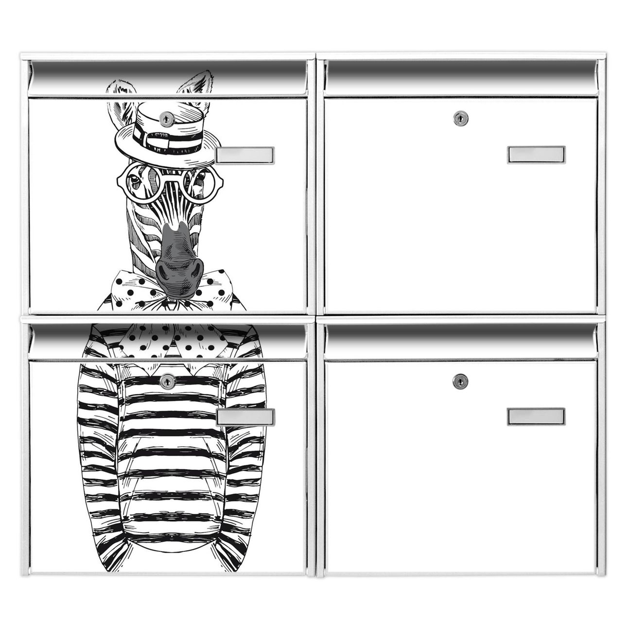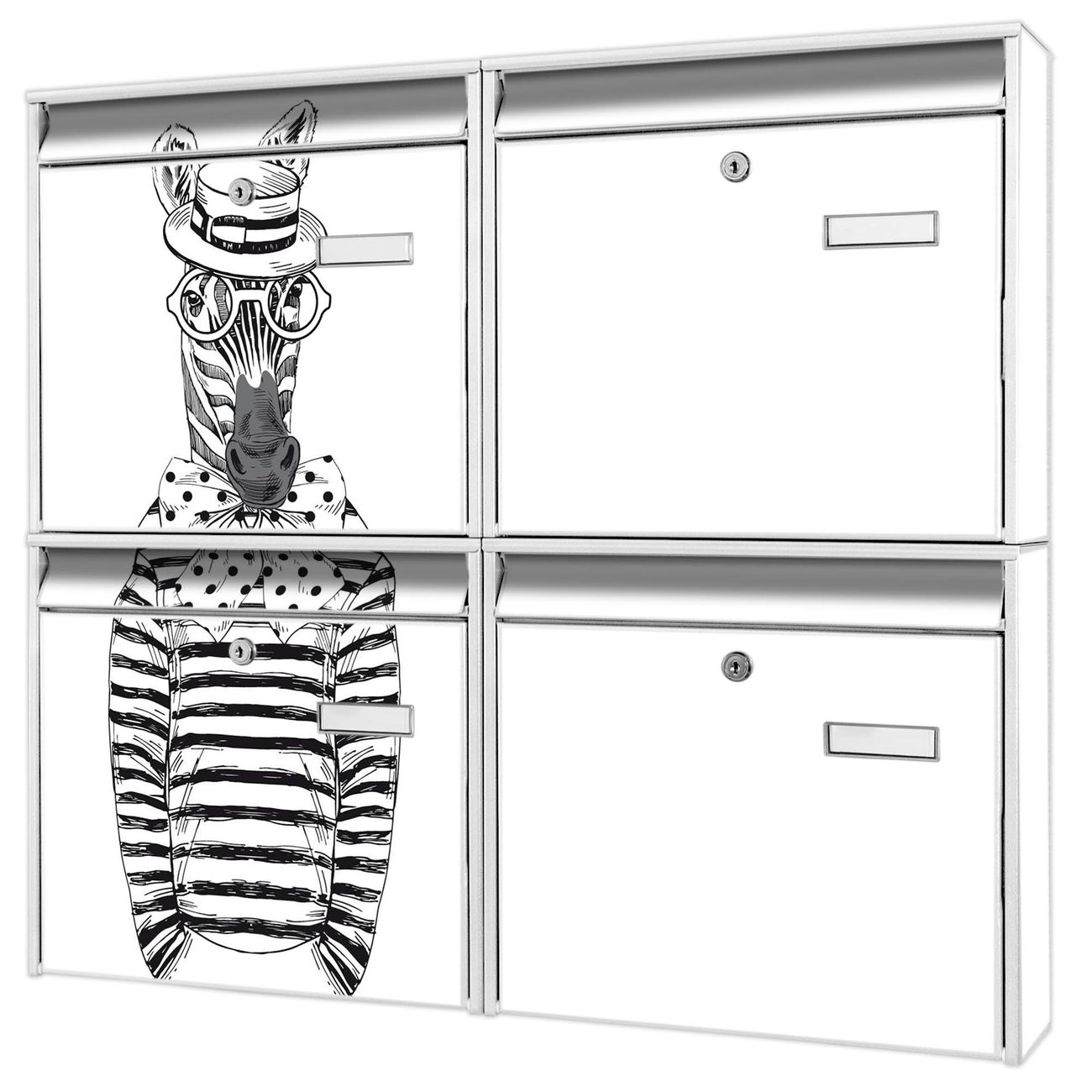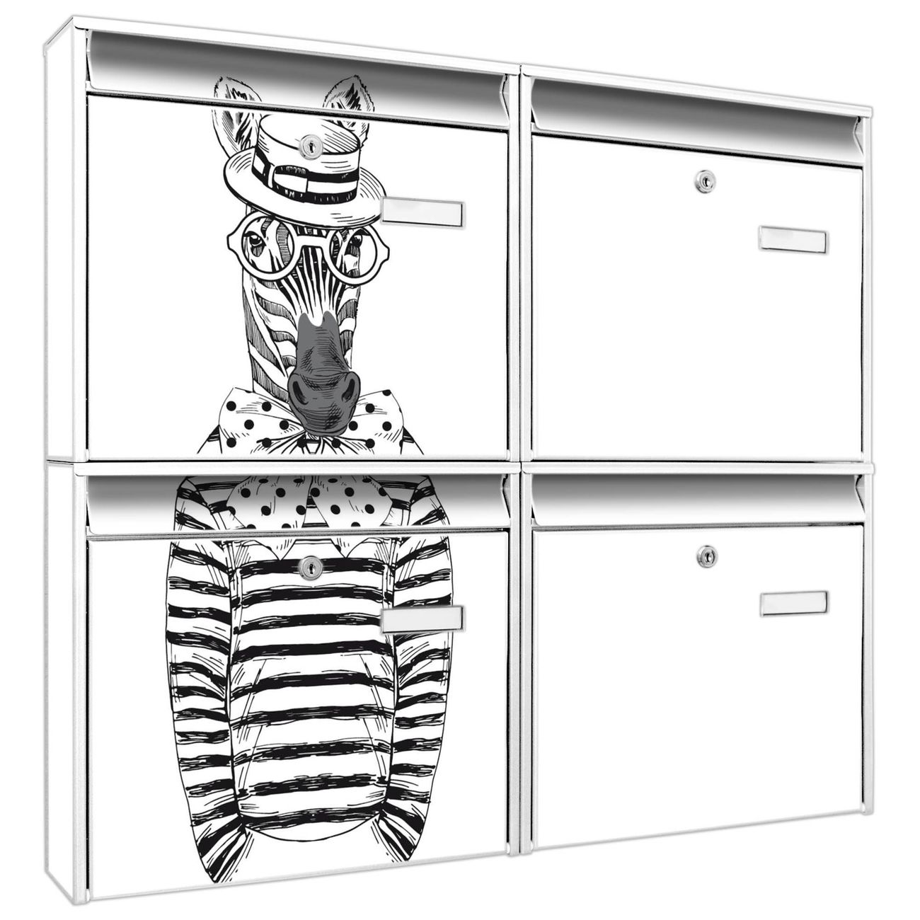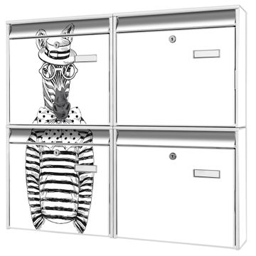 FUNKTION: Die Burg-Wächter Briefkastenanlage mit Motiv Michael Stripes bietet Ihnen ausreichend Fassungsvermögen um auch A4 und C4 Sendungen zu empfangen. Das integrierte Namensschild lässt sich individuell beschriften. Wählen Sie aus den Grundfarben weiß, silber und schwarz. DESIGN: Die 4 Briefkästen haben ein ansprechendes und zeitloses Design, ohne dabei auf Funktionalität zu verzichten. Das Material ist sehr stabil, wetterfest und rostfrei. Durch das Motiv Michael Stripes werden die Postkästen zu einem Blickfang. DETAILS: Die Postkästen bestehen aus verzinktem Stahl der zusätzlich mit Klarlack versiegelt wurde. Die Kästen sind gesamt 64,5cm hoch, 72,5cm breit und 10cm tief. Das Motiv besteht aus einer wetter- und UV-festen Folie, die Ihren Briefkasten zusätzlich vor Kratzern schützt. Die Postkästen werden mit Montagematerial, je einem Namensschild und je zwei Schlüsseln geliefert. NUTZEN: Das Briefkastenset eignet sich für die Wandmontage, die Größe bietet genügend Platz für Sendungen aller Art. Das zeitlose Design sowie die stabile Bauart bieten Ihnen einen treuen Begleiter für Ihre Post. BANJADO: